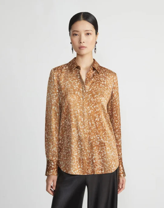 LAFAYETTE 148 Floating Leaves Print Textured Silk Satin Button Shirt