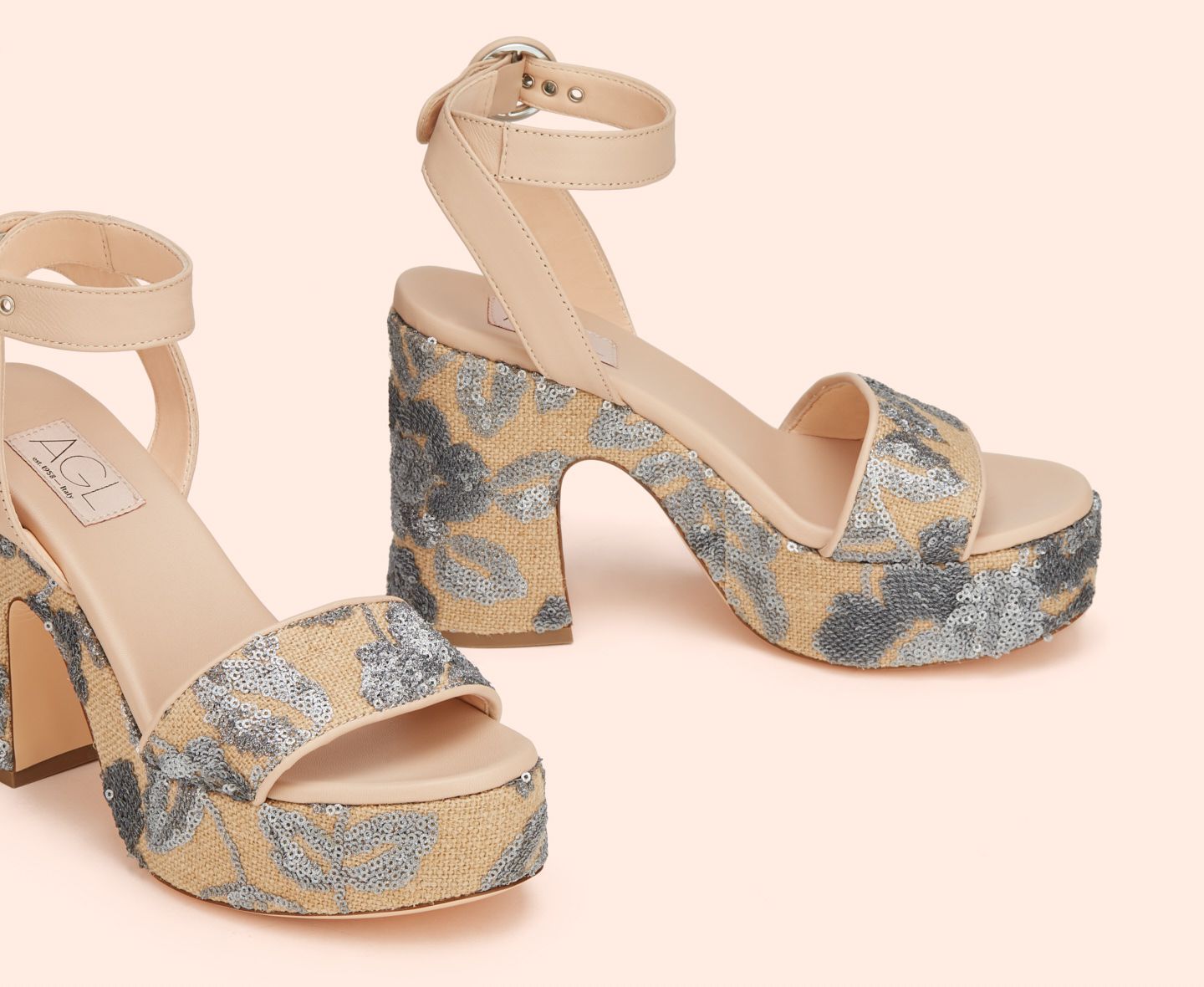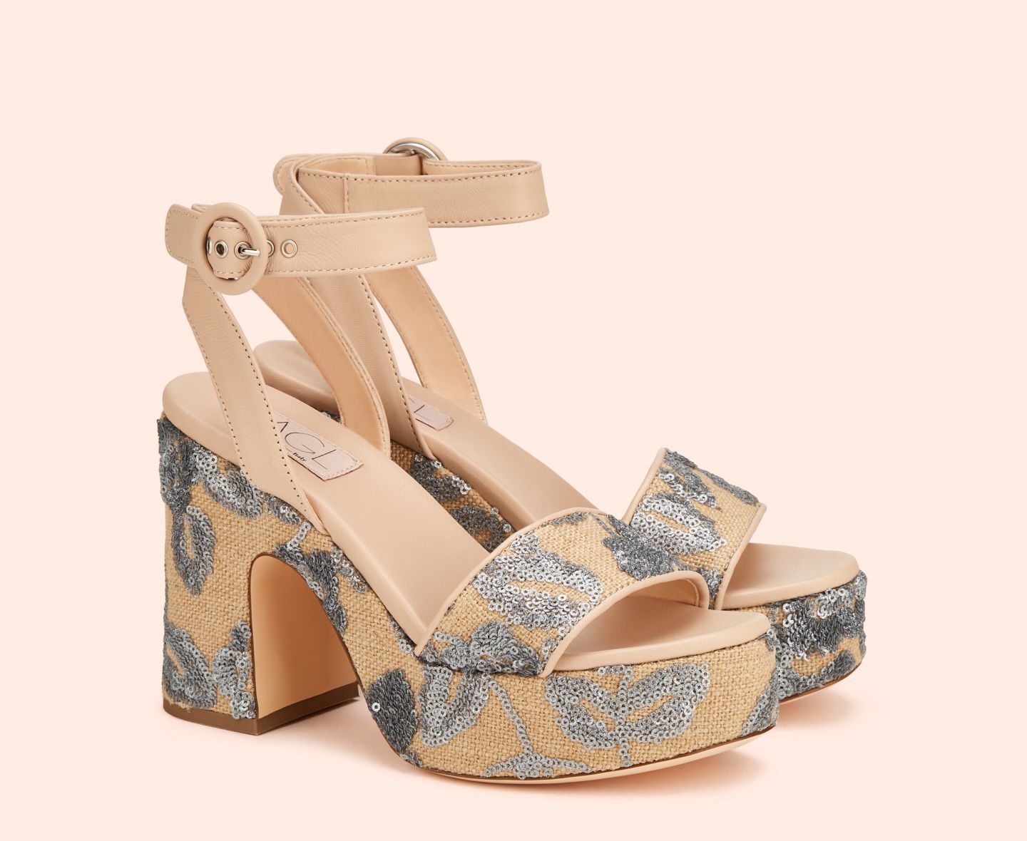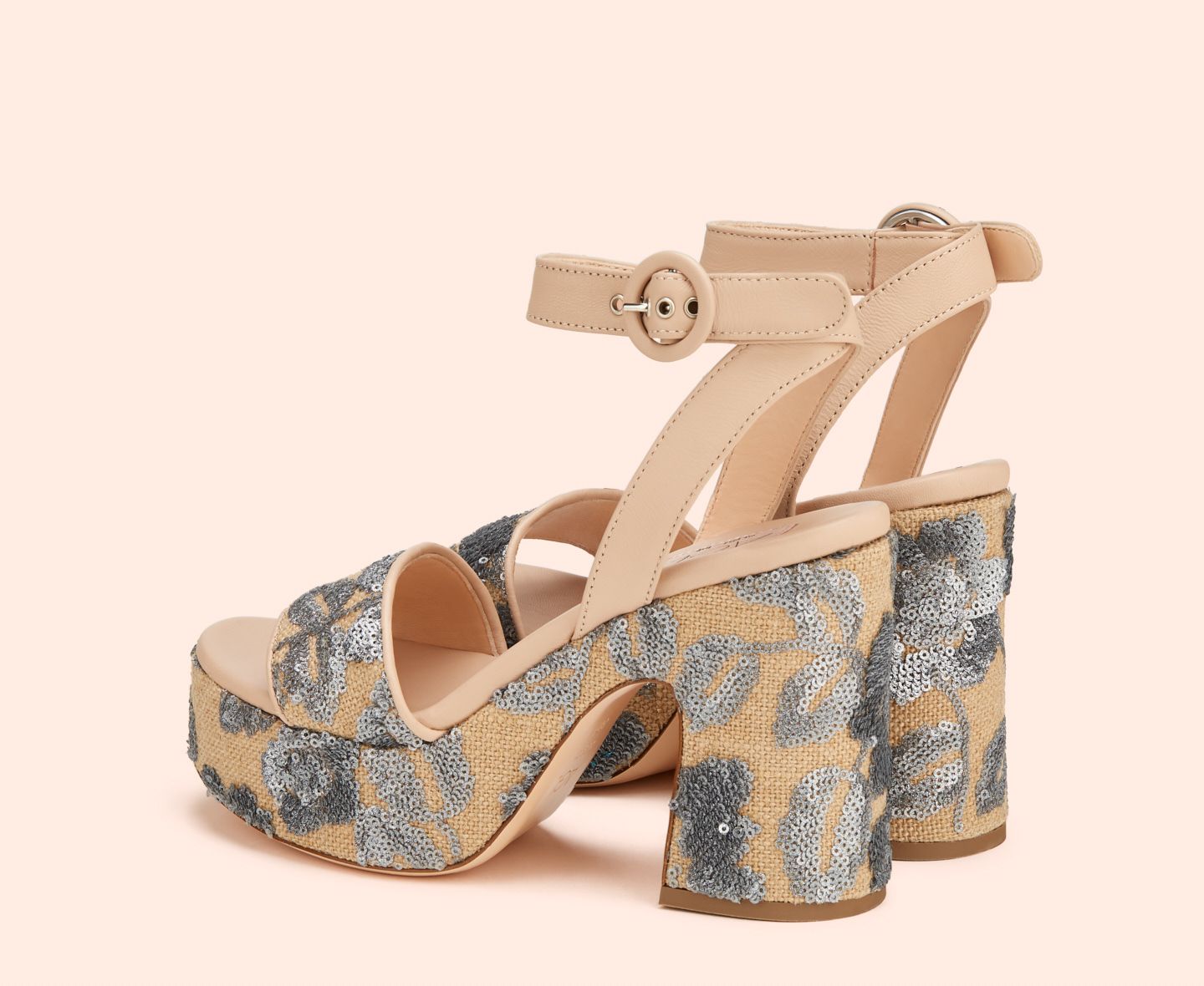 The BABE sandal is made of jute with floral embroidery including glittering micro sequins. The same precious, summery material also covers the 60s-look heel and platform
