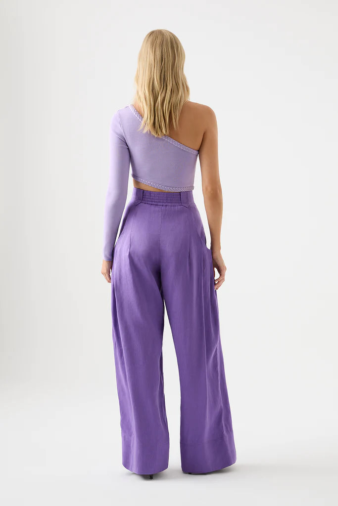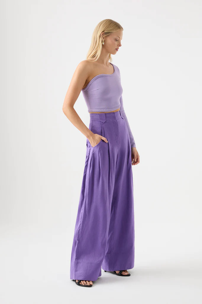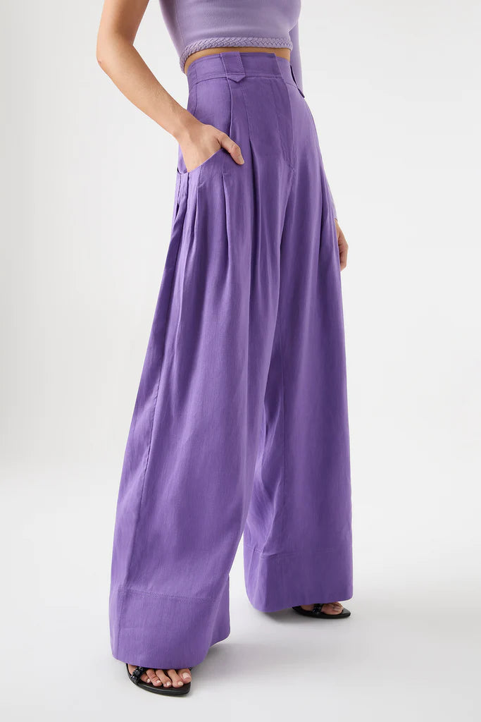 "A reimagining of an archival Aje style, this women’s pant features an exaggerated flare silhouette, front-to-back wrapped pockets and sculptural leg pleats."