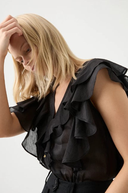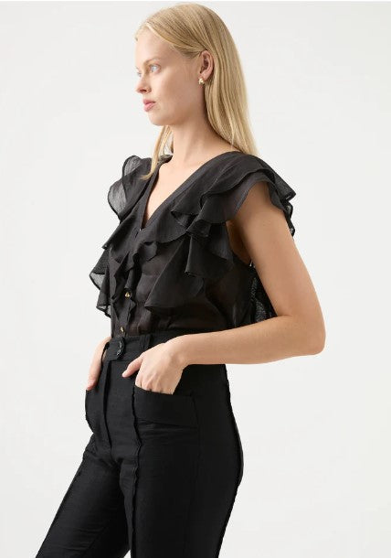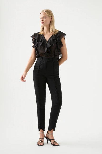 "Cut from a linen silk blend, this relaxed tank oozes sophistication with a V-neckline and frills throughout. Pair with wide leg trousers or an A-line skirt for your next daytime look."
