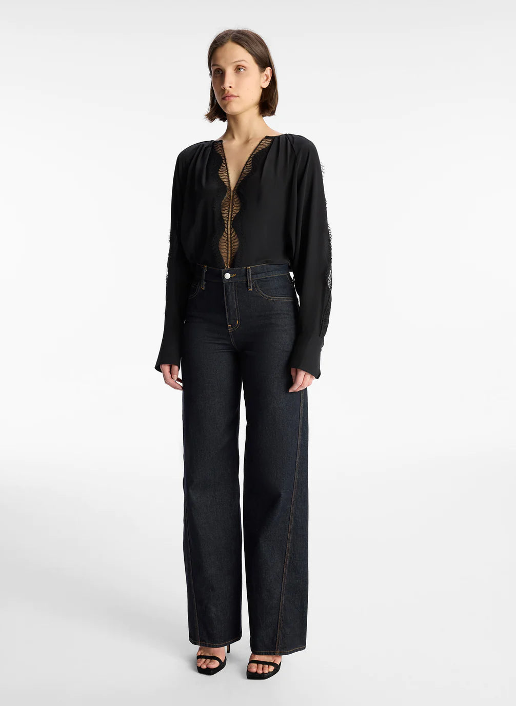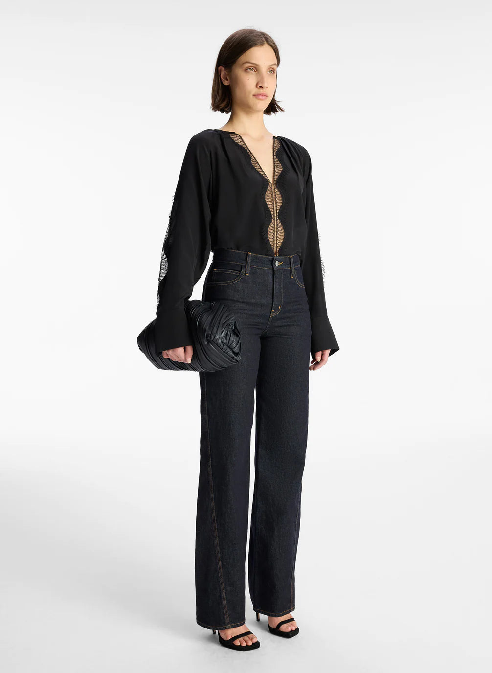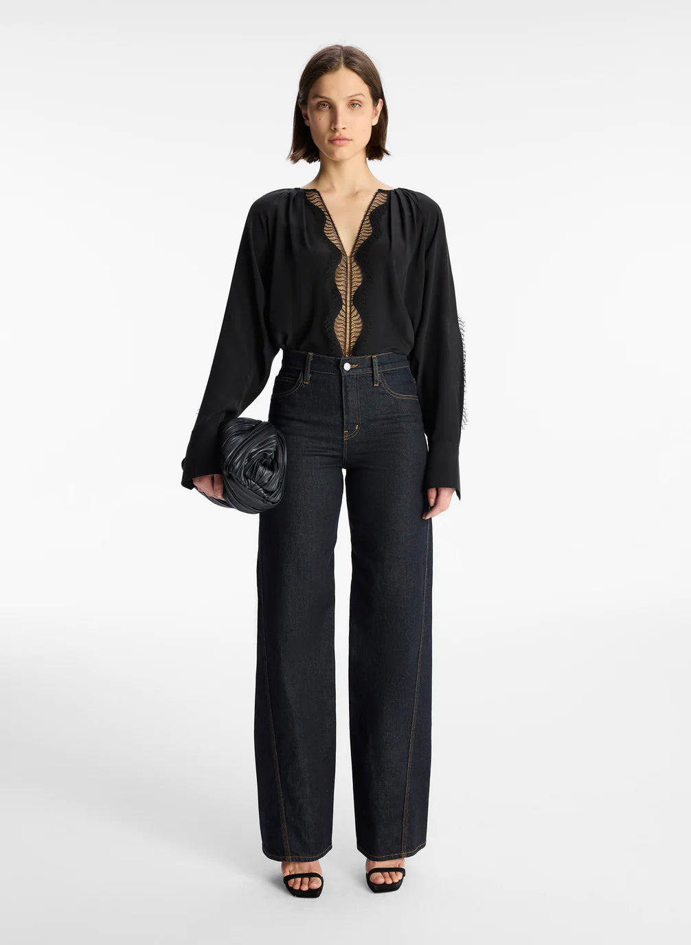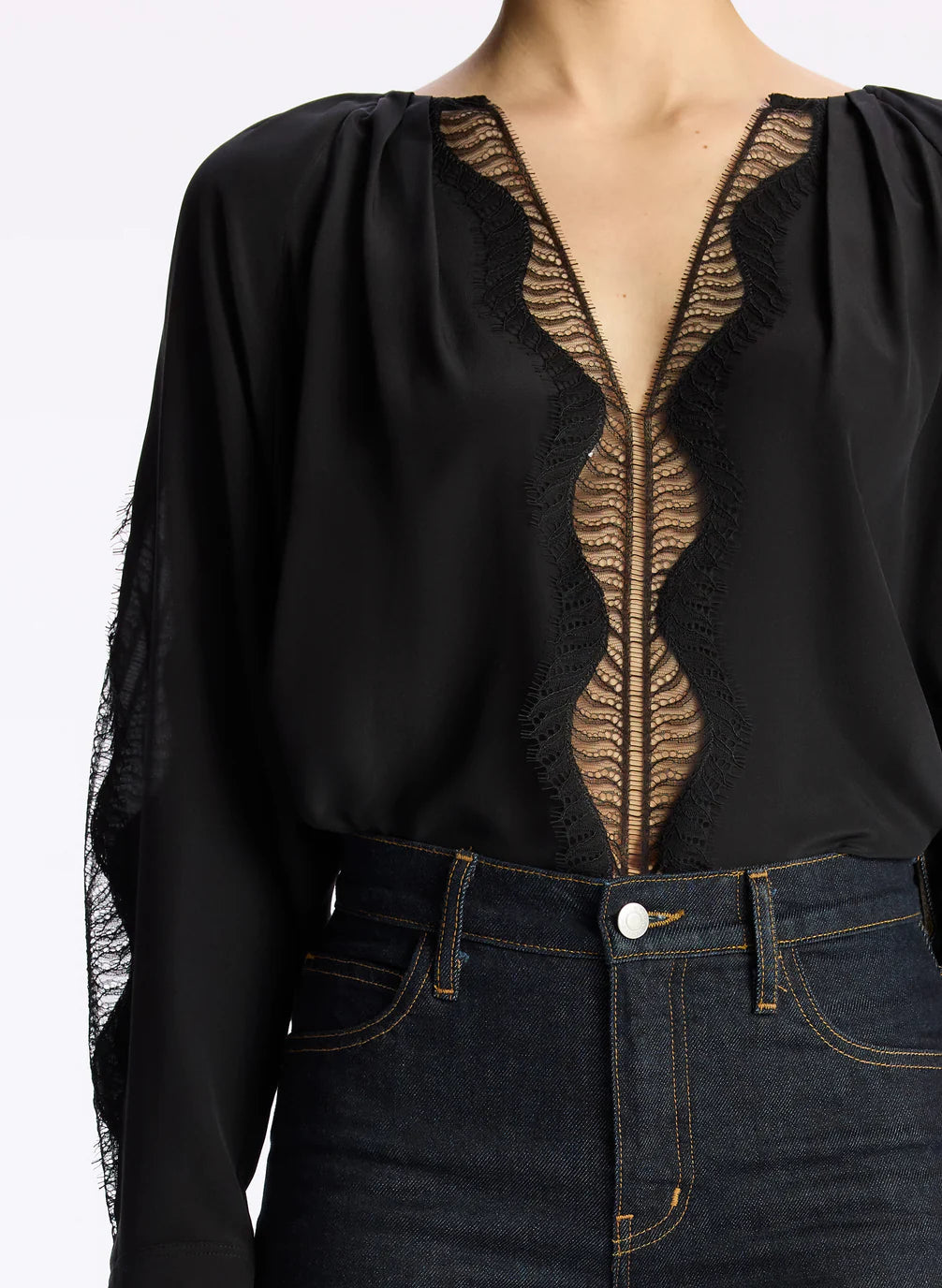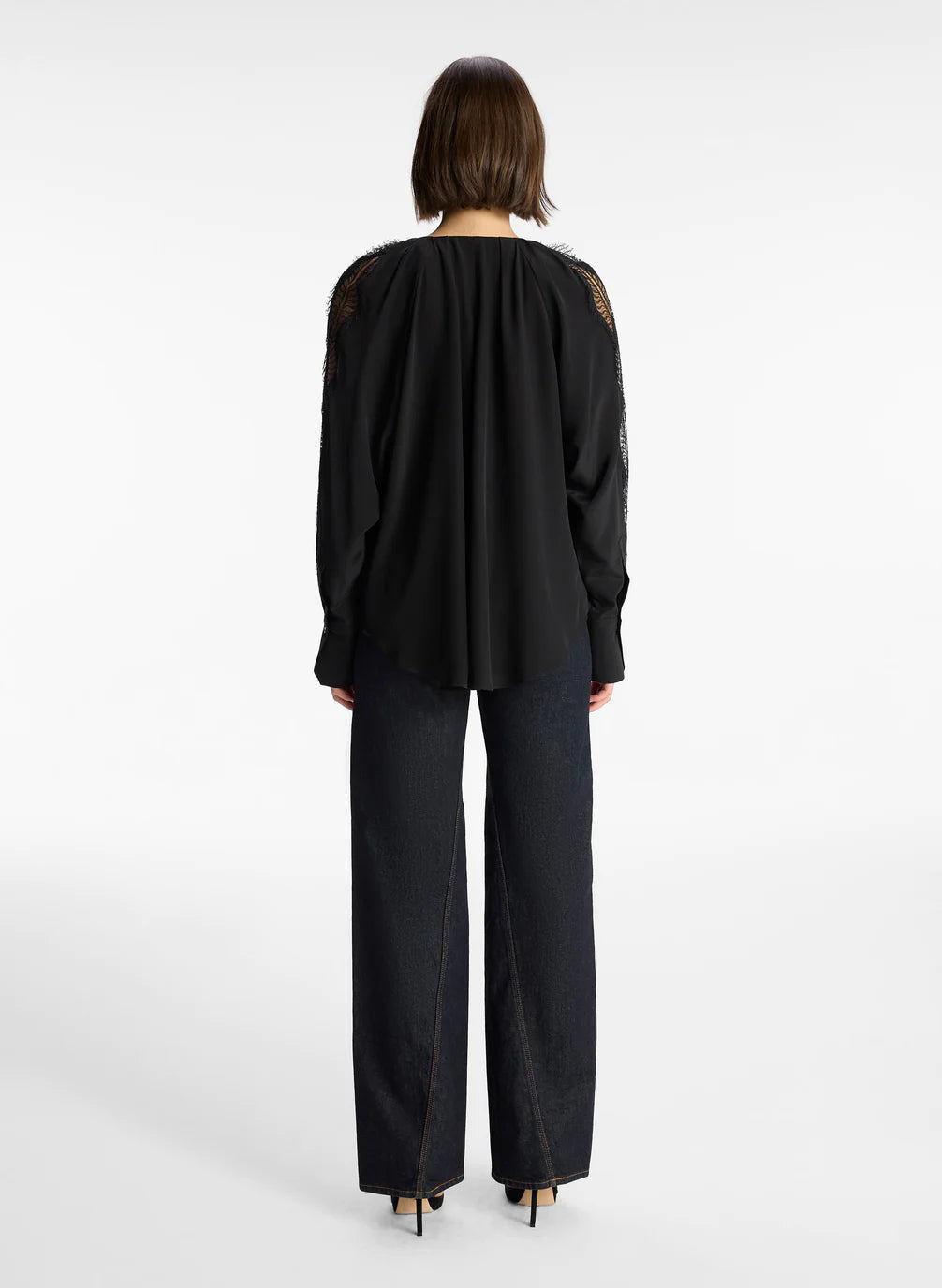The Carlota Top is crafted of our solid stretch silk fabric in timeless black. This pleated silhouette features a V-neckline and long sleeves trimmed with delicate eyelash lace. Single-button cuffs complete the look.