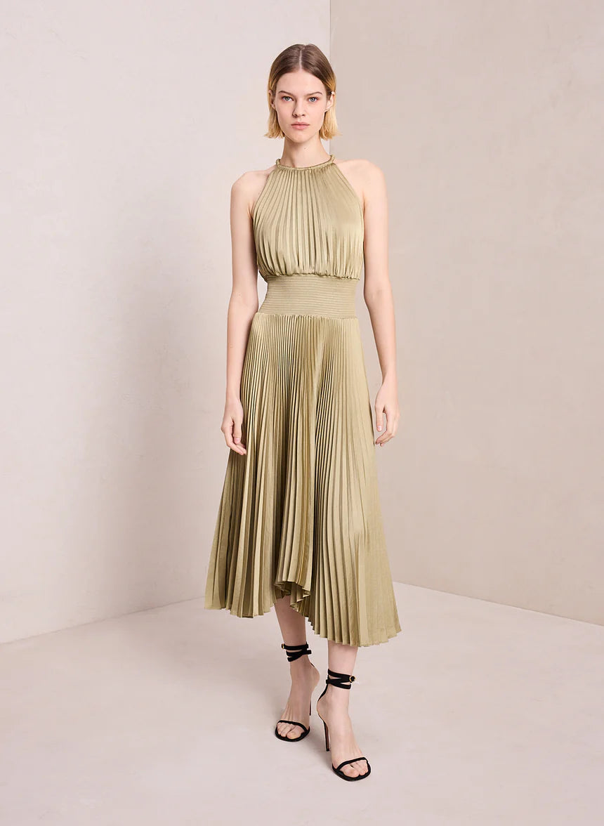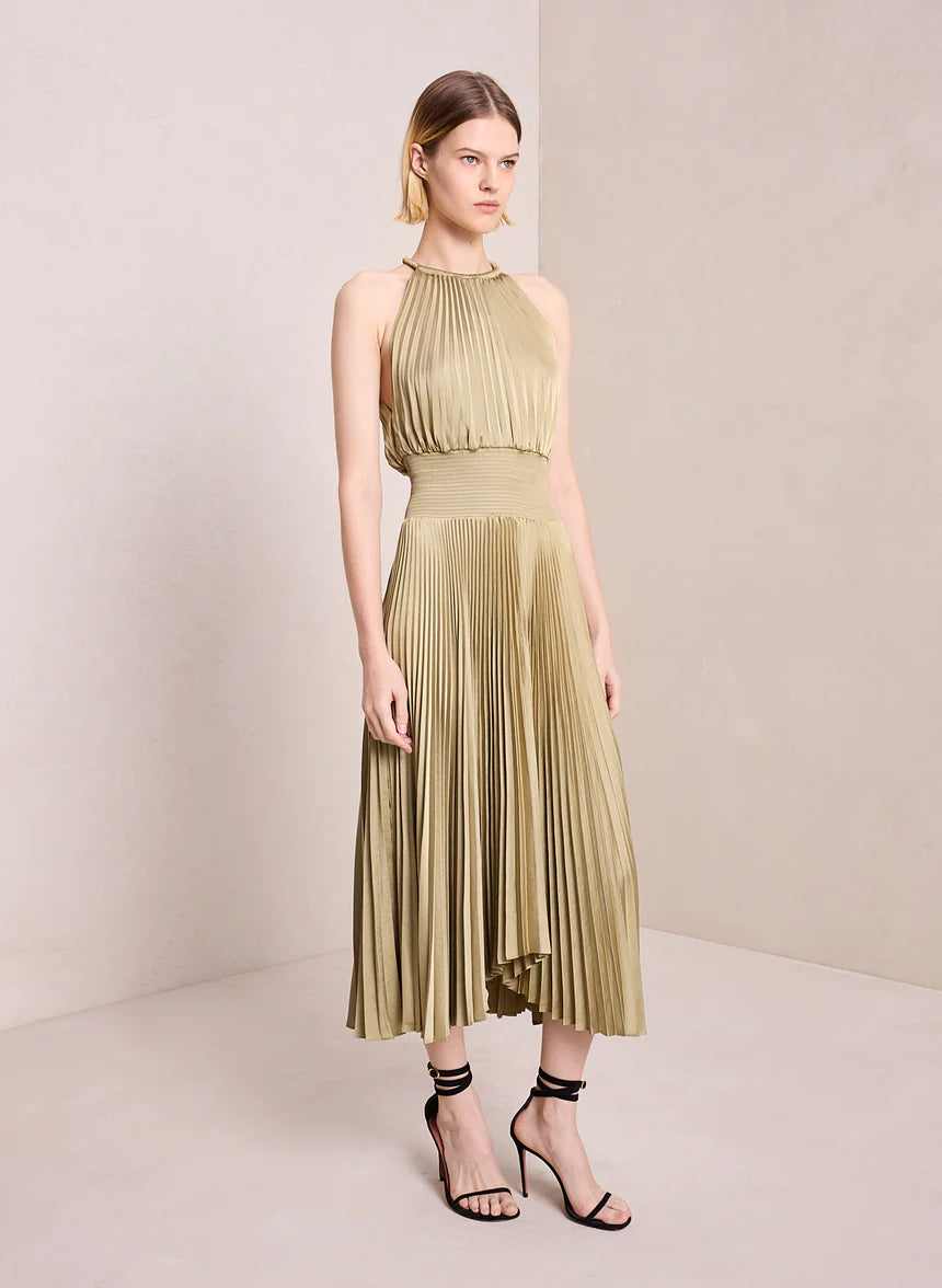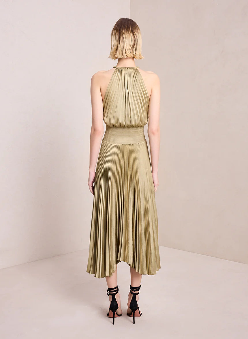 The Renzo II Dress is crafted from our elegant vintage satin in a pale, muted green. This signature pleated midi silhouette features a slim corded halter neckline, a smocked waist, and an asymmetric hemline.