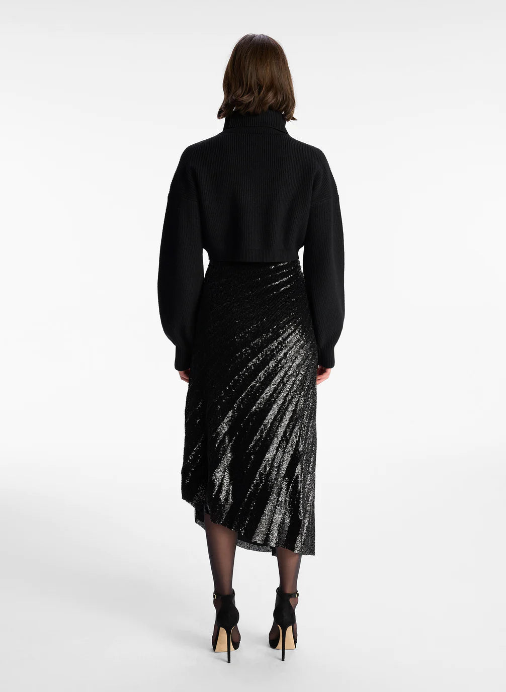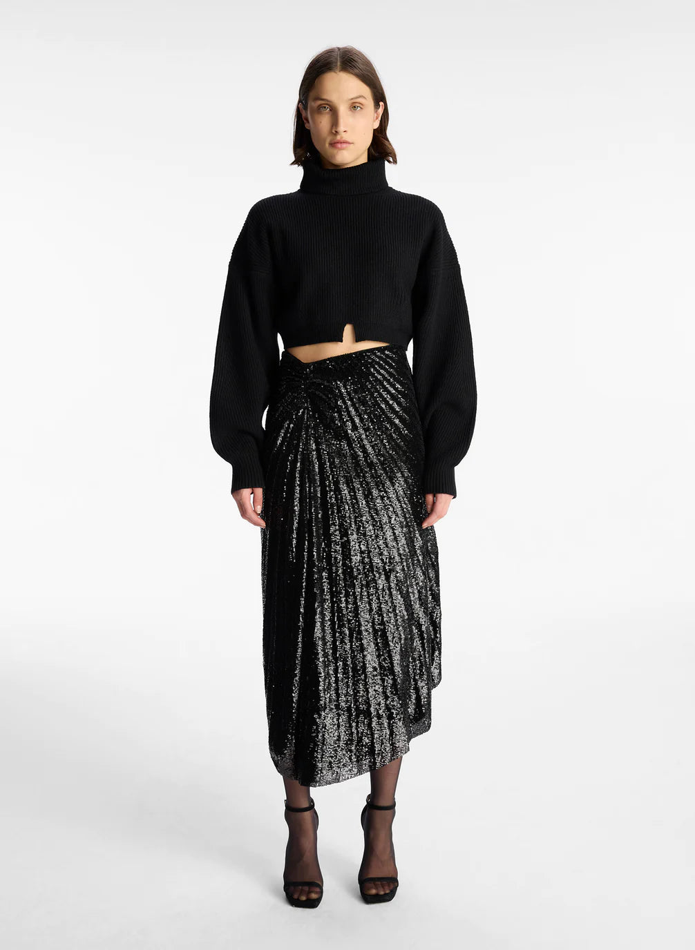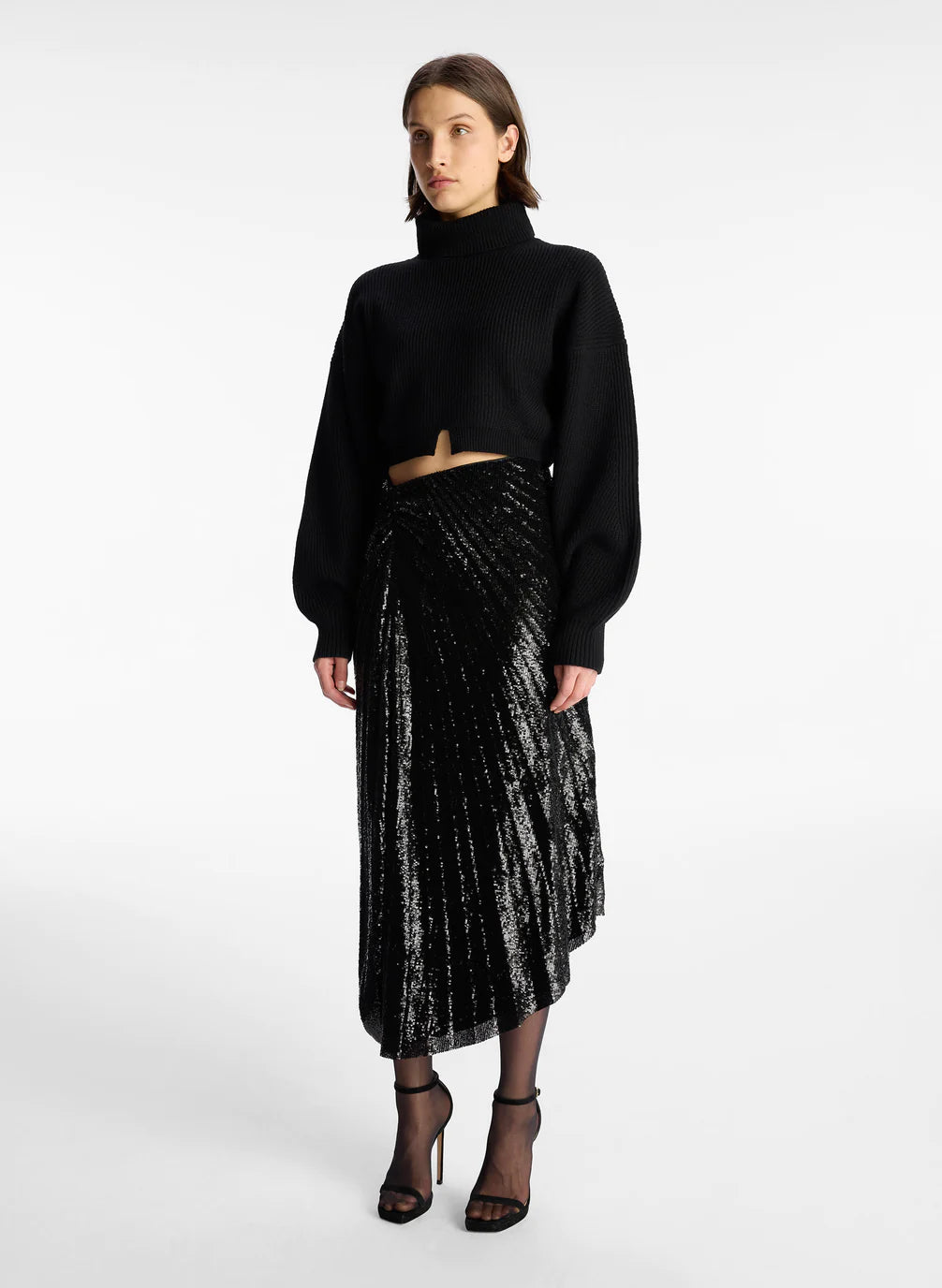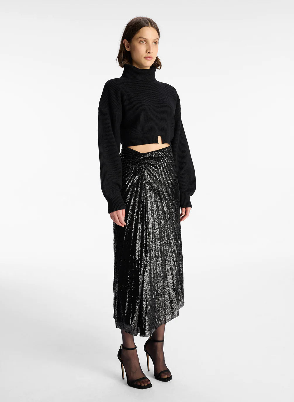 The Tori Skirt is crafted of shimmering sequins in timeless black. This midi silhouette features an asymmetrical hem with starburst pleating and ruched detailing at the hip.