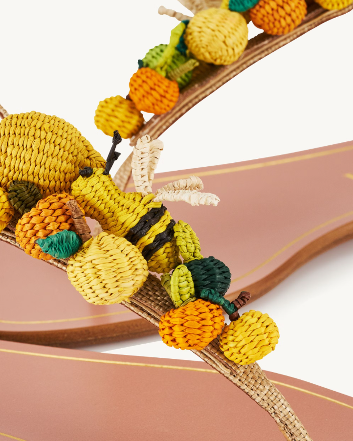 Perfect for garden parties and sunset soire'es, our Citrus Punch Sandals are crafted from woven raffia, beautifully lightweight and breathable. The understated T-strap design fastens at the ankle with an adjustable metal buckle and features a playful tropical motif that instantly evokes summer.