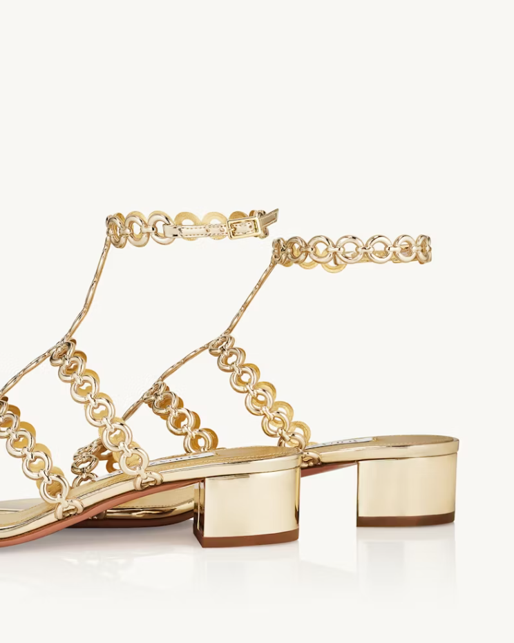 Precious and perfectly practical – the Infinity Chain Sandals are expertly crafted from gold mirrored leather that matches the jewel-like metallic detailing. They have comfortable 35 mm block heels for a little elevation and adjustable ankle straps, allowing you to find the perfect fit.