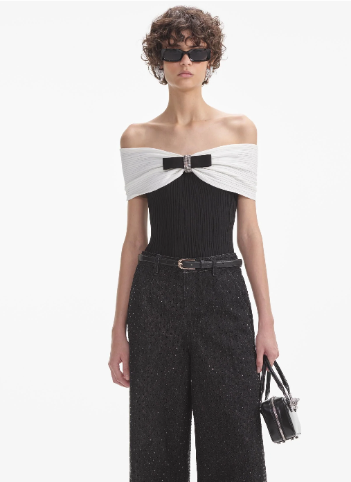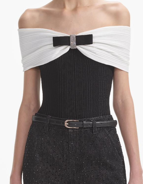 A feminine play on men's tailoring, this top is crafted with ribbed viscose knit for a sculpted feel. Show off its bow-topped, off-shoulder contrast neckline with our statement earrings.