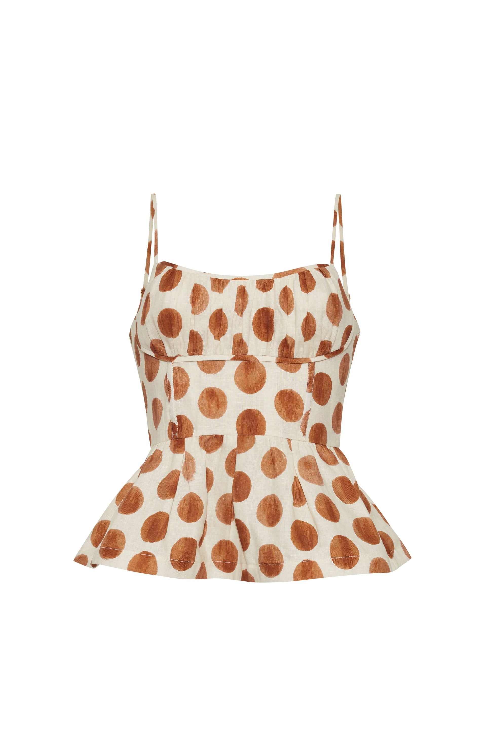 • Fit-and-flare peplum spaghetti top with adjustable straps and ruched bodice