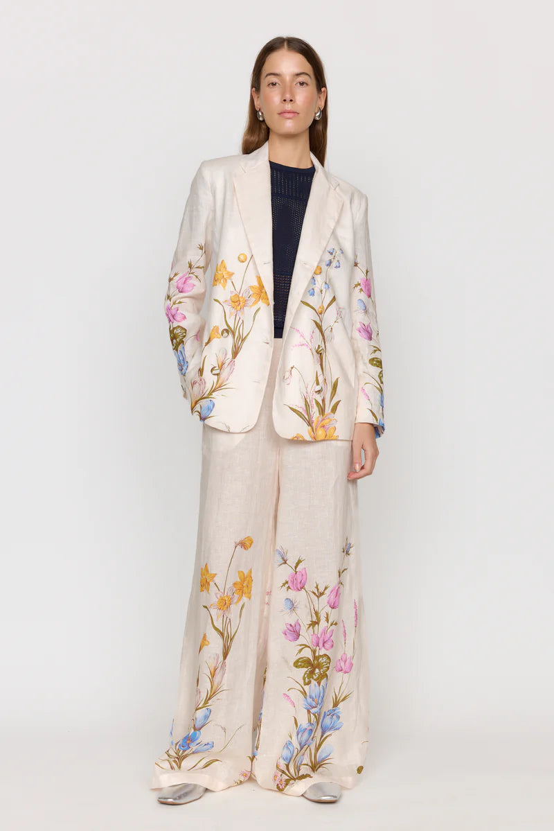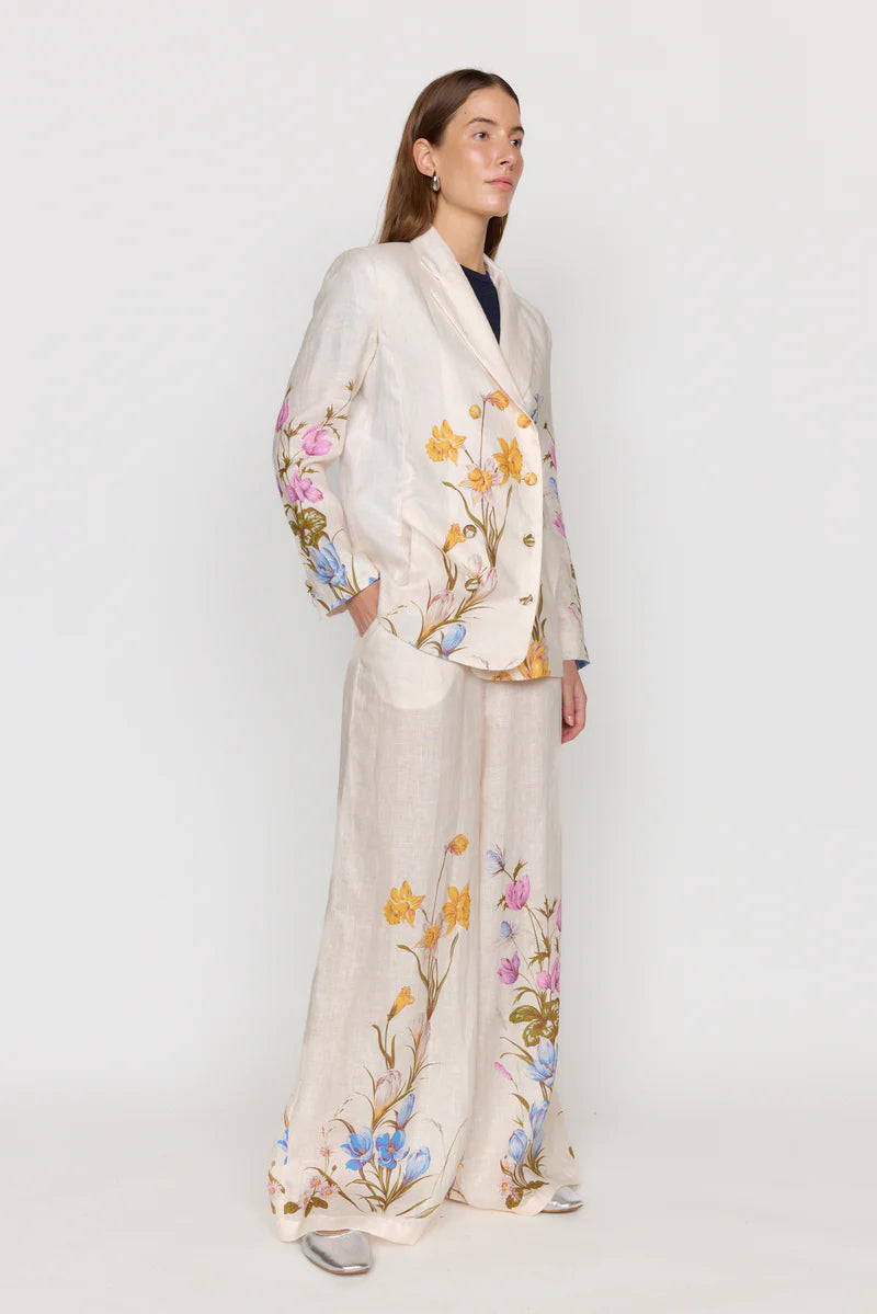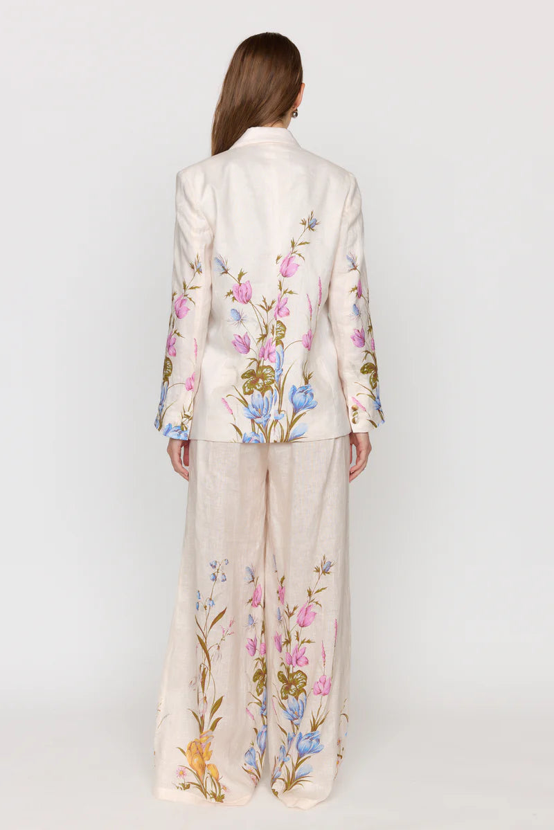 Elevate your wardrobe with this sophisticated linen blazer, featuring a tailored yet oversized fit. Crafted from lightweight and breathable linen, this blazer offers a perfect blend of comfort with the feminine florals of a signature Christy Lynn look. She features self-covered buttons at the sleeve cuffs and the body with pockets at the sideseams.