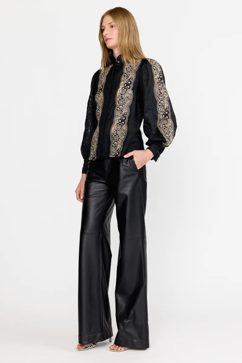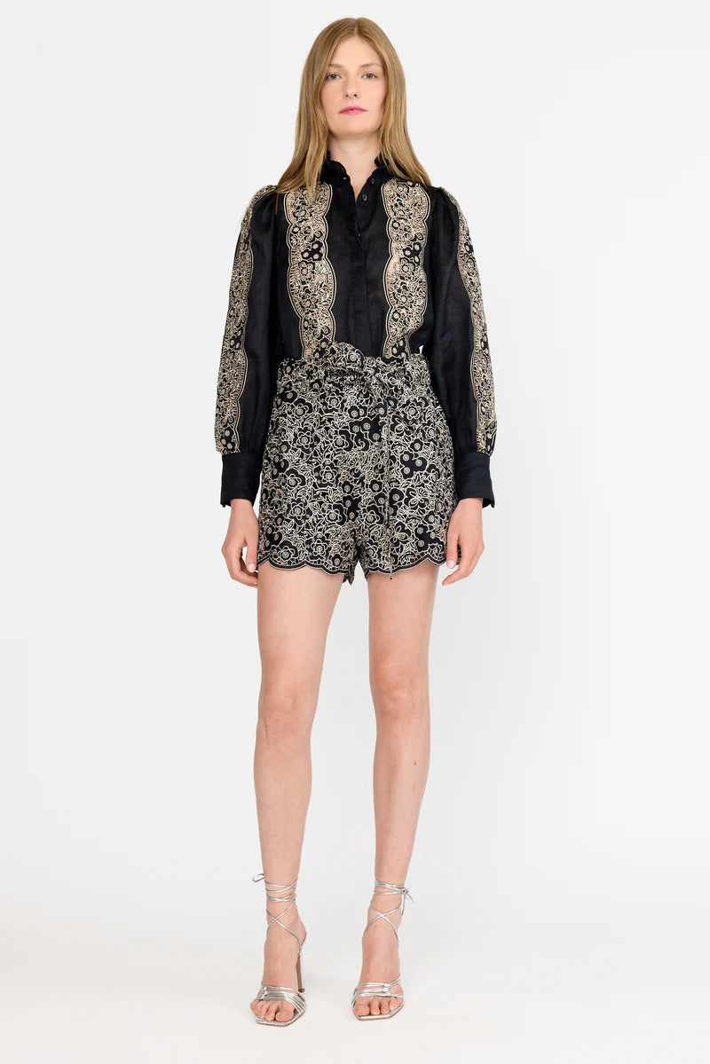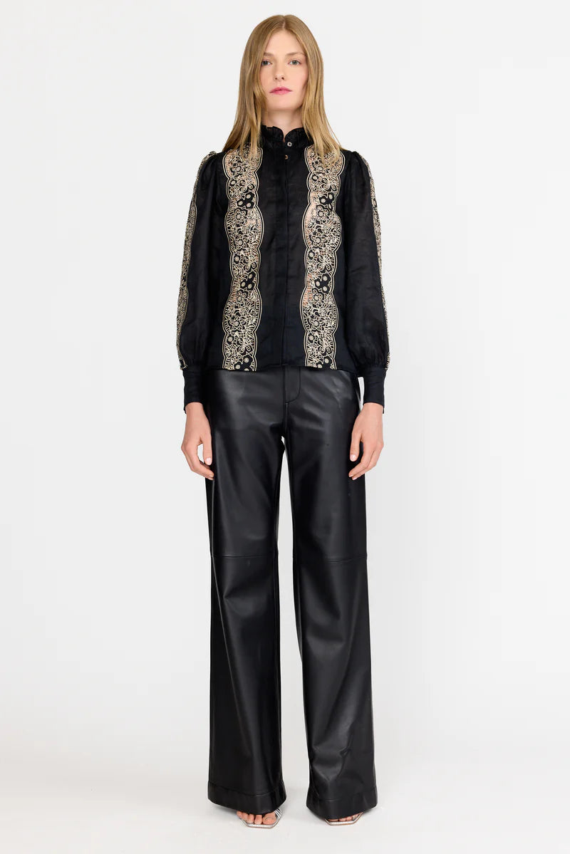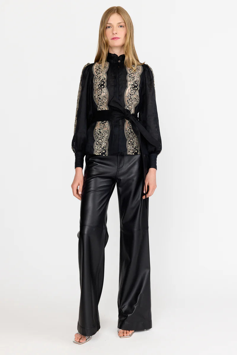 Crafted from a breathable linen blend, this button-up features the season’s Onyx Embroidery delicately framing the front panels and tracing the sides of each sleeve. A ruffled high collar and wide cuff bands add feminine structure, while a detachable tie-waist belt cinches the shape to flatter the form. A hidden button placket creates a clean, polished finish, complemented by black mother-of-pearl buttons, the Riley evokes a timeless refinement that transitions effortlessly from day to evening.