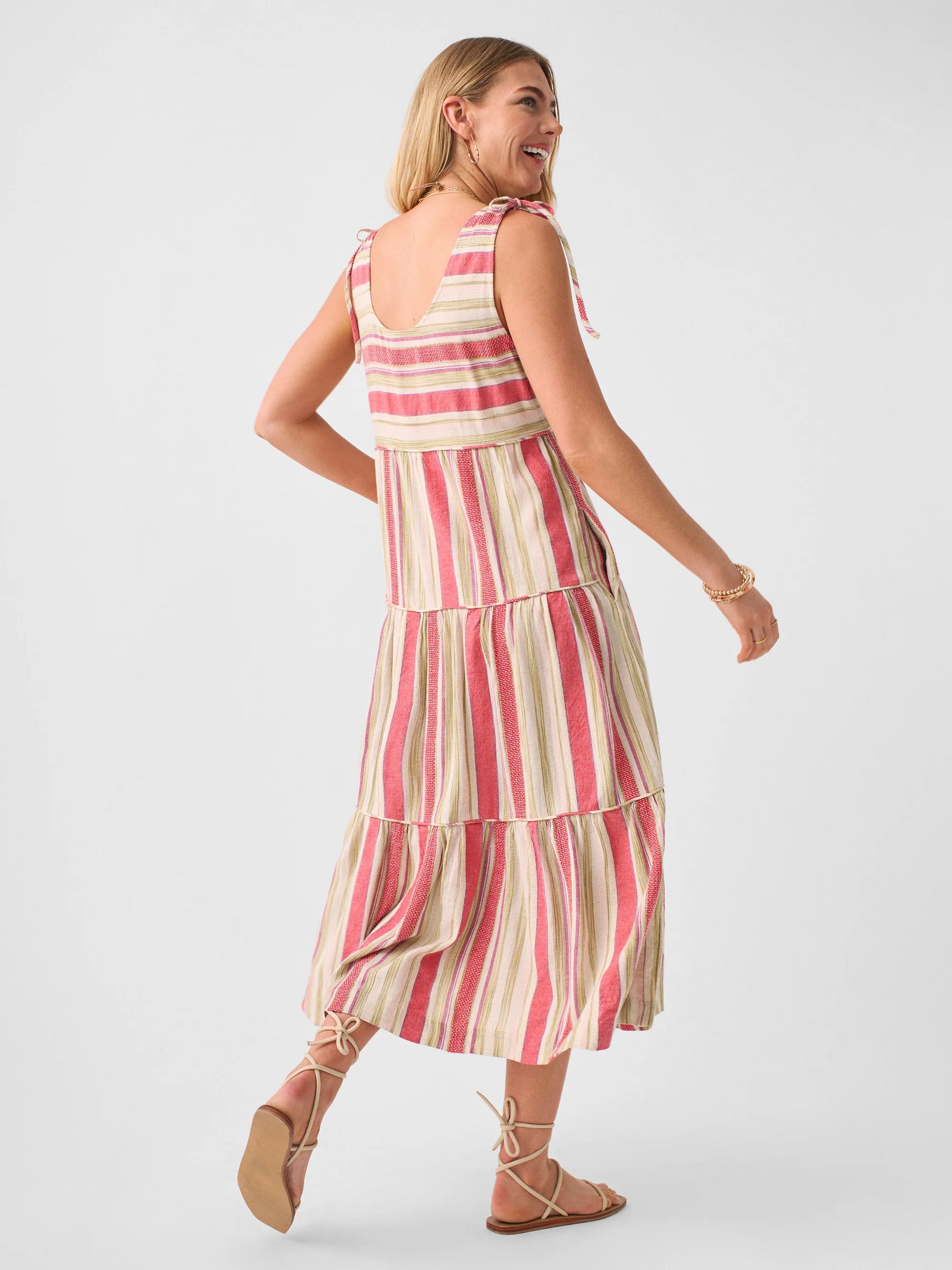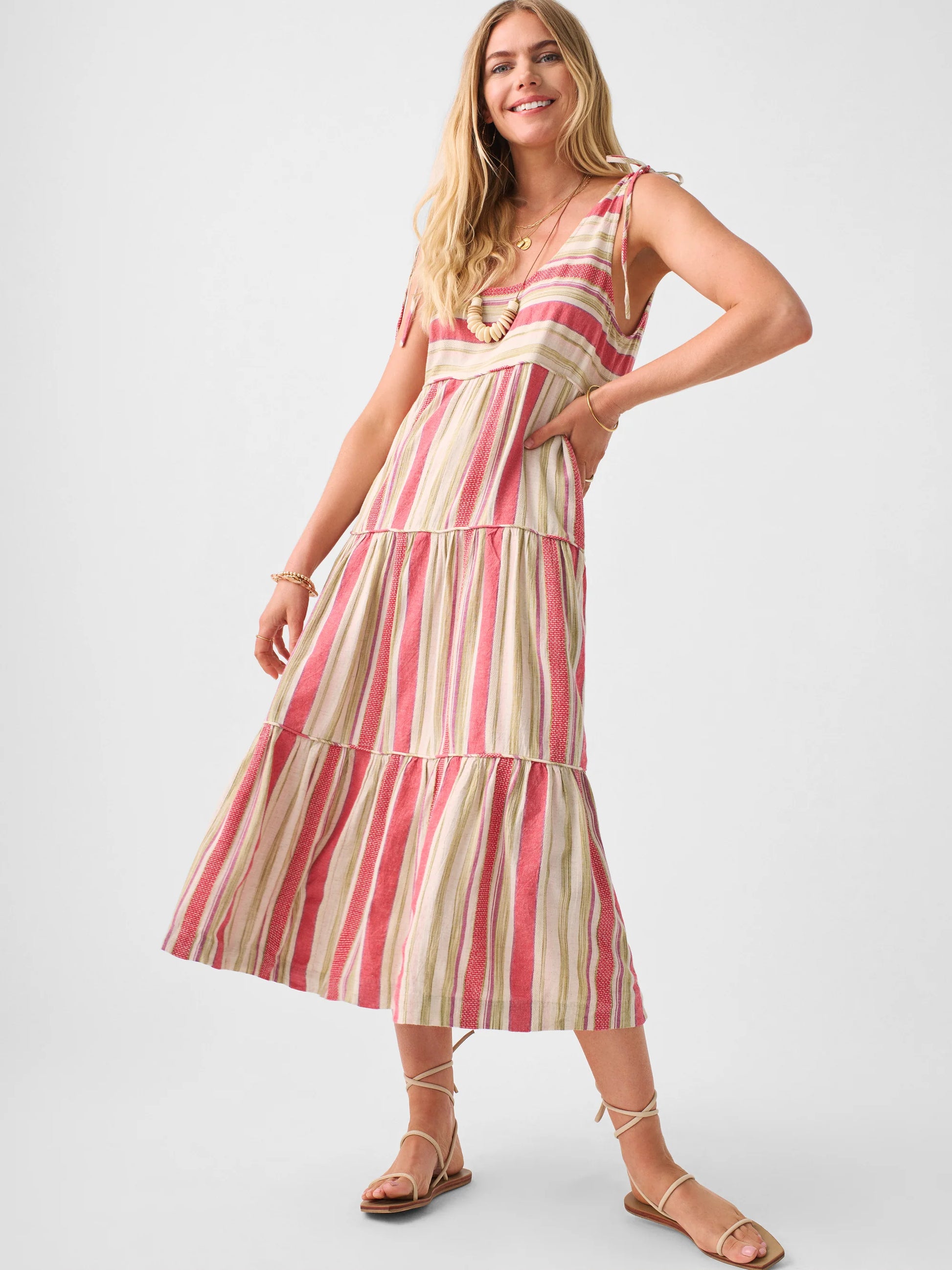 - Detail: Dobby striped fabrication, bias piping at tiers, self-ties at shoulder, on-seam pockets.
