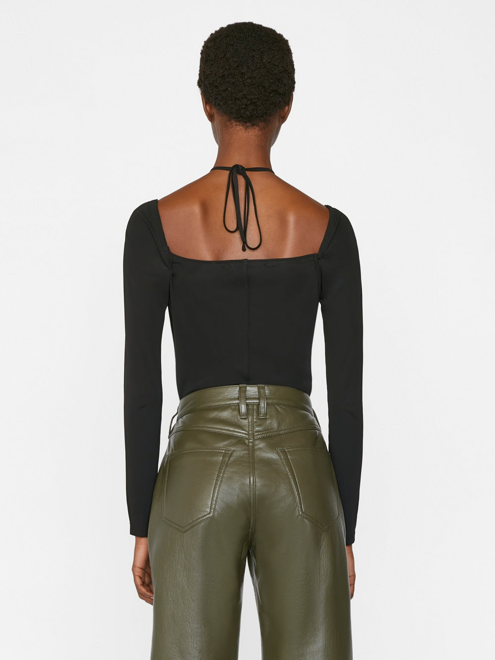 Meet the halter that works all year. Crafted from crepe knit fabric, this long sleeve top features a low square neckline and cut out details, plus halter straps that tie at the nape of the neck. Perfect for party dressing, date night, and in-between occasions when you want something elevated but not overly fancy.