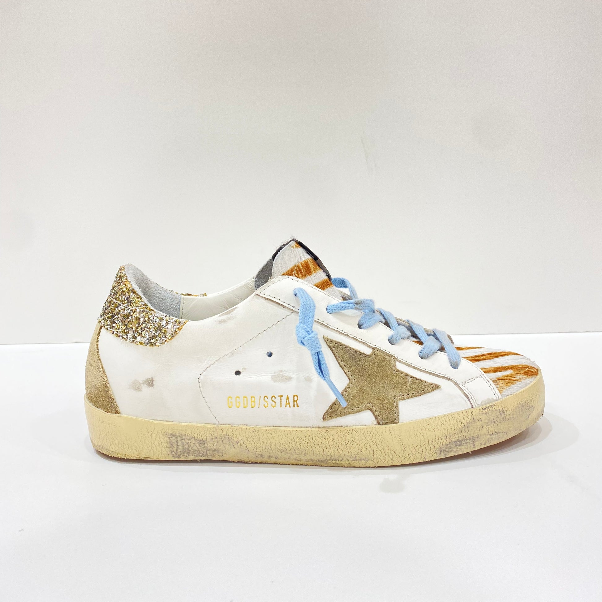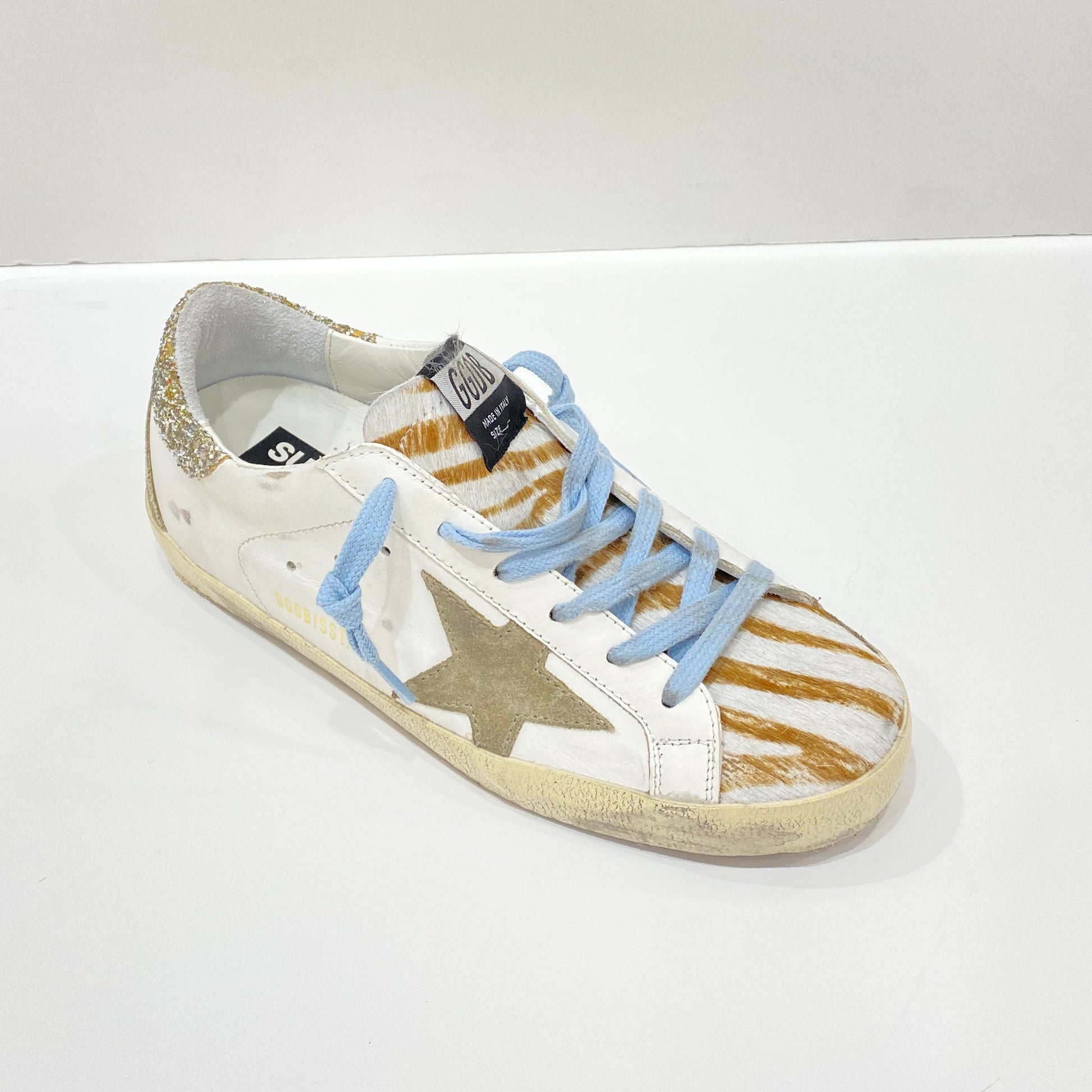 A timeless icon yet one that’s constantly evolving. At Golden, we love taking our classics and reworking them all the time, always from a new angle. This women’s model, in zebra-print pony skin in shades of white and tobacco, features a dove-gray suede star and a glitter heel tab. And blue-colored laces add the finishing touch.