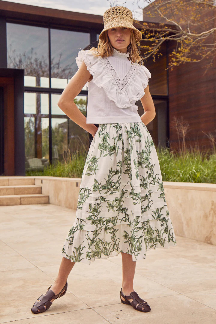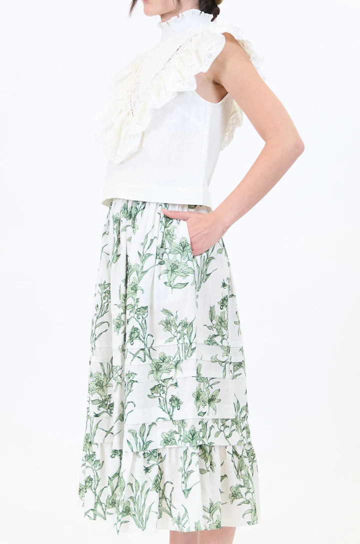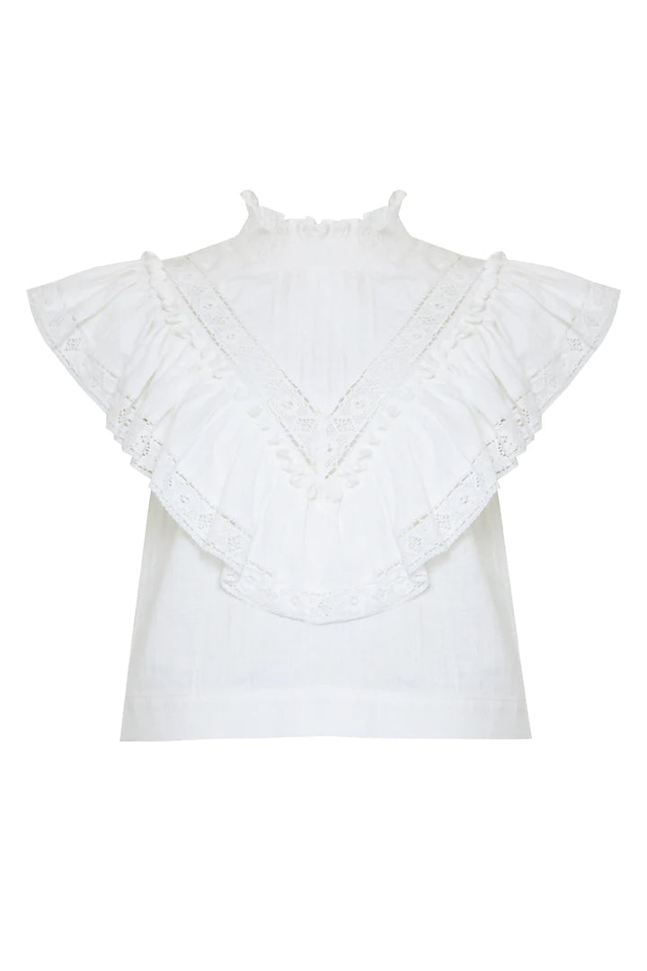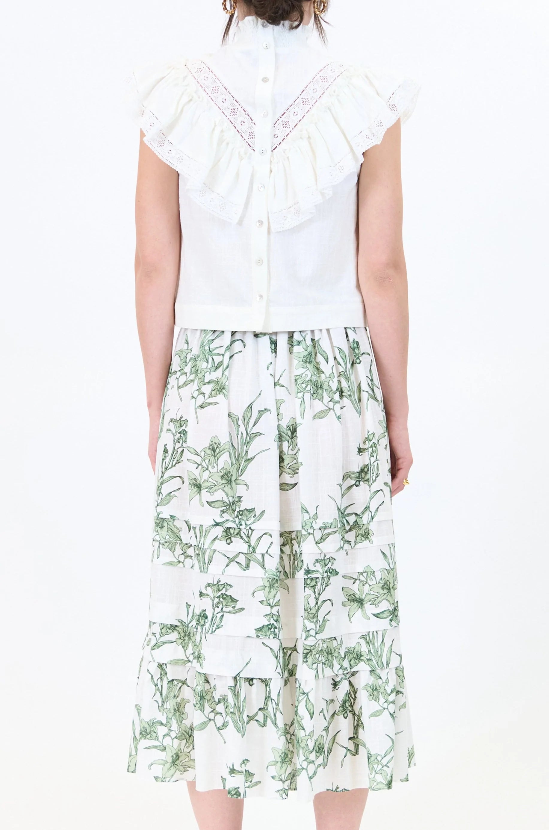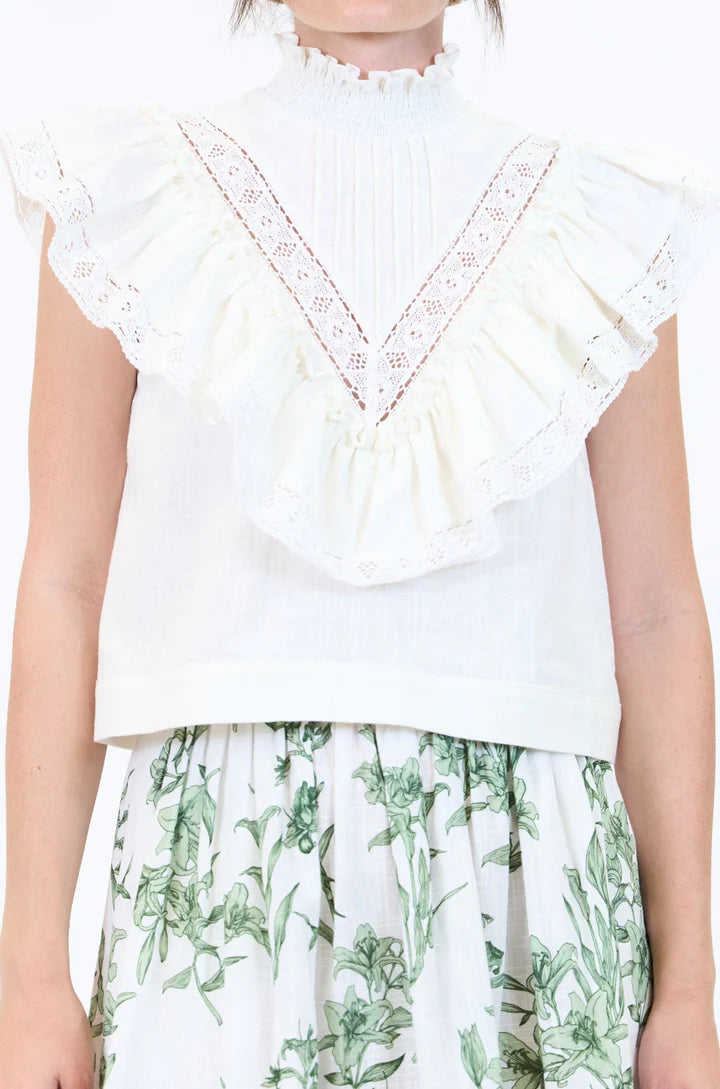 Katrina was designed to be a head turner. A sleeveless mock neck is complimented by pintucks and lace trim on the ruffled yoke overlay.