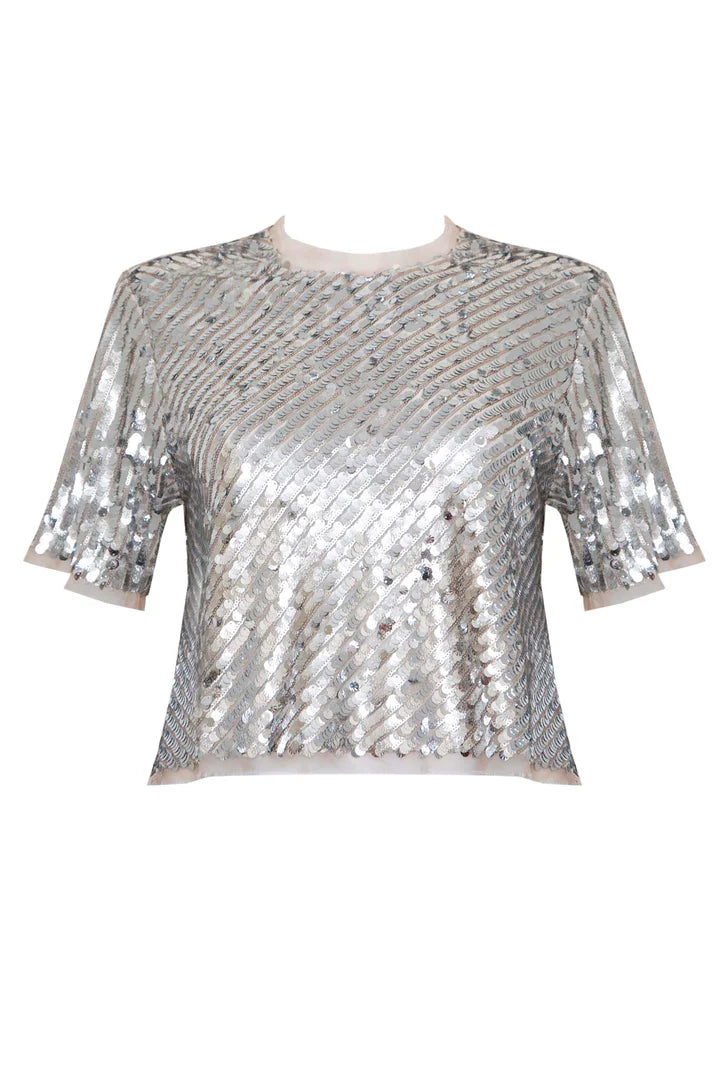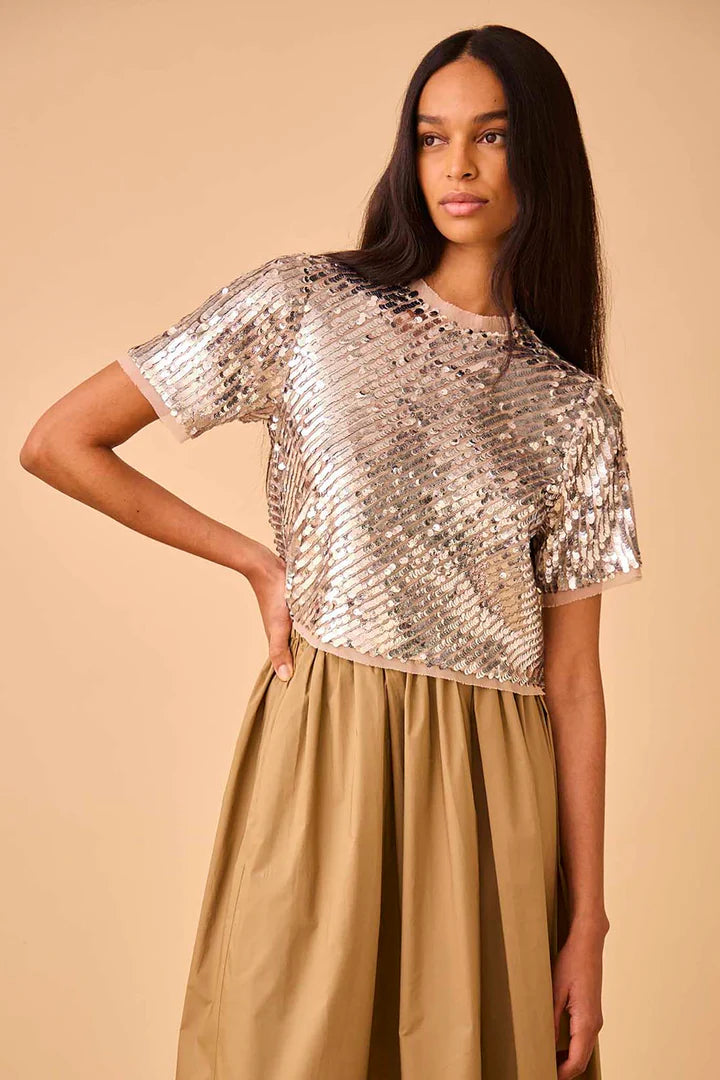The Pixie Top is everything you want in a head-turning piece. It features subtle chiffon trim at the neck, sleeves, and hem, perfectly complementing the ambiance created by the champagne-colored sequins. This combination of delicate details and shimmering sequins makes the Pixie top a dazzling addition to any wardrobe.