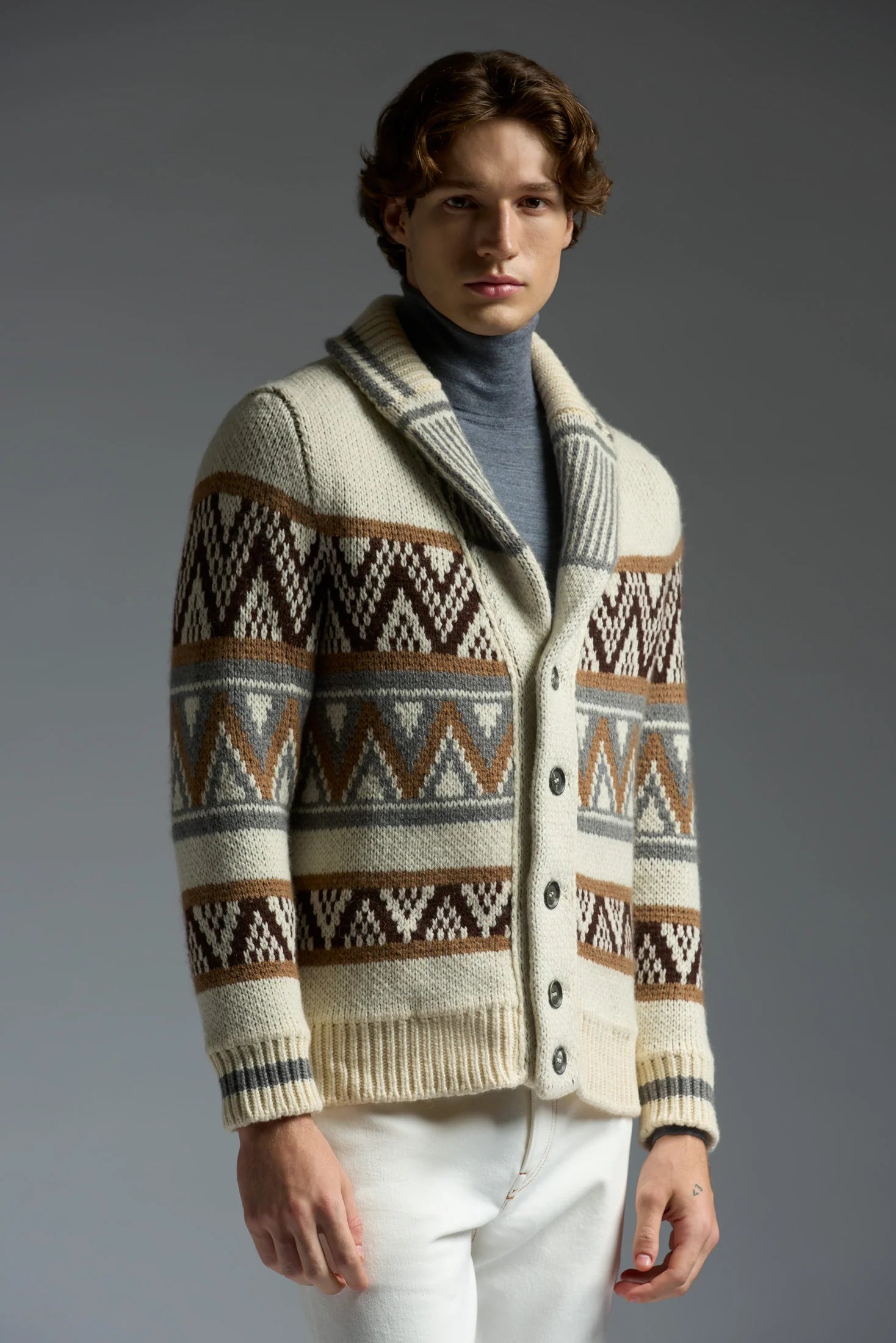 A refined take on a casual staple, this shawl collar cardigan is crafted from a luxuriously soft fabric for exceptional comfort and warmth. The distinctive shawl collar frames the neckline with relaxed elegance, while the button-front closure and ribbed trims ensure a polished fit. Horn buttons add a touch of classic sophistication. Layer it over a crisp shirt or lightweight knit for effortless, elevated style.