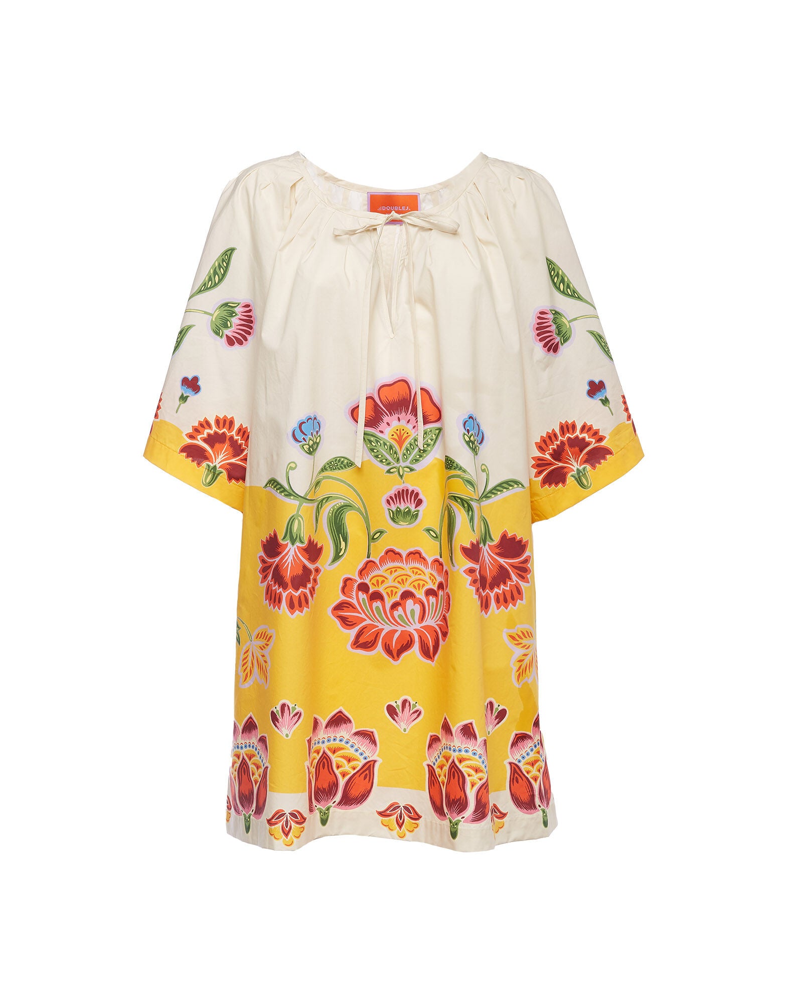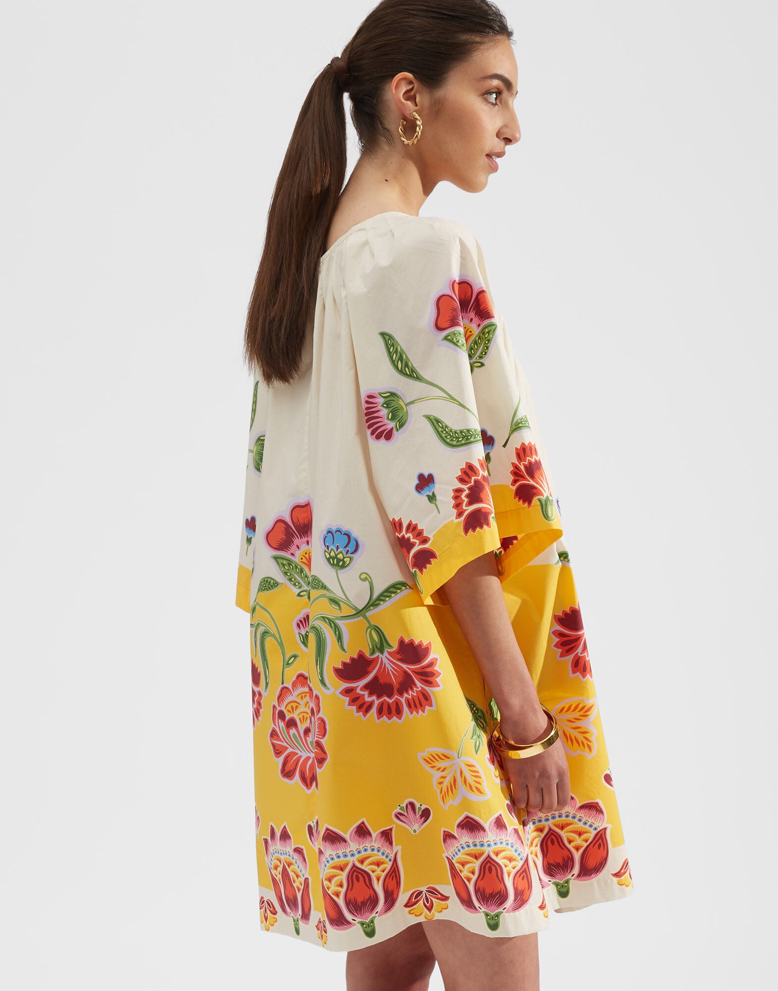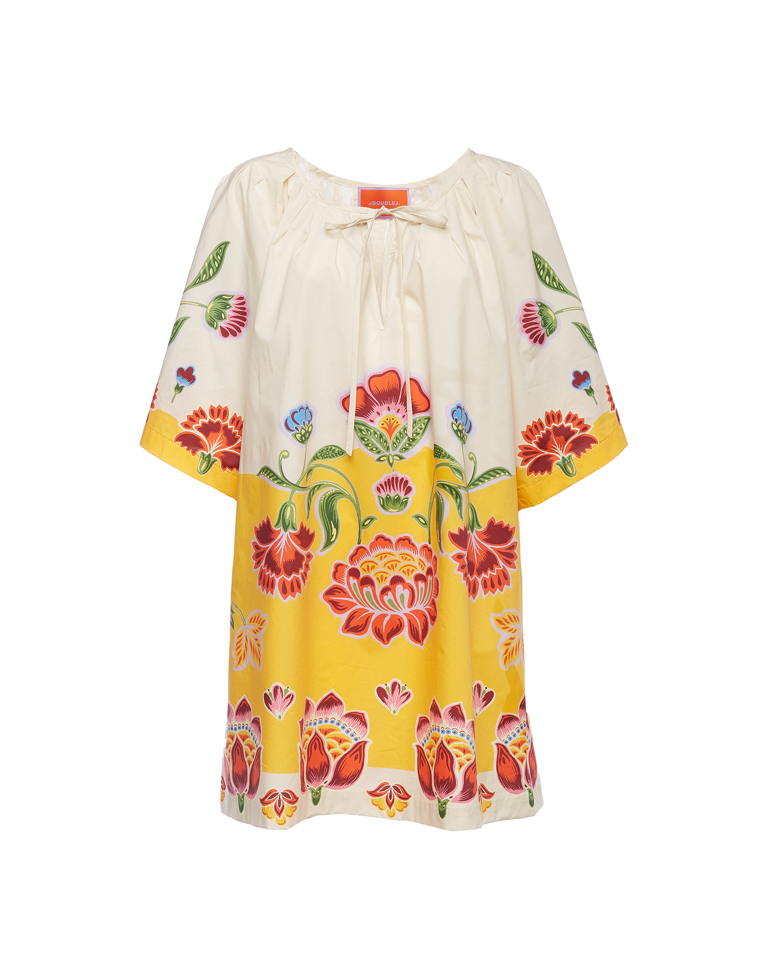 Like all holiday romances, the Flirty Dress is short and sweet. With a blissfully loose, folky silhouette, frisky miniskirt and short open sleeves, this boho babe is crafted from our cotton poplin which gives plenty of bounce and makes this gorgissima hand-placed print sing. The adjustable tie in the neck can be bowed or left open to let your pile of gold chains peek through. Wear it with our Precious Slides and Celebration Raffia Pouch for weddings or cocktails and with your fave white sneaks just about anywhere else.