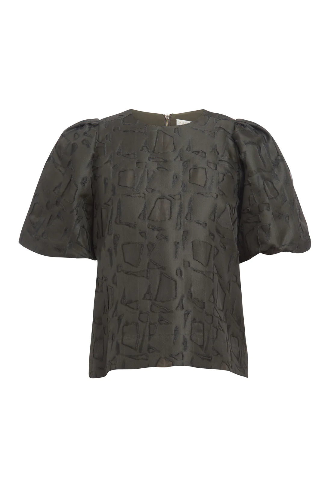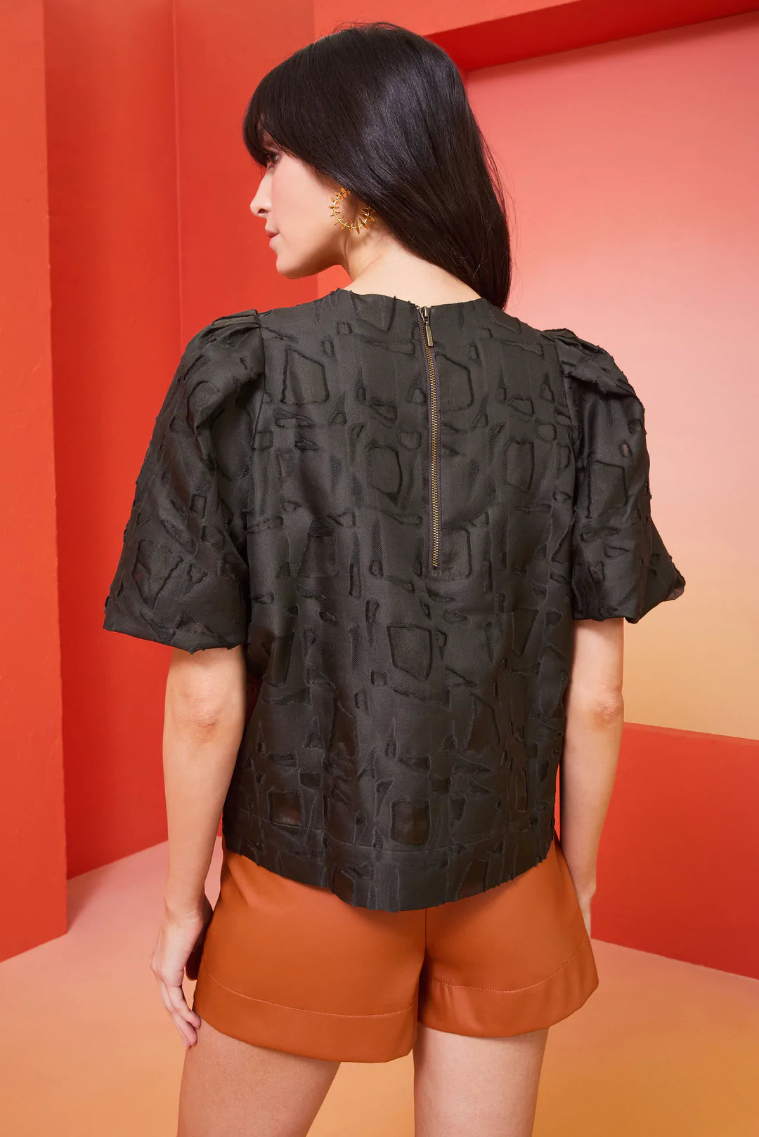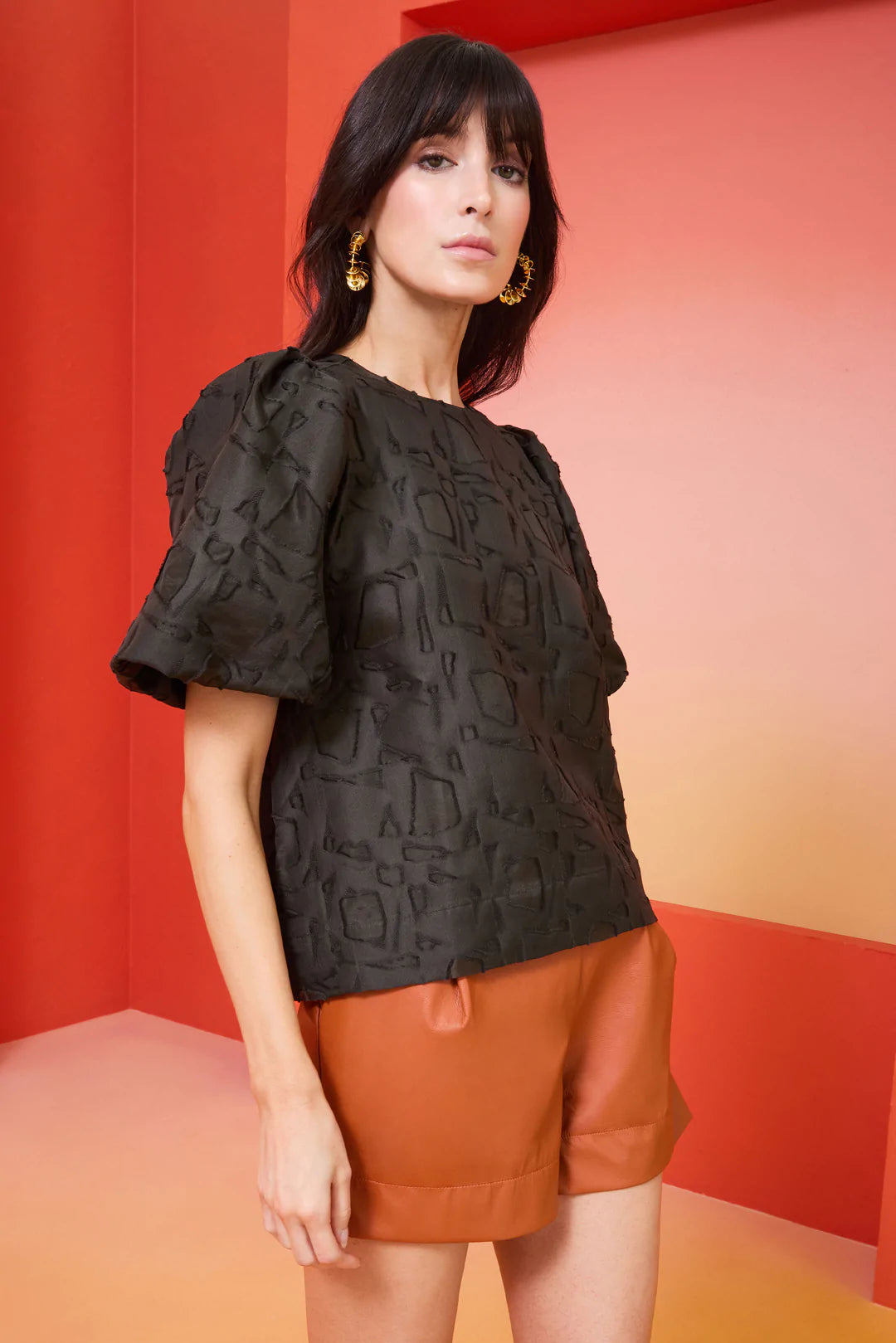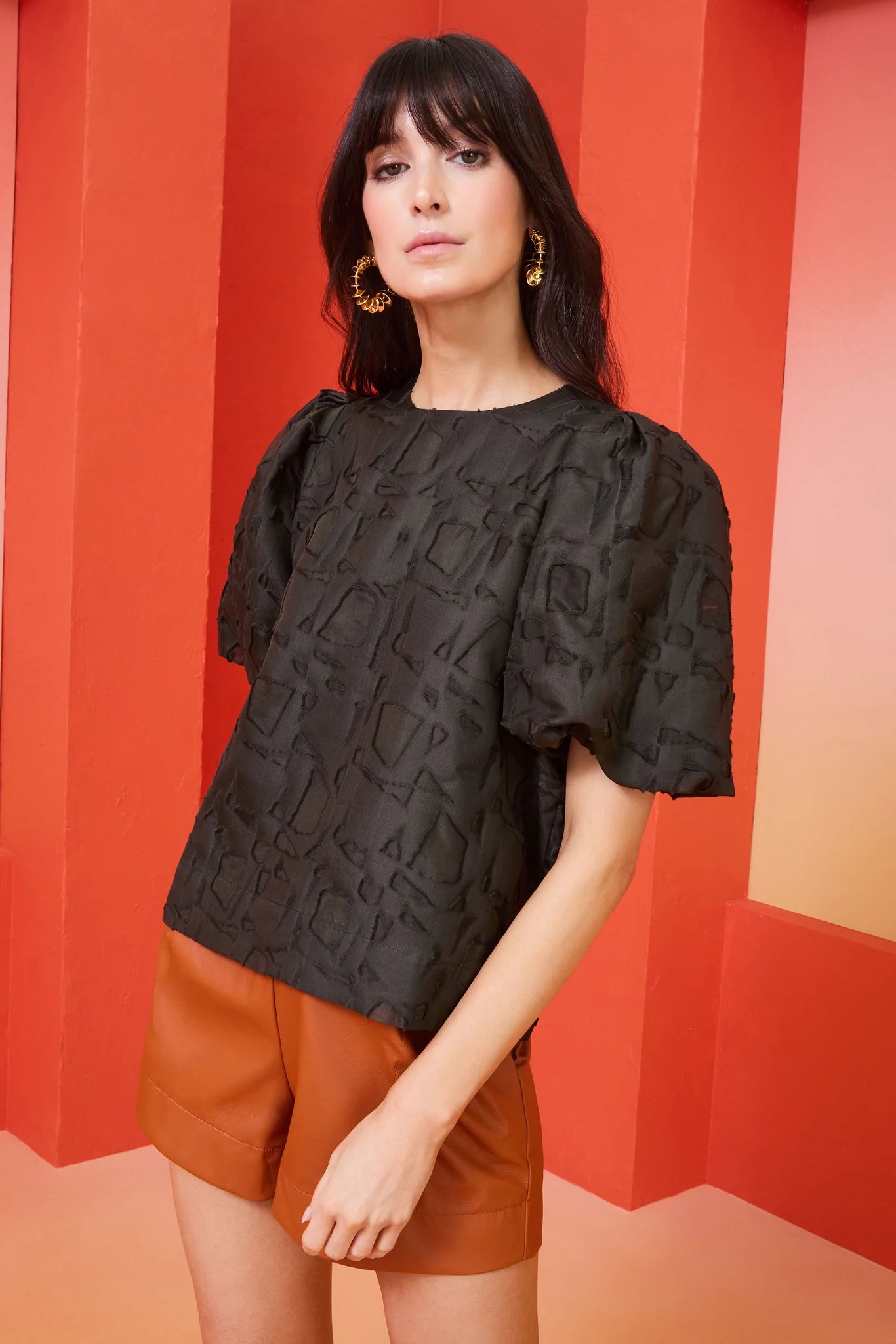 An evolution of our popular Willa Blouse, the Jessa Top delivers just the right amount of drama with full bag sleeves, a slightly cropped silhouette, textured jacquard, and a unique nearly-black Army green hue. She’s pictured here with our vegan leather Pixie Shorts in Sienna but looks great with black pants or denim.