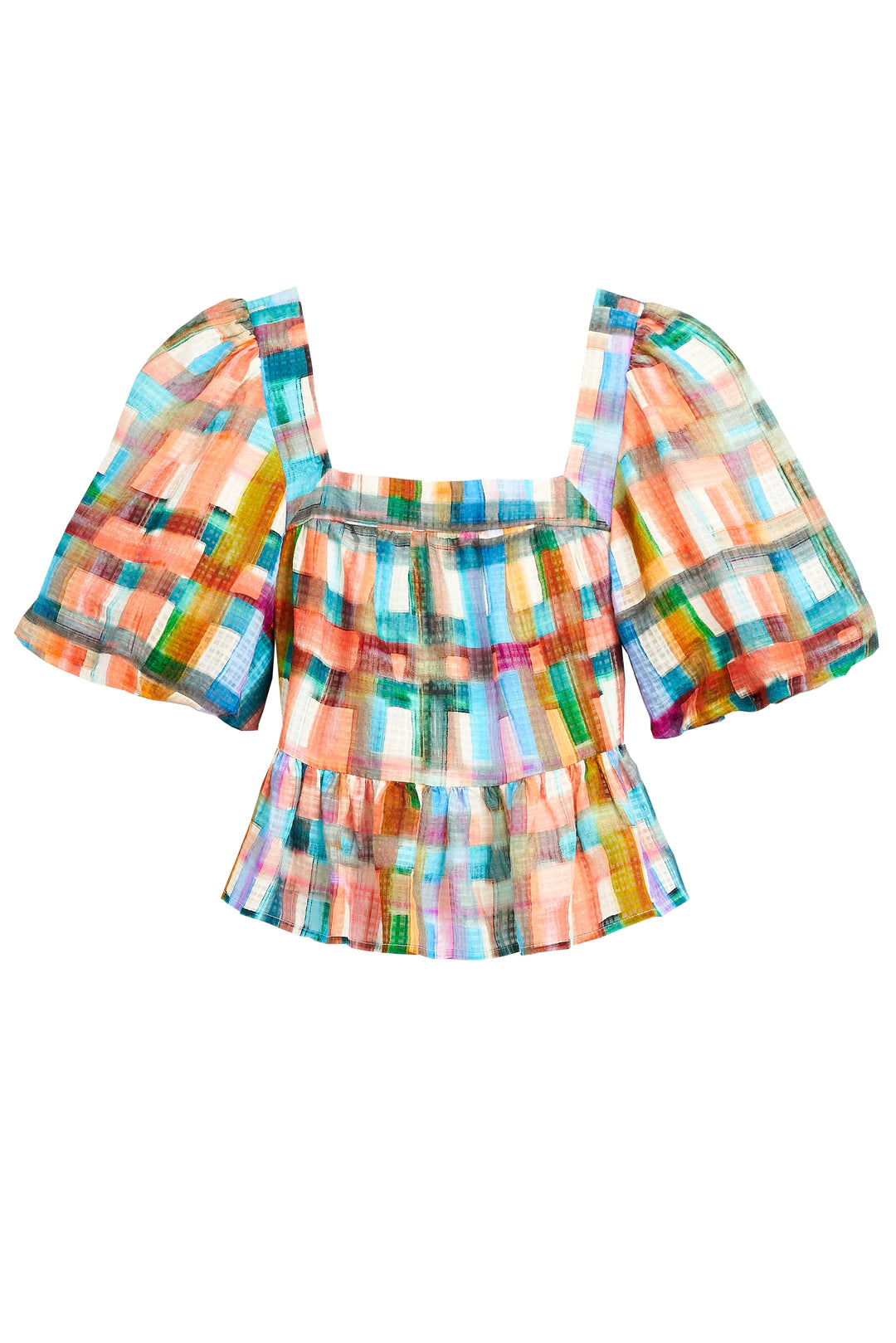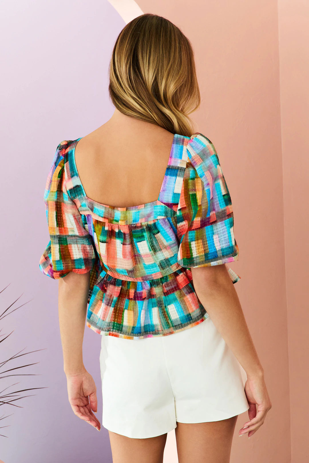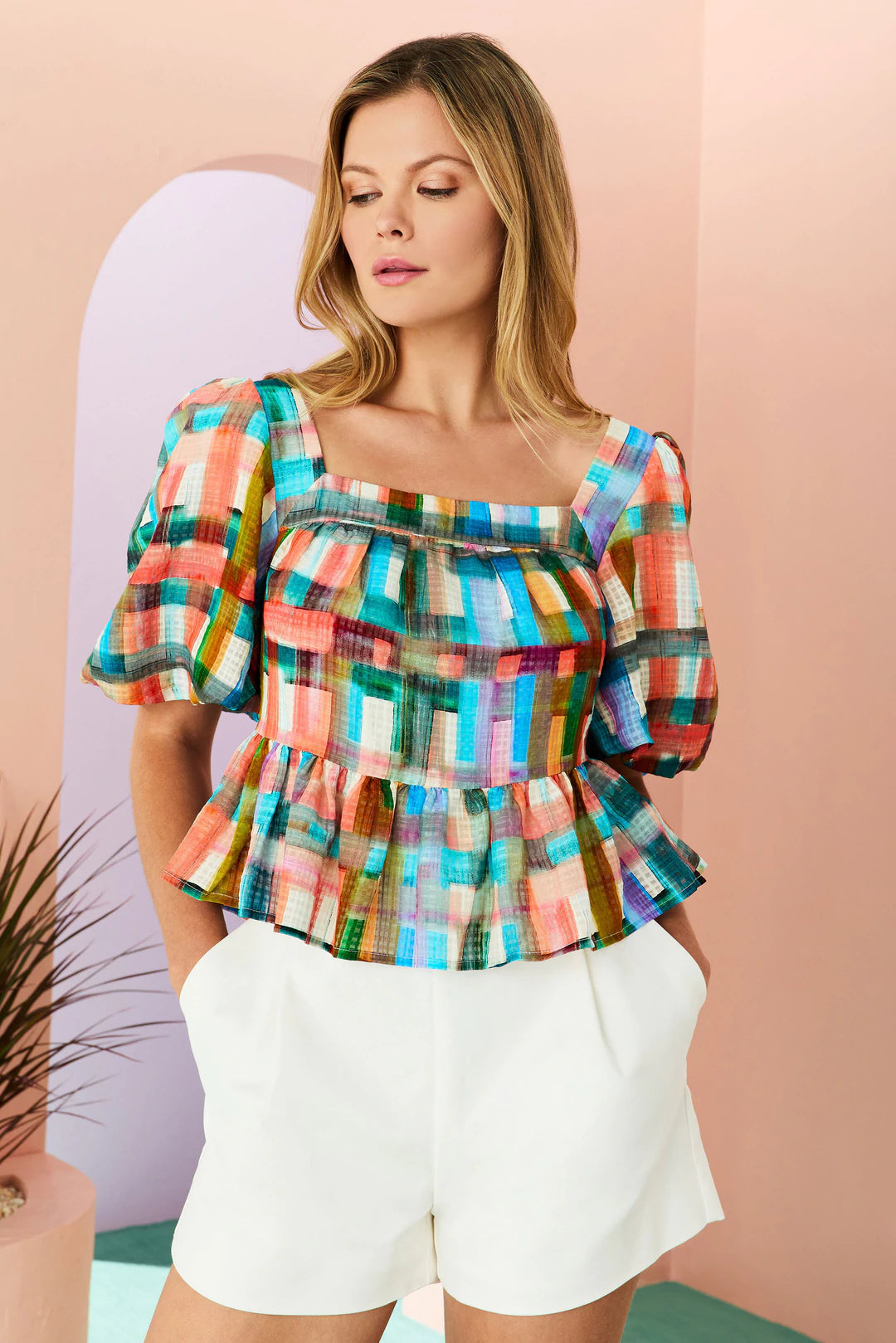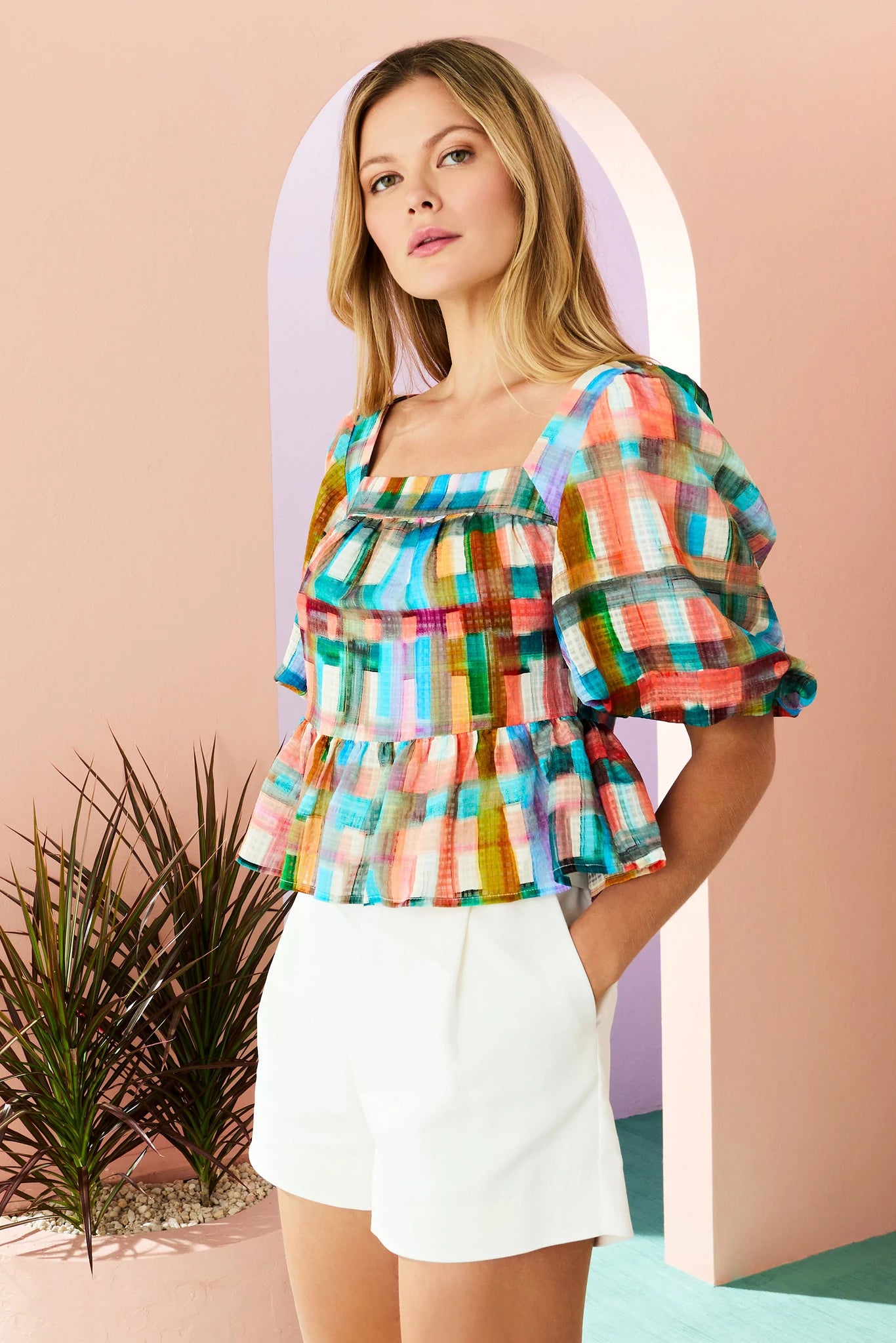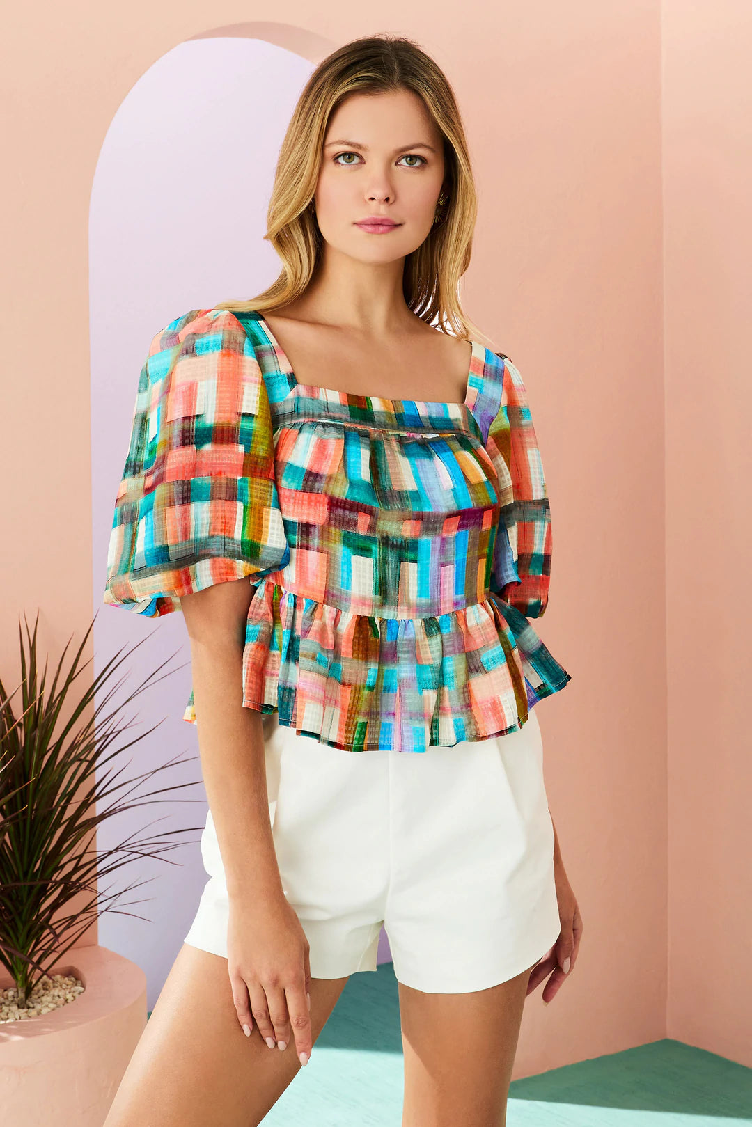 Marrying a soft textured-silk with our painterly-take on a classic Madras print, the Kaylee Top plays with texture, pattern, and color. Watercolor stripes of coral, teal, tangerine, and purple criss cross the fitted bodice, which flares out into a soft peplum at the waist.