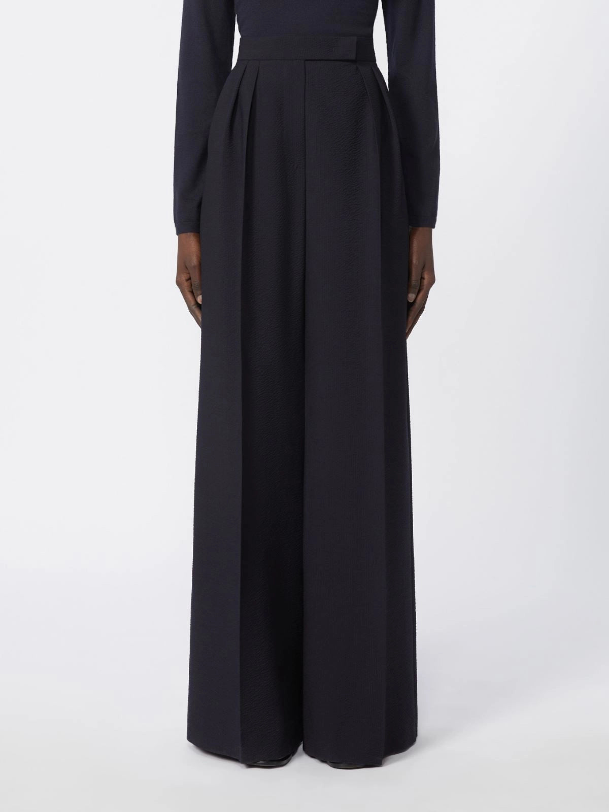Wide-leg trousers featuring double dart detail that bestows volume and structure to the garment.