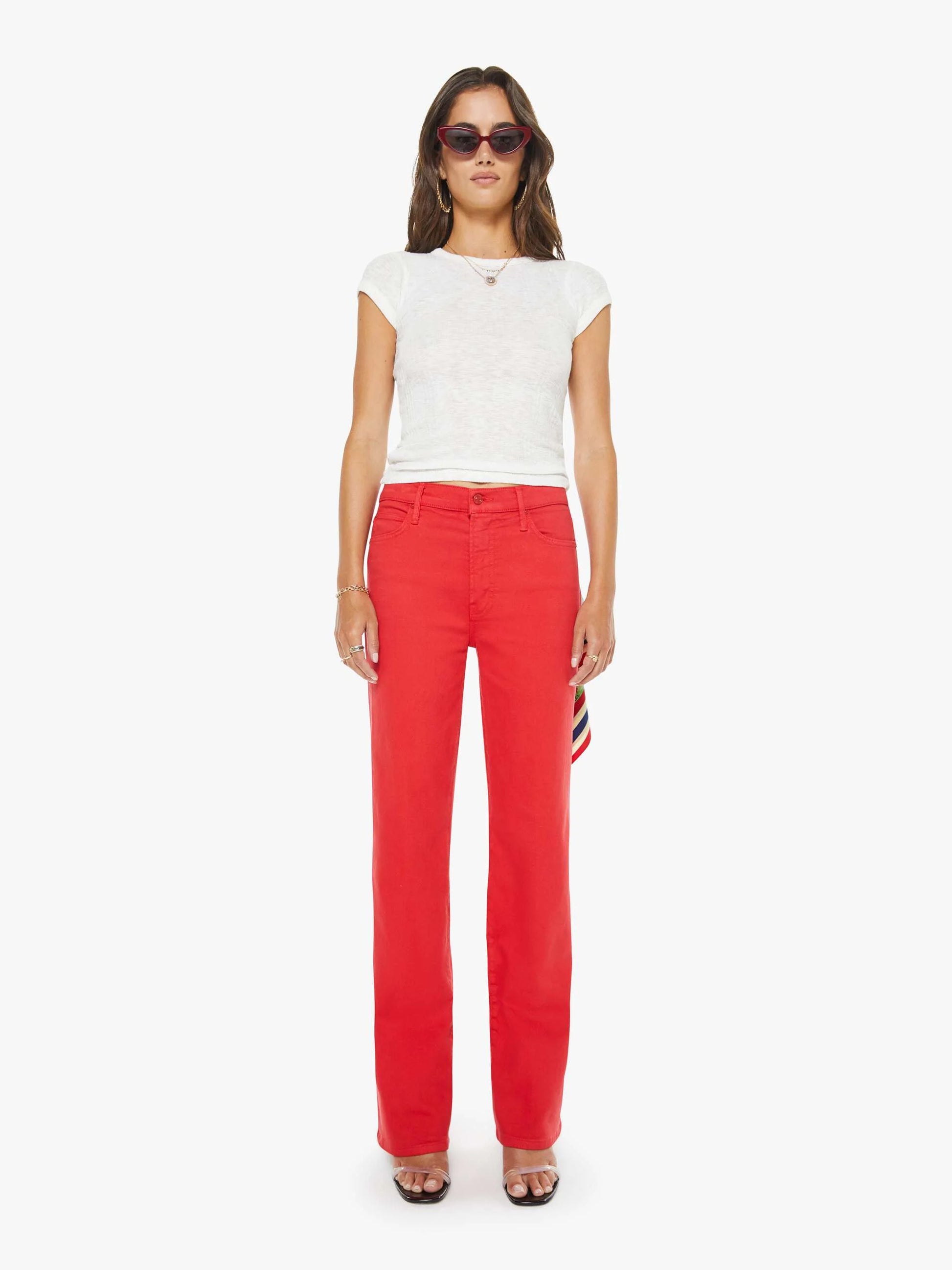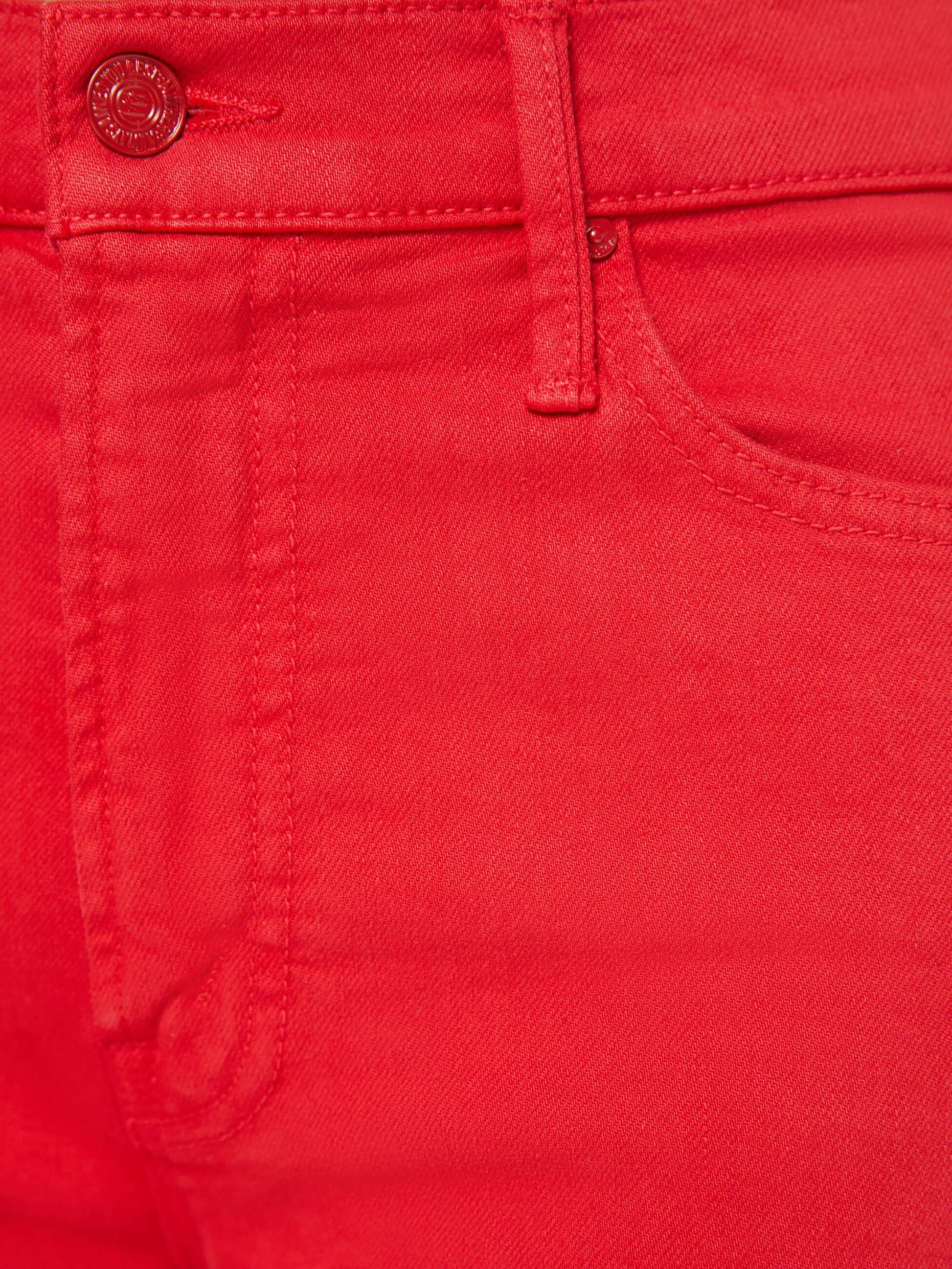 A high-rise straight-leg jean with a zip fly, 32-inch inseam and a clean hem. Made from a stretch cotton blend, the pants are designed in bright red with tonal hardware.