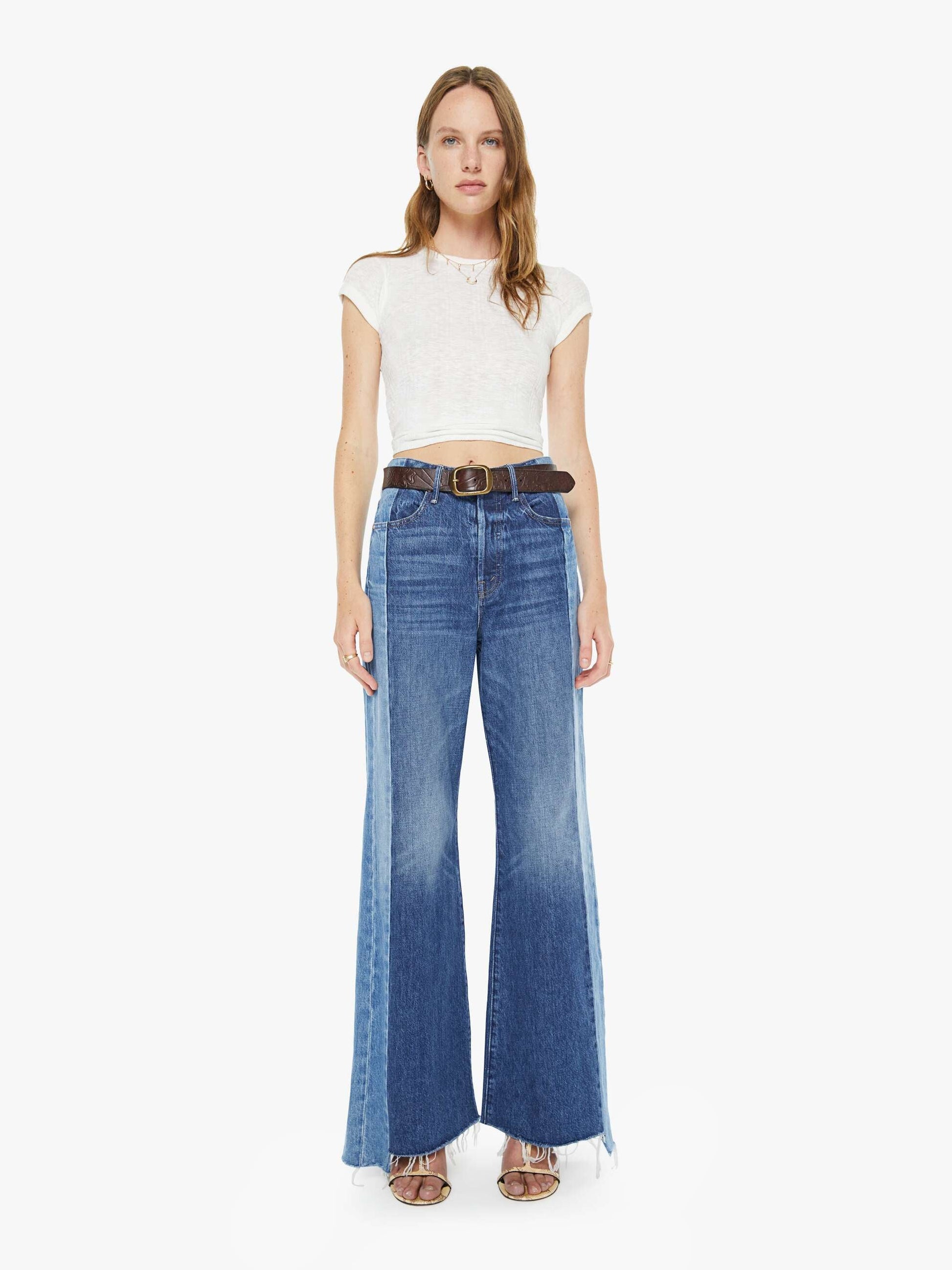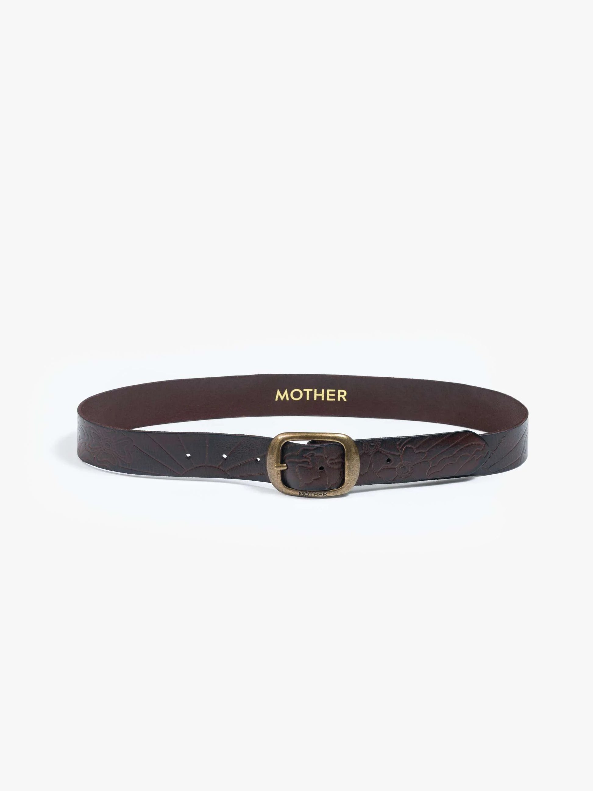 Buckle up. A leather belt with an oversized brass buckle. The Magpie is made from 100% cow leather in dark brown with embossed flowers and suns throughout.