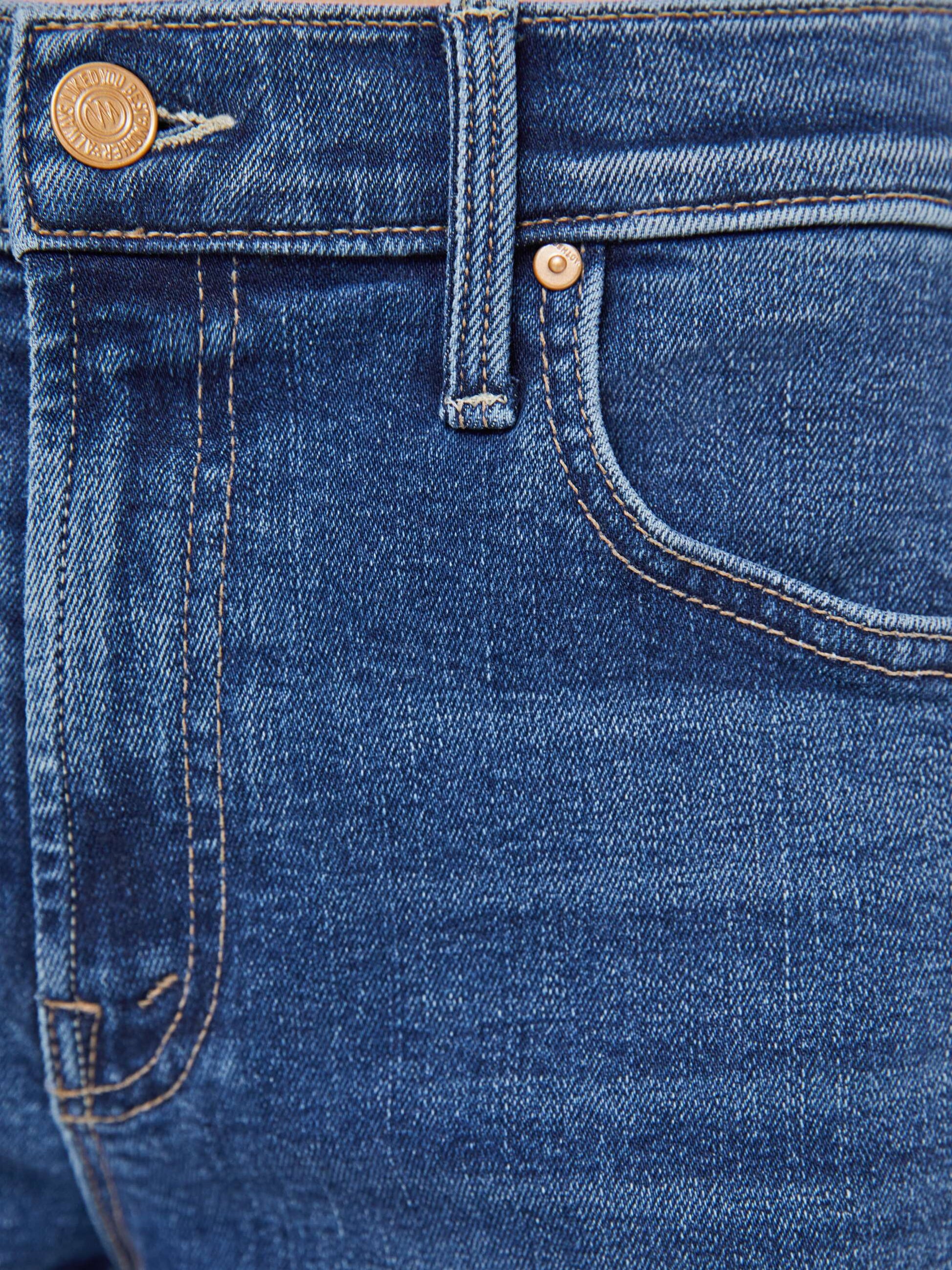 Hidden treasure. Mid-rise straight-leg jeans with a zip fly, ankle-length inseam and a frayed hem. Made from stretch denim, Prized Possession is a mid blue with subtle whiskering and fading at the knees.