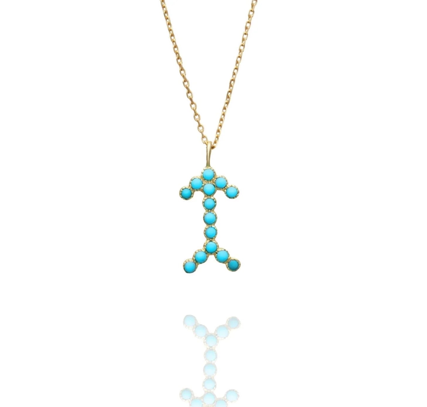 Turquoise Arrow Necklace made of fourteen 2mm Sleeping Beauty Turquoise cabochons and 18 Karat gold on a 16"-18" gold chain.