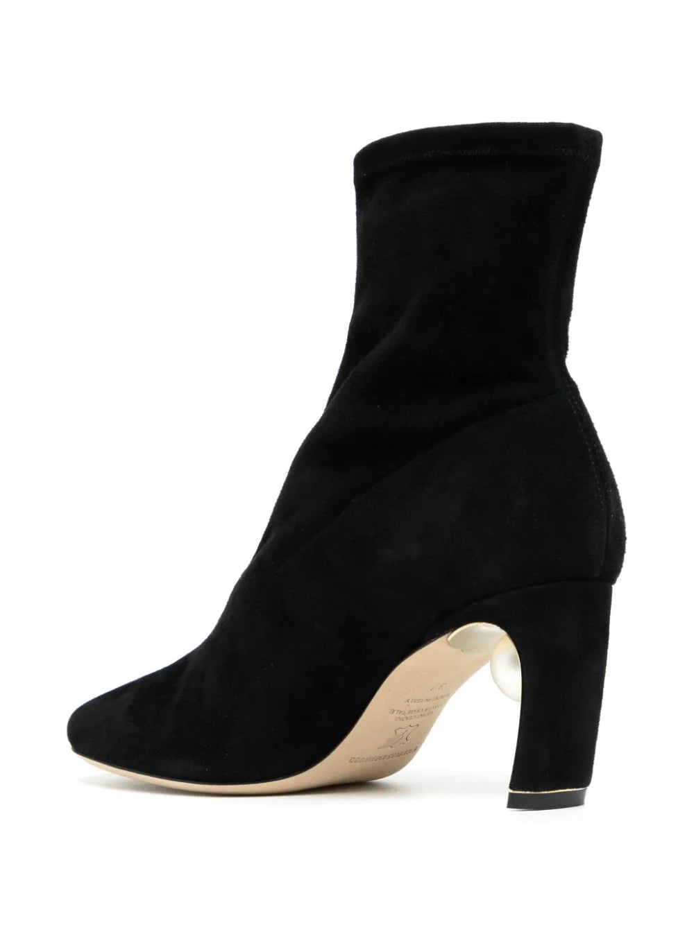 The curved square toe distinguishes MAEVA’s reinvention. The slip-on ankle boots are crafted in black stretch suede then fished with a signature pearl suspended inside the sculptural heel. The sole is made from vegetable-tanned leather that's lightweight and plastic-free.