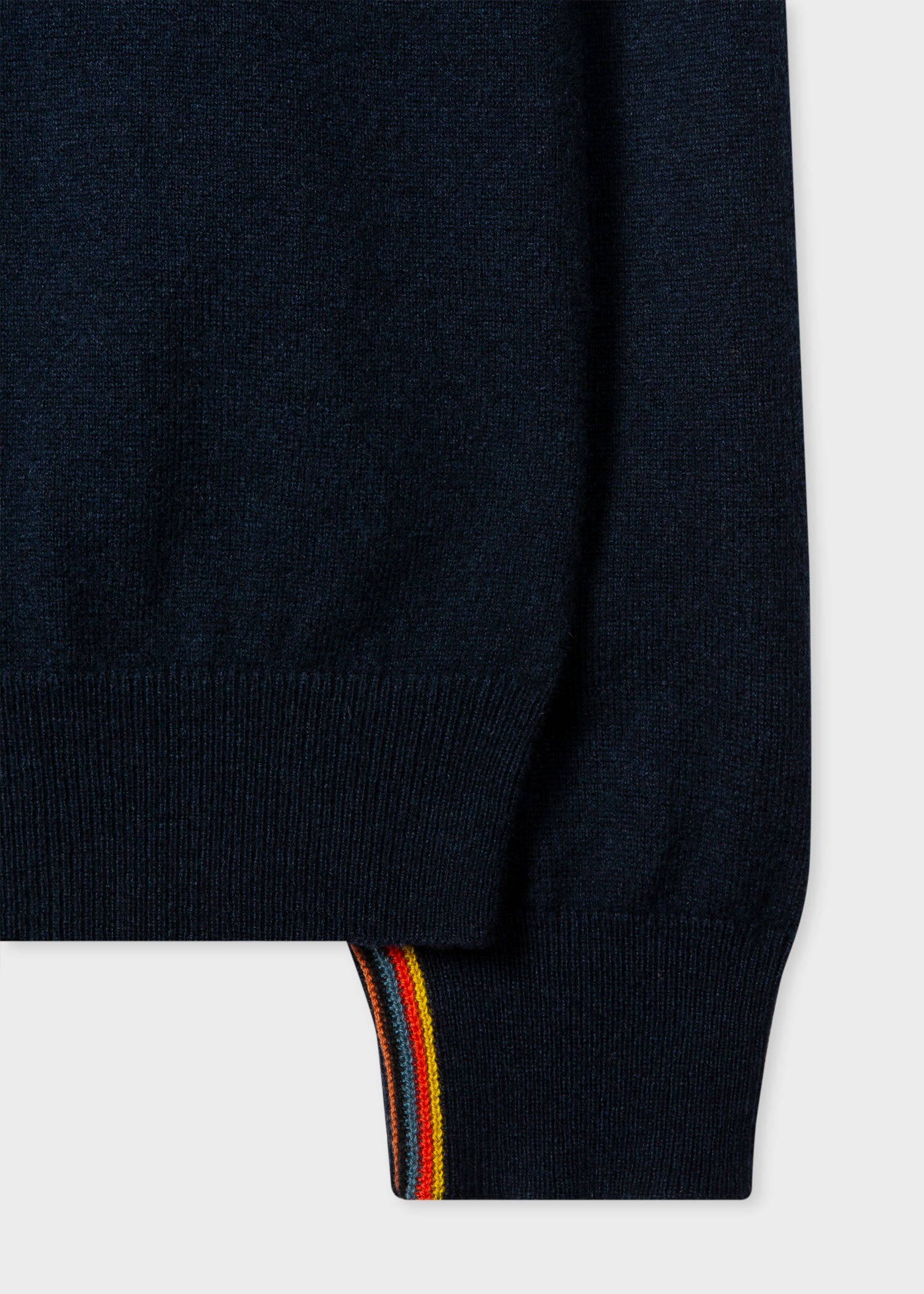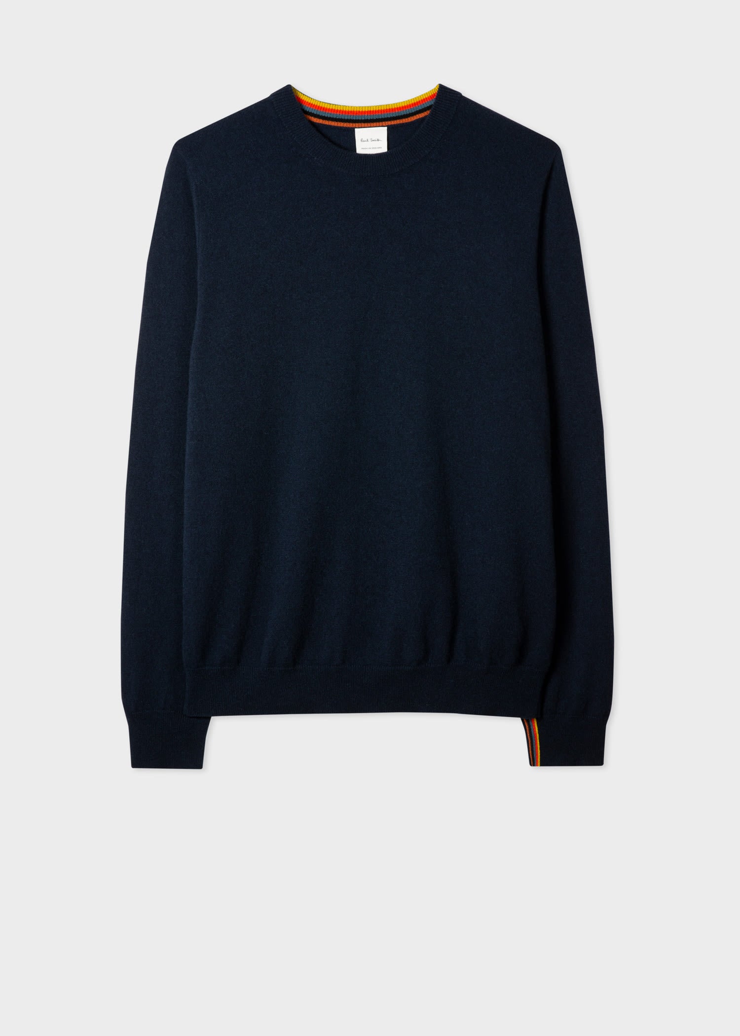 Made in England from 100% cashmere for super-soft hand-feel, this dark navy crew neck sweater features a classic design with 'Artist Stripe' trims on the inside collar and cuffs.