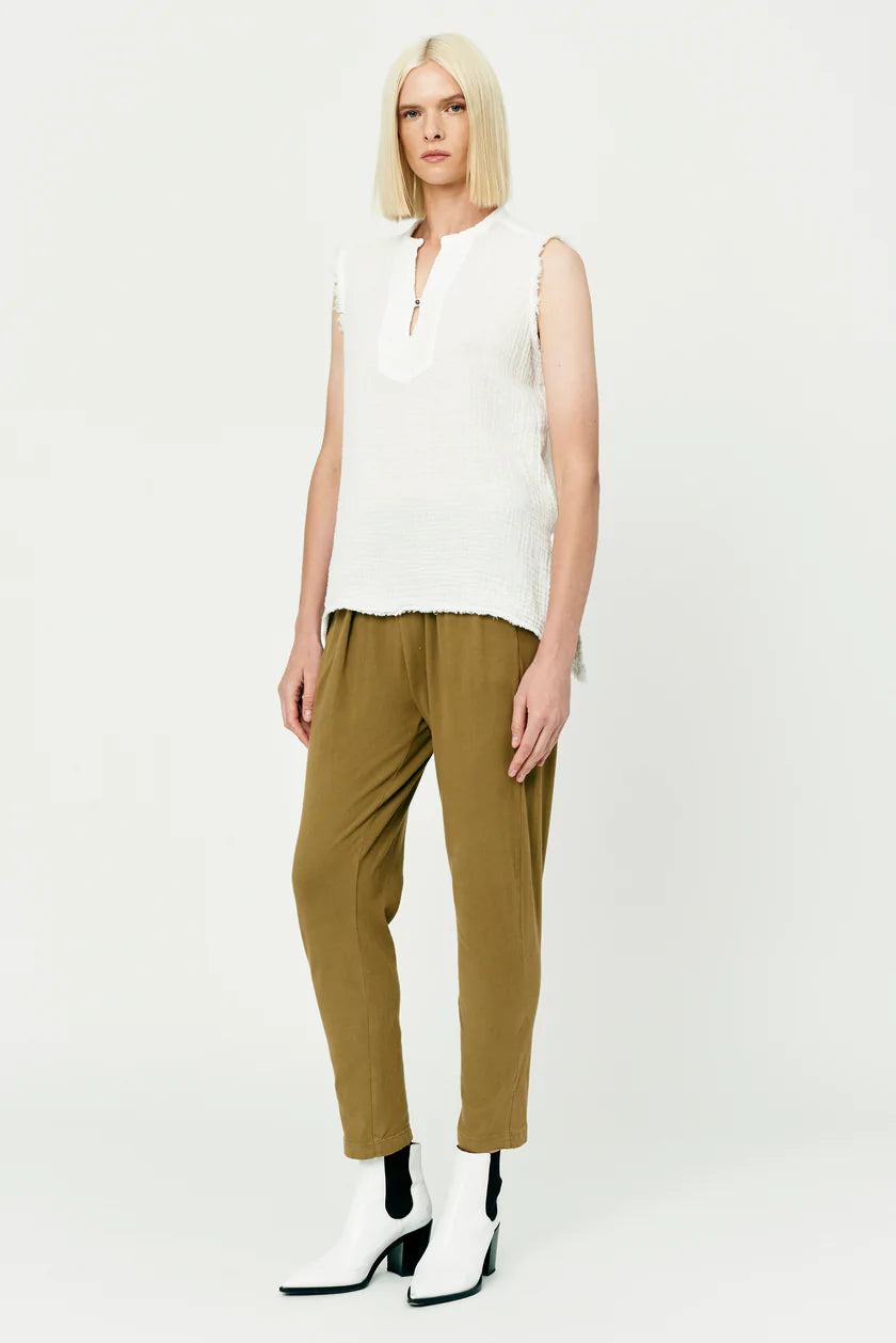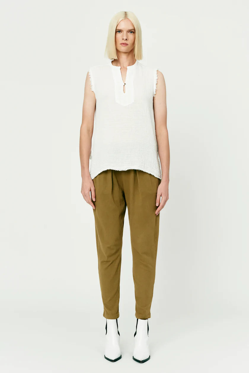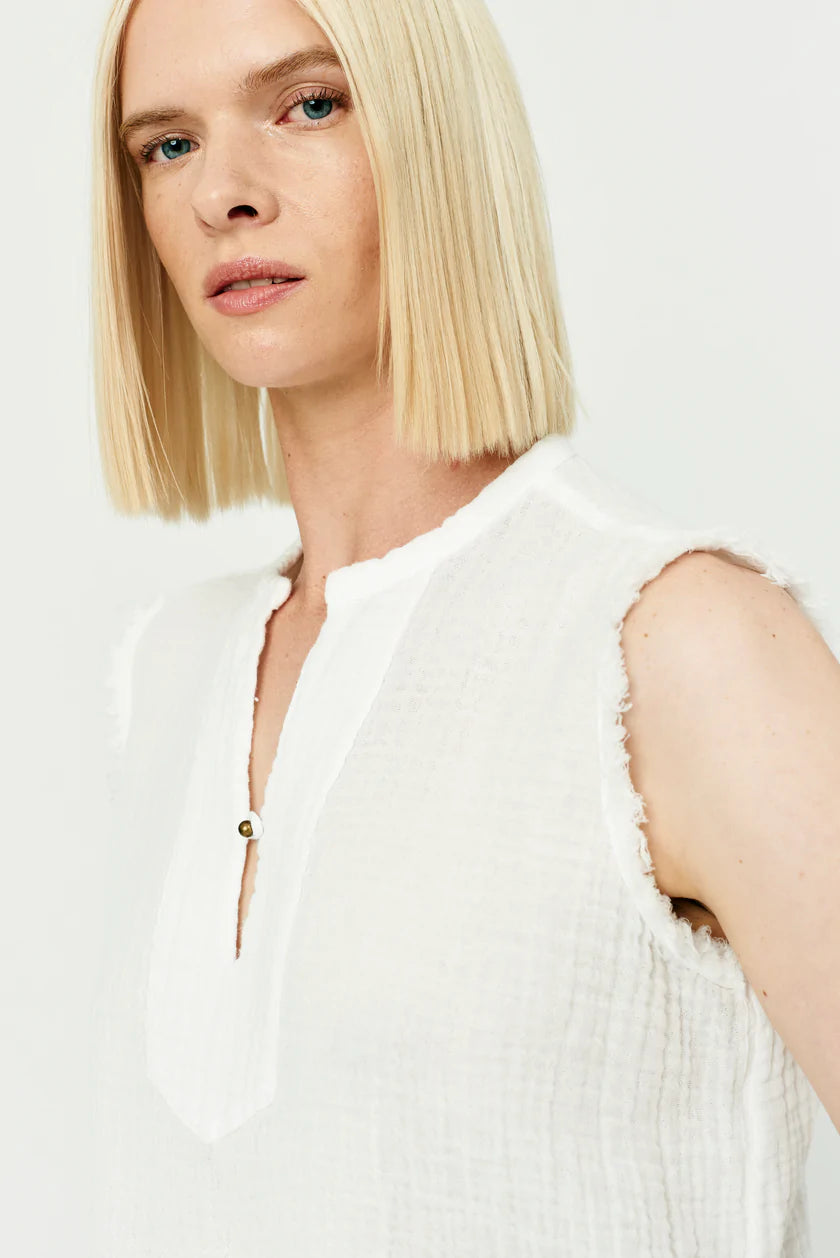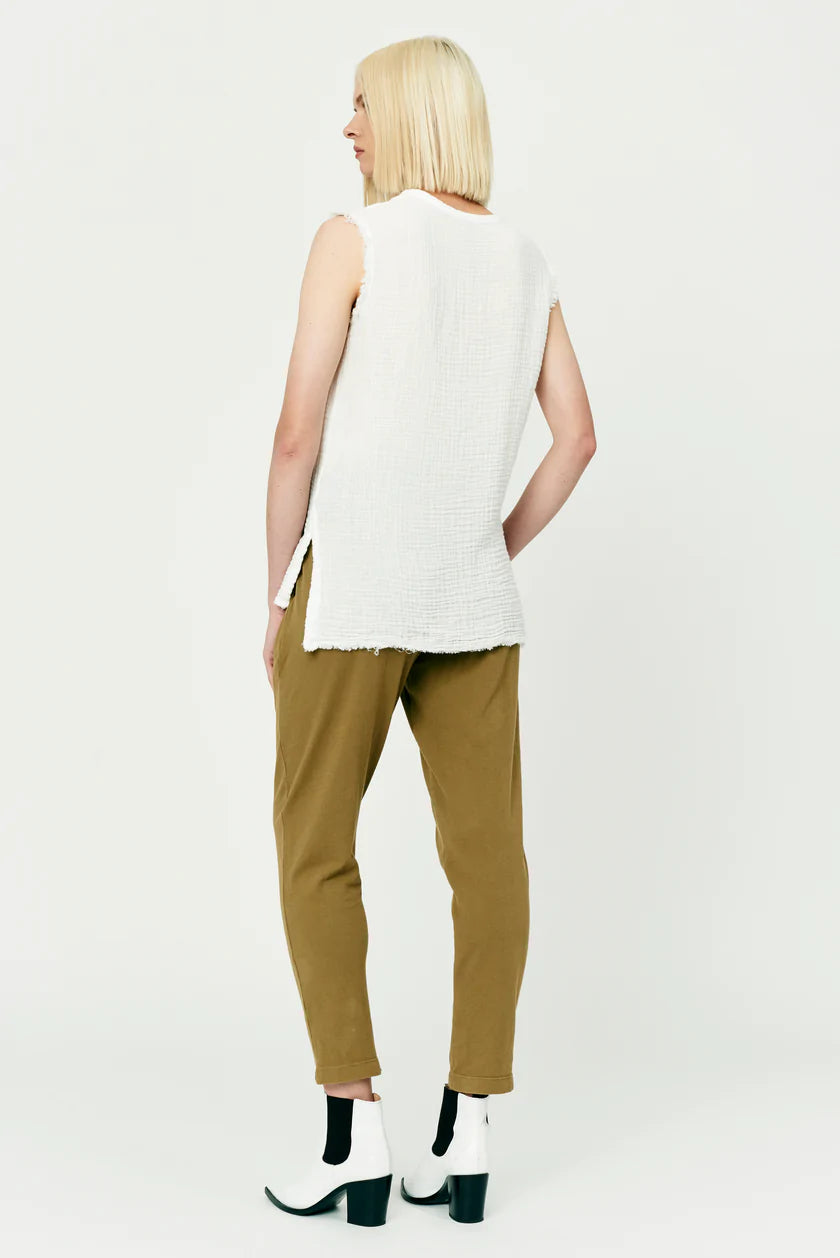 A sleeveless top in our signature gauze with raw edges is a perfect choice to bring California warmth to Fall days and layering looks.