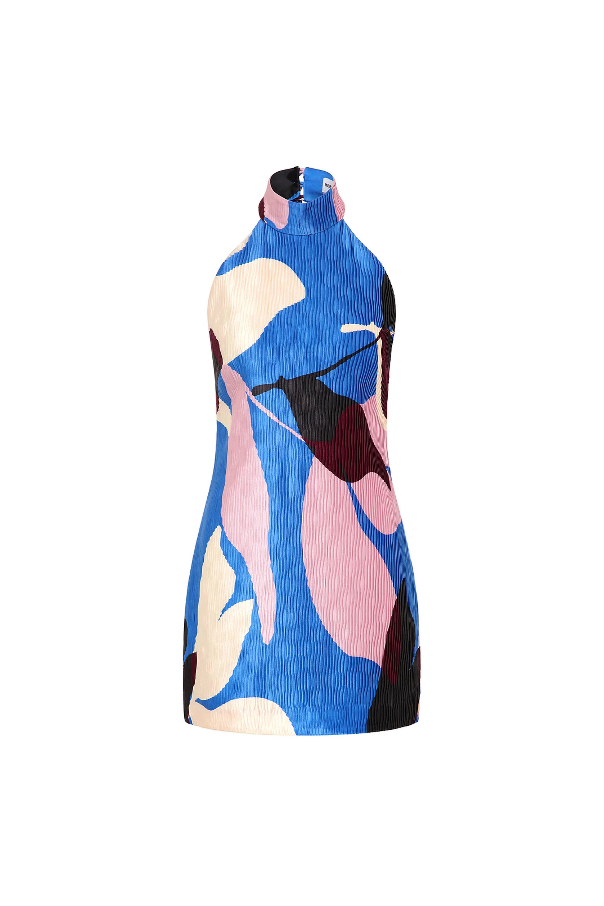 The Mika Mini Dress radiates chic style in a playful abstract print. Featuring an elegant halter neckline secured with rouleau buttons, the design is elevated by a low open back that enhances its feminine slip silhouette. An invisible zip fastening at the back completes the refined look, offering a precise and comfortable fit. Perfect for transitioning from day to night, this versatile dress is a must-have.