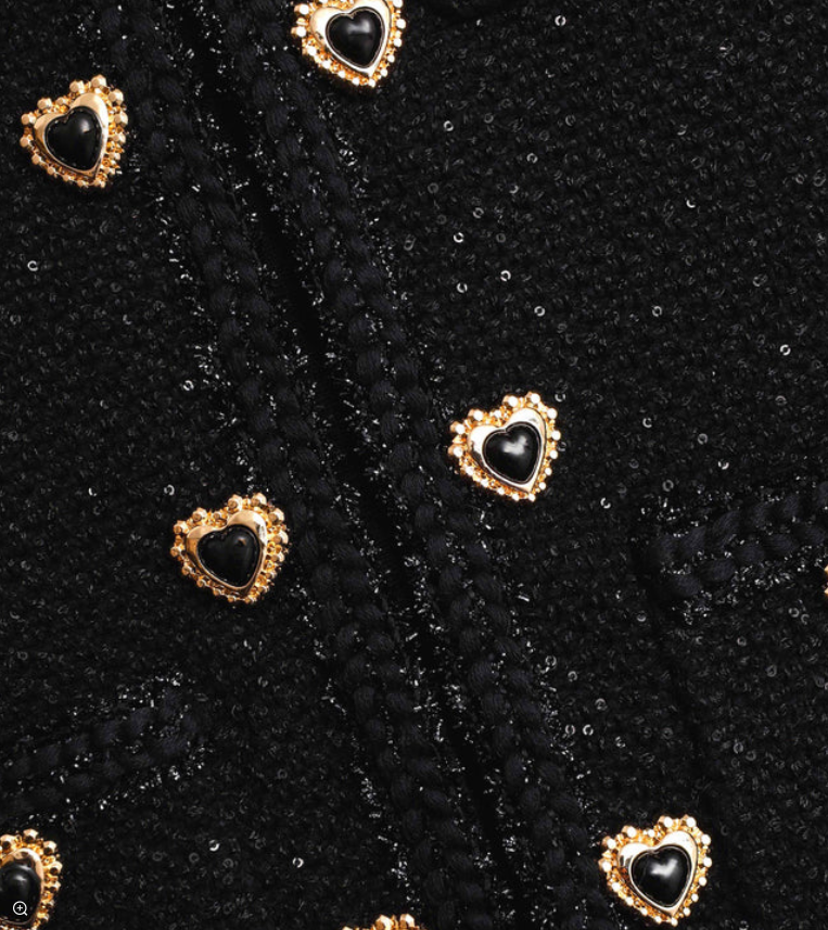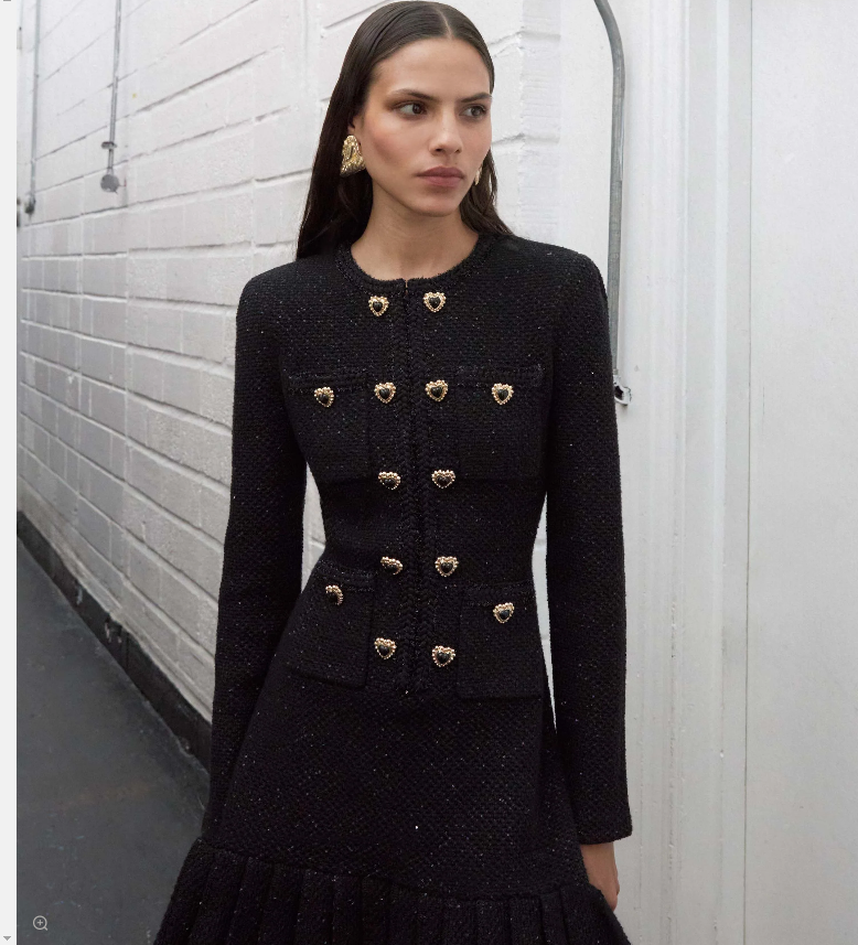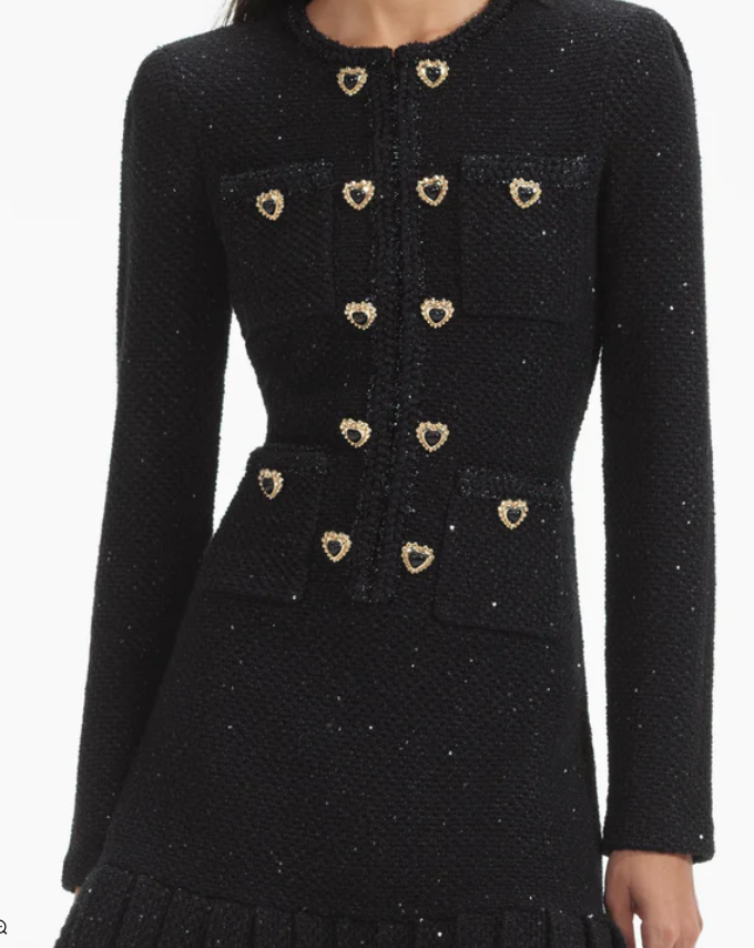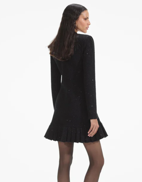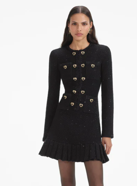 Shimmering in soft, sparkly sequinned knit, this LBD's heart-shaped buttons and pleated mini make it a frontrunner for date night dressing. Pair with our statement earrings and a glittering mini bag for additional shine.