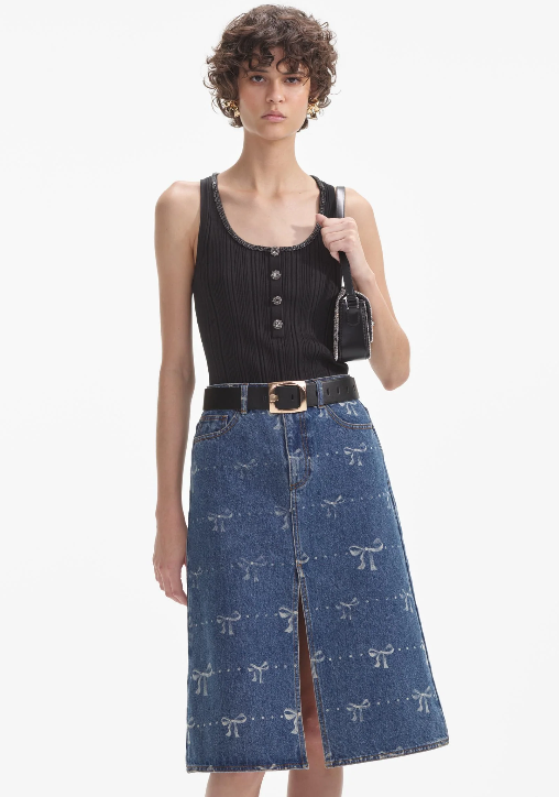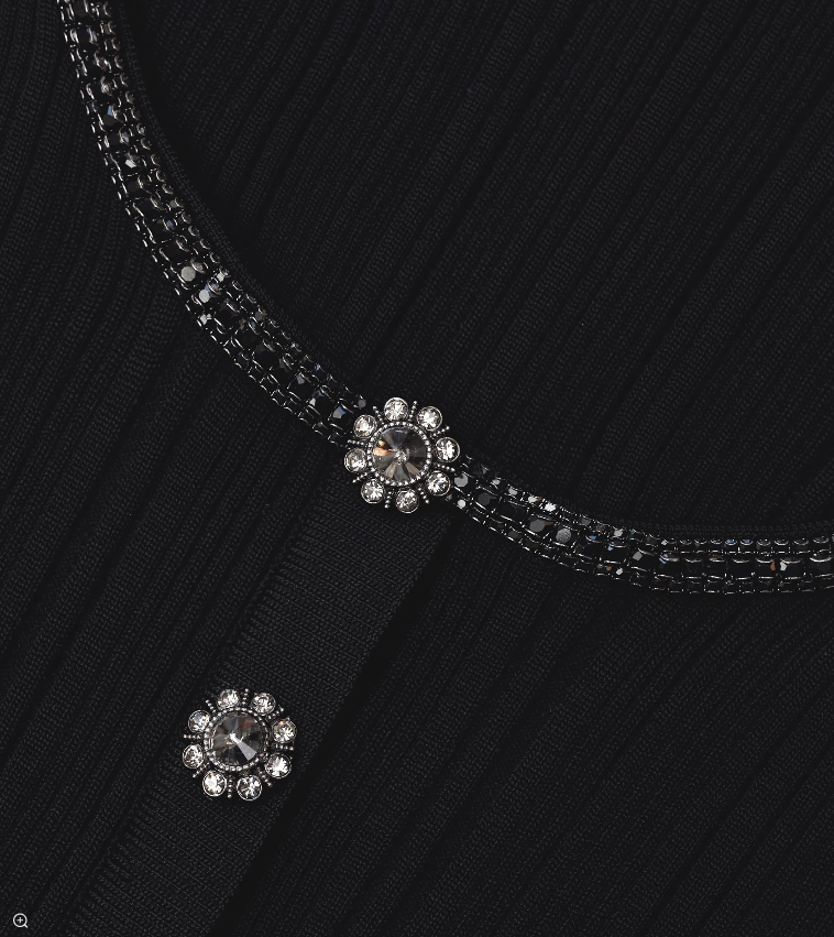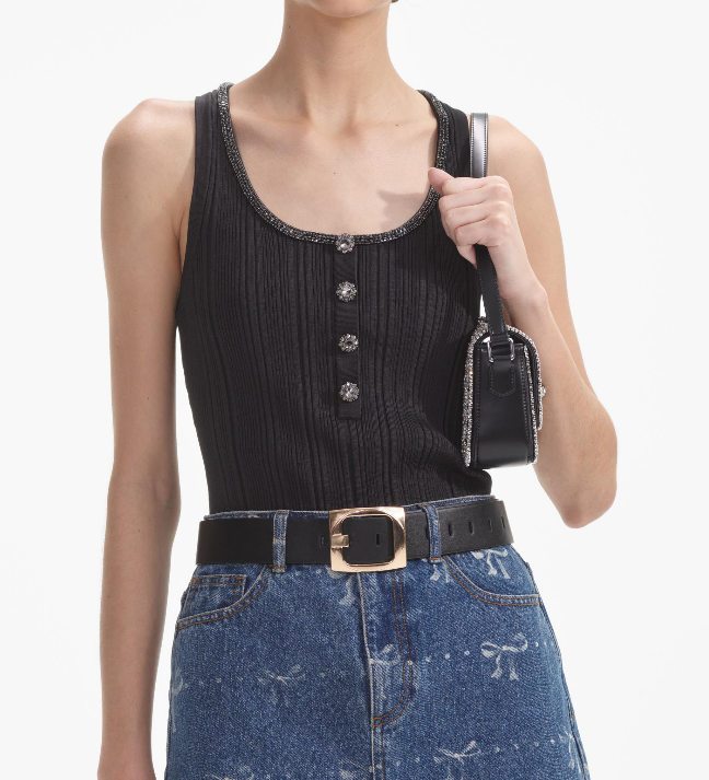 Cut from ribbed knit for a sculpted fit, this suits-all top will take you from work to cocktails and beyond. Accentuate its diamanté trim with our statement earrings and a sparkling Bow Bag.