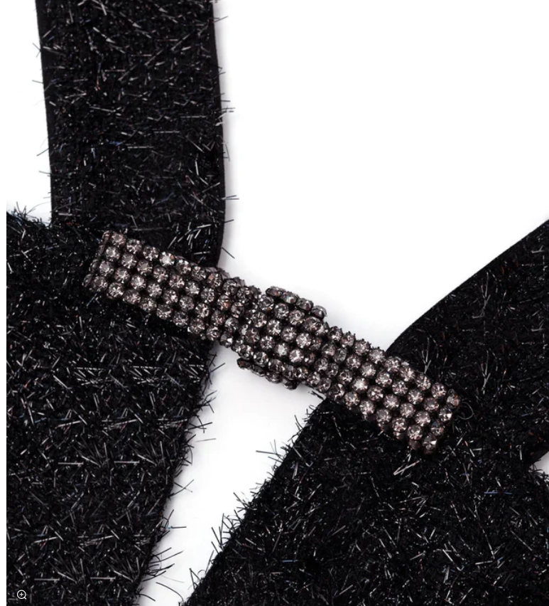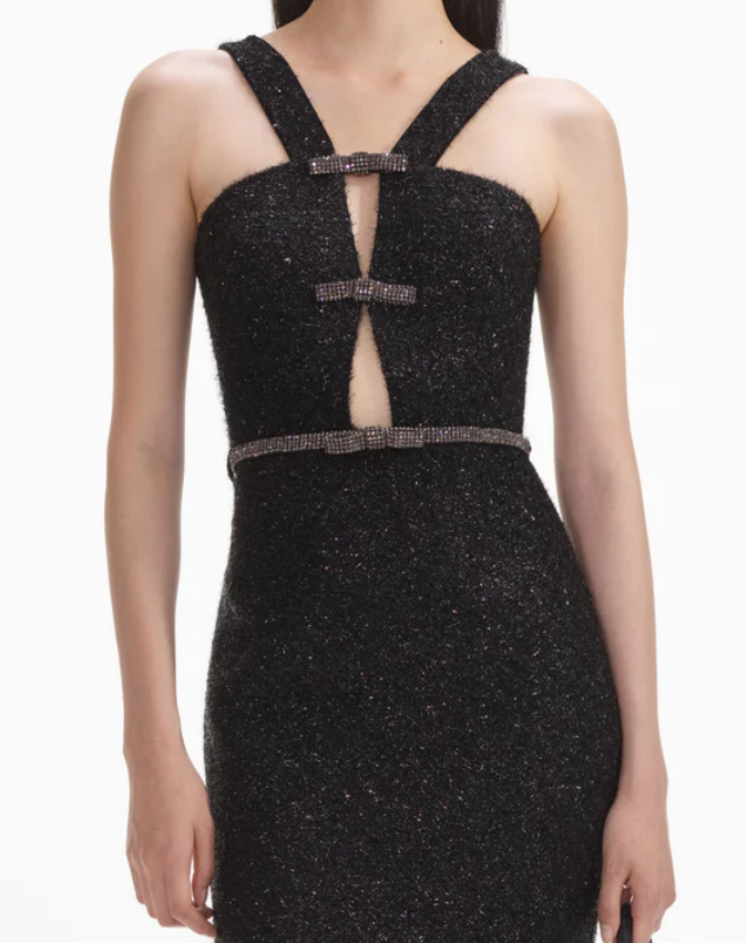 Artful diamanté and bow-topped cut-outs take centre stage on this dress, whilst tinsel bouclé gives it all-over shimmer. Style with our statement earrings and heels for red carpet glamour.