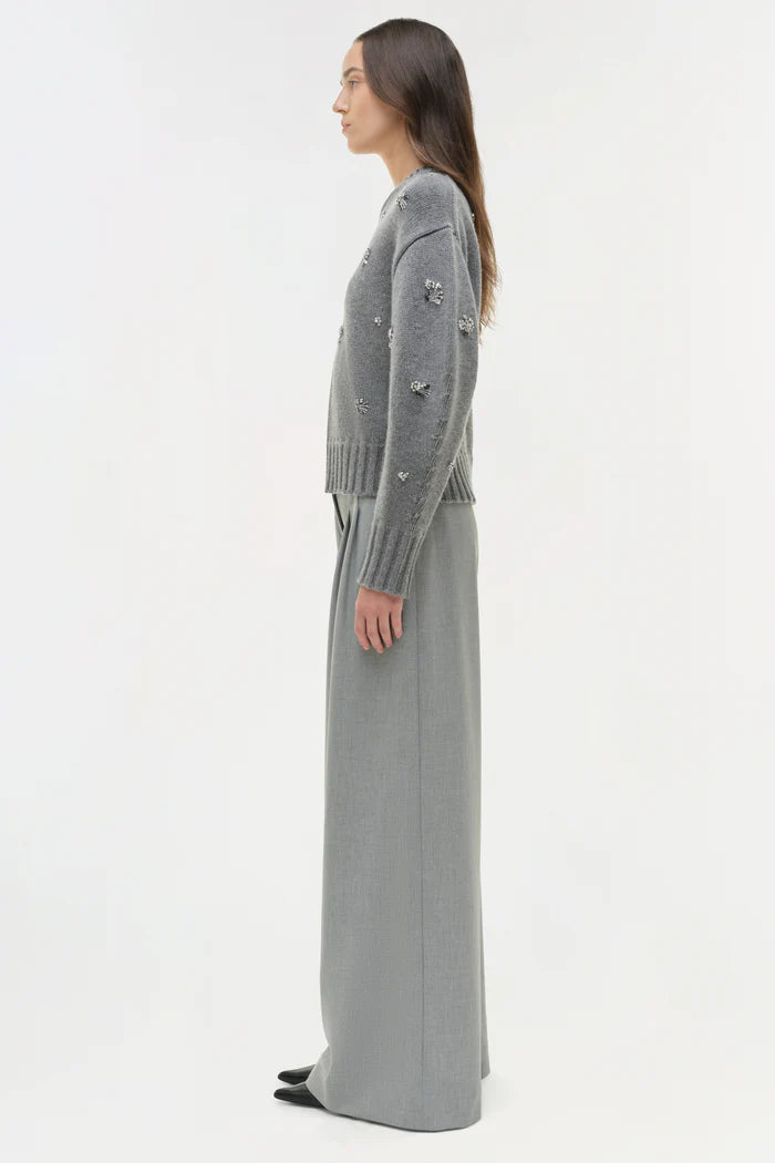 A classic crew neckline knit sweater updated with voluminous sleeves and allover crystal embellishments.