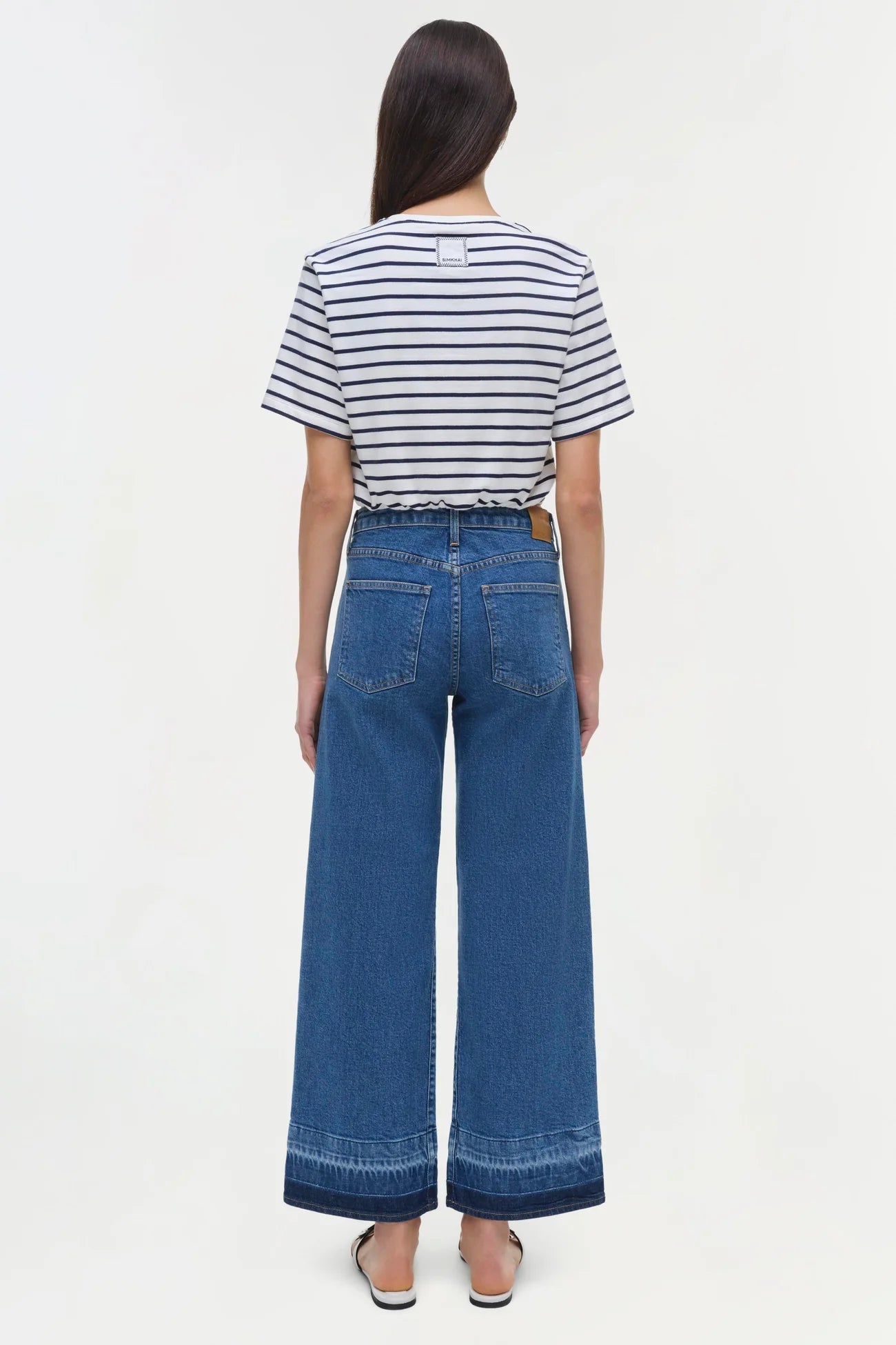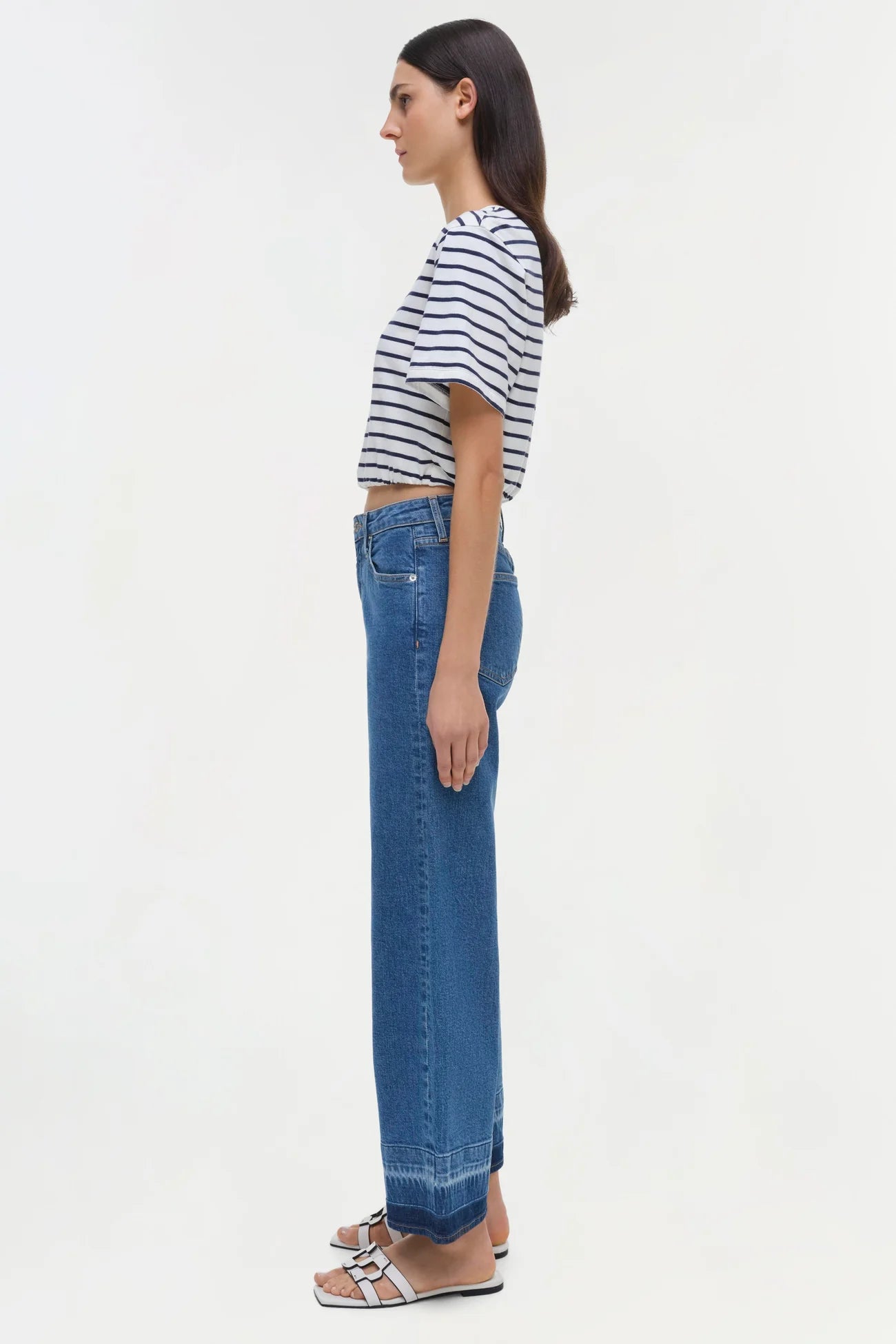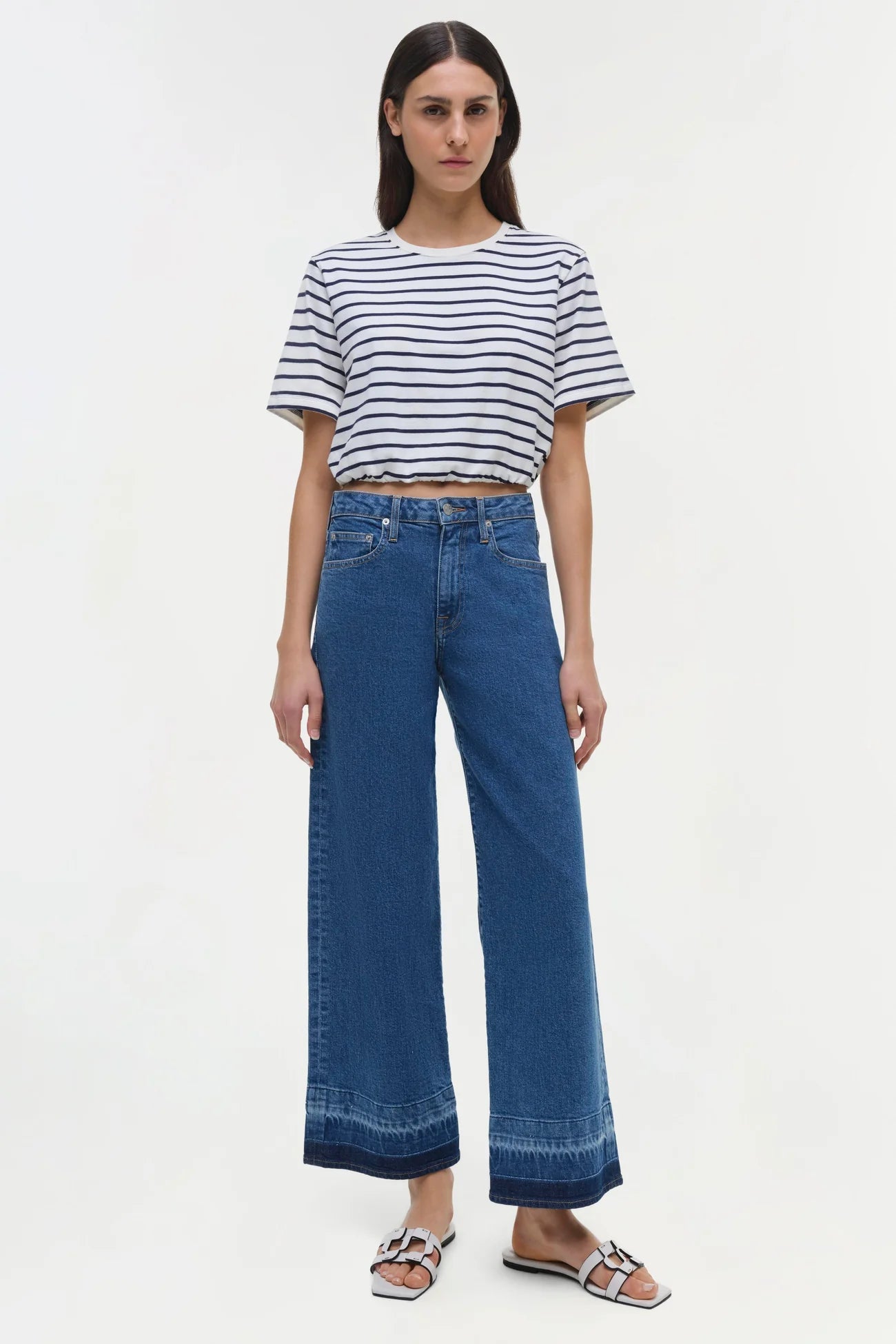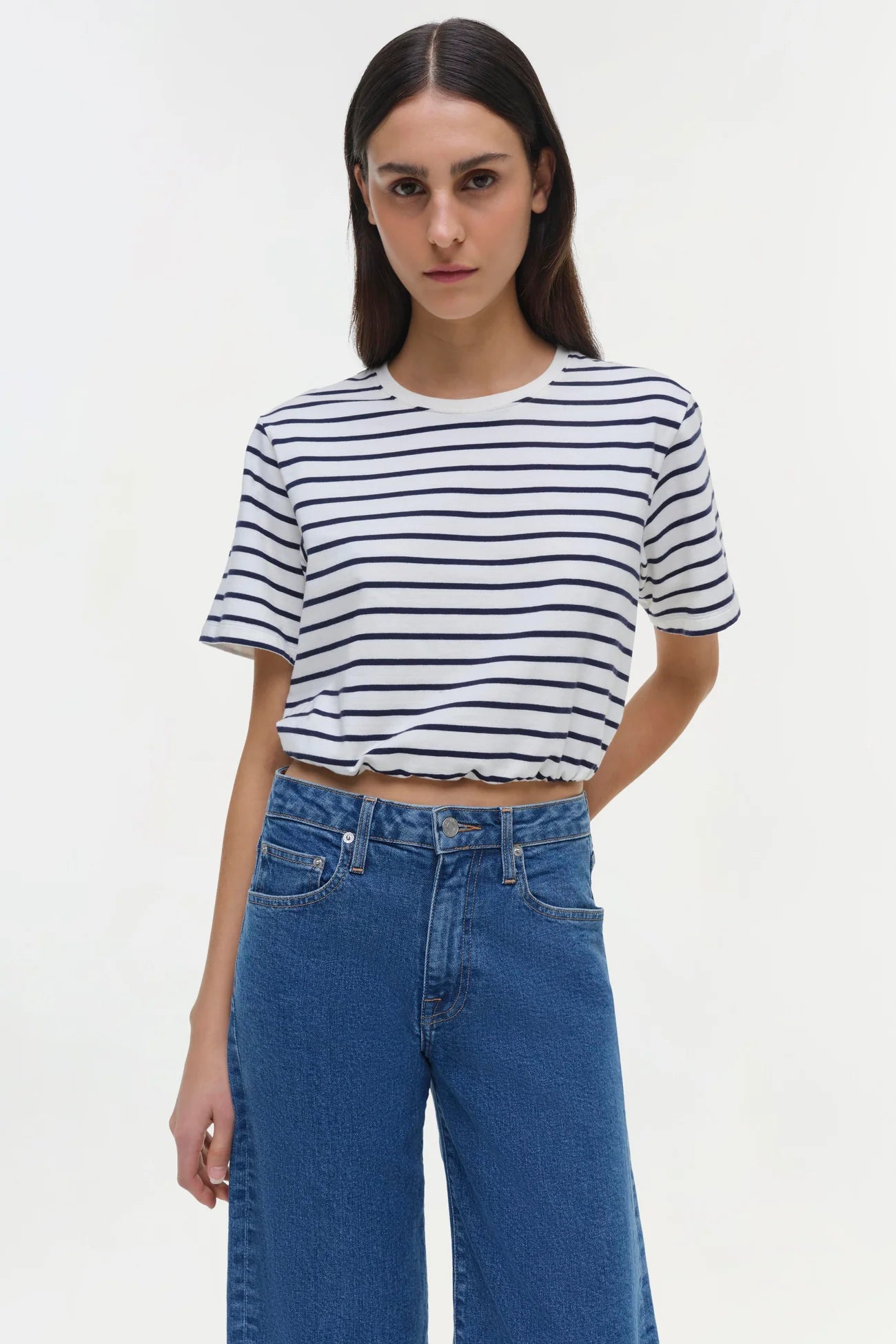 The Jojo T-Shirt in Midnight Stripe. This striped cropped top in soft jersey combines effortless comfort with a fresh, modern cut, making it an ideal go-to for relaxed, everyday style.
