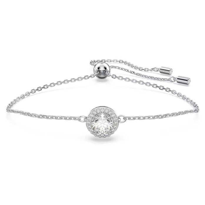 The beauty is in the simplicity of this soft bangle. Meticulously crafted, an eye-catching center stone is surrounded by shimmering pavé and set on a chic rhodium plated chain. Stack it with other pieces from the Constella family for a subtle statement.