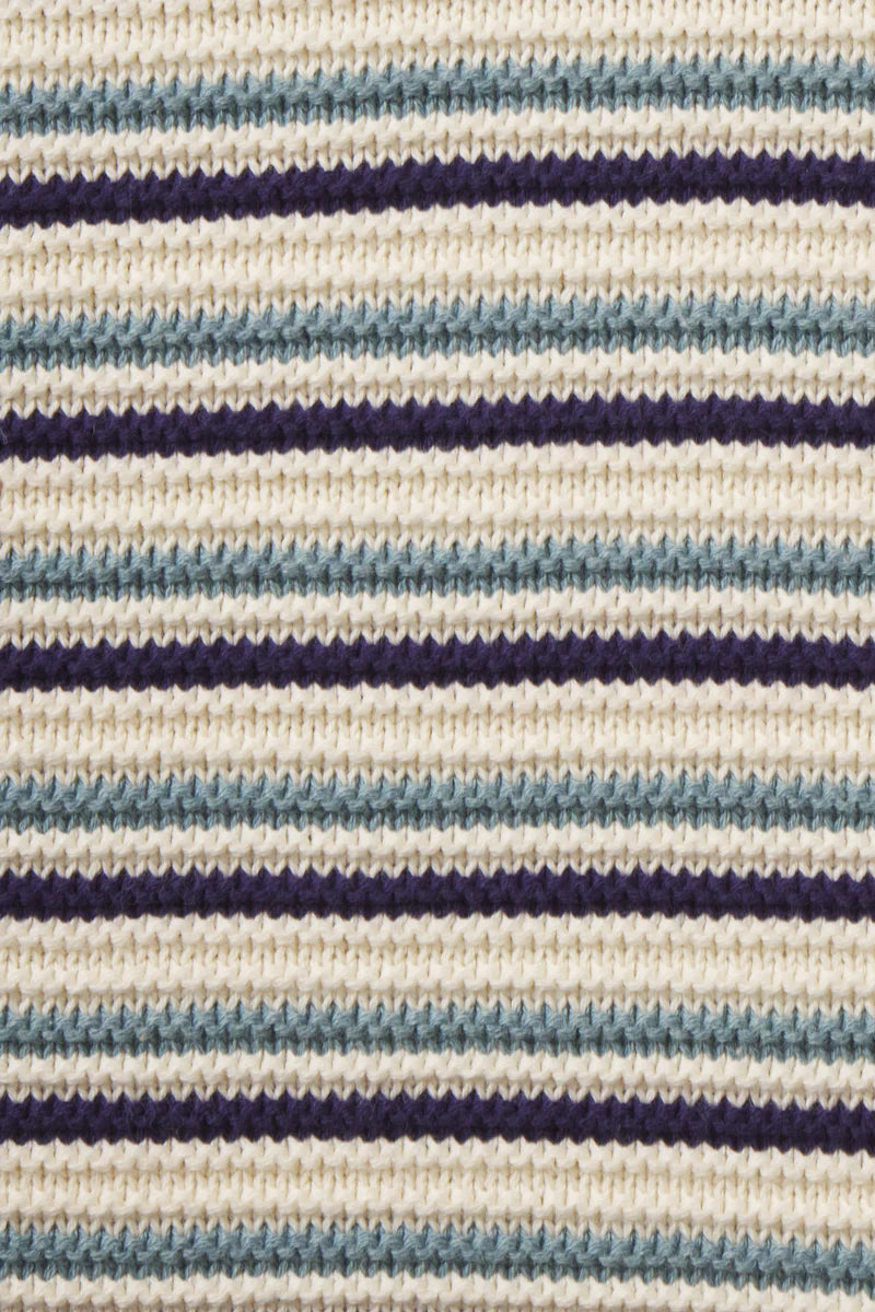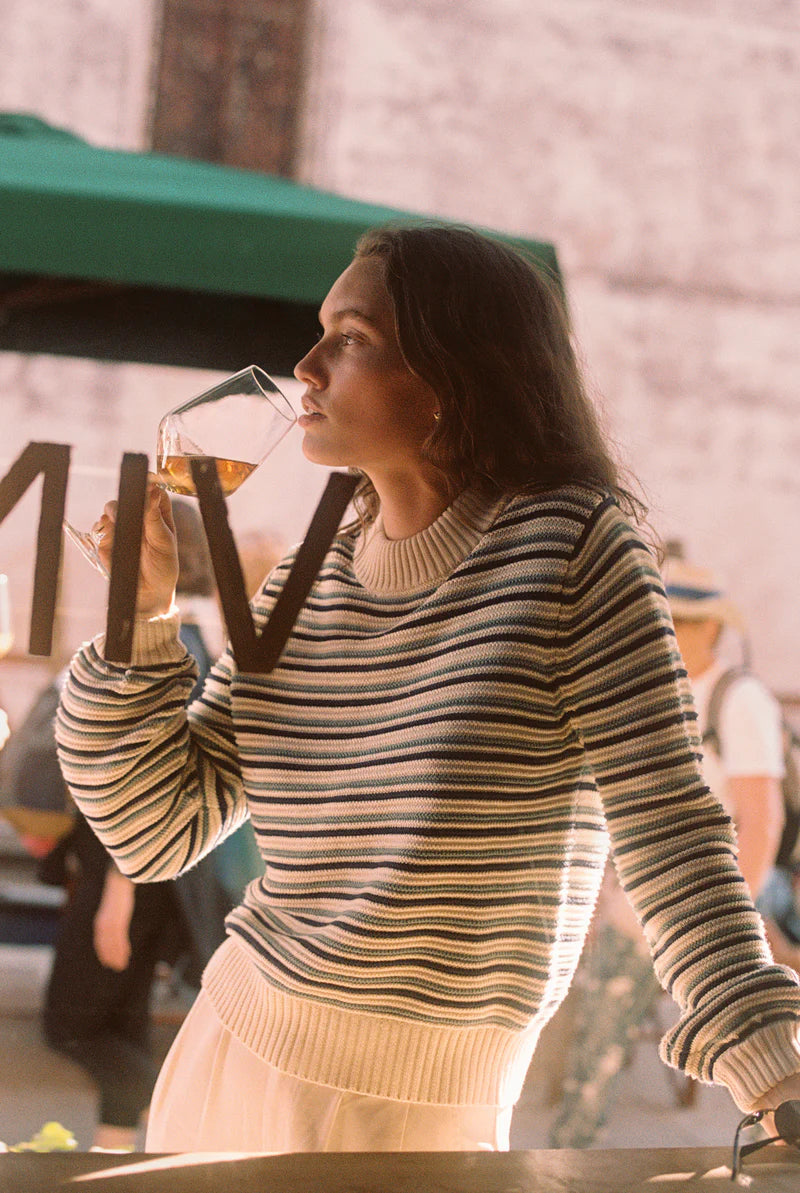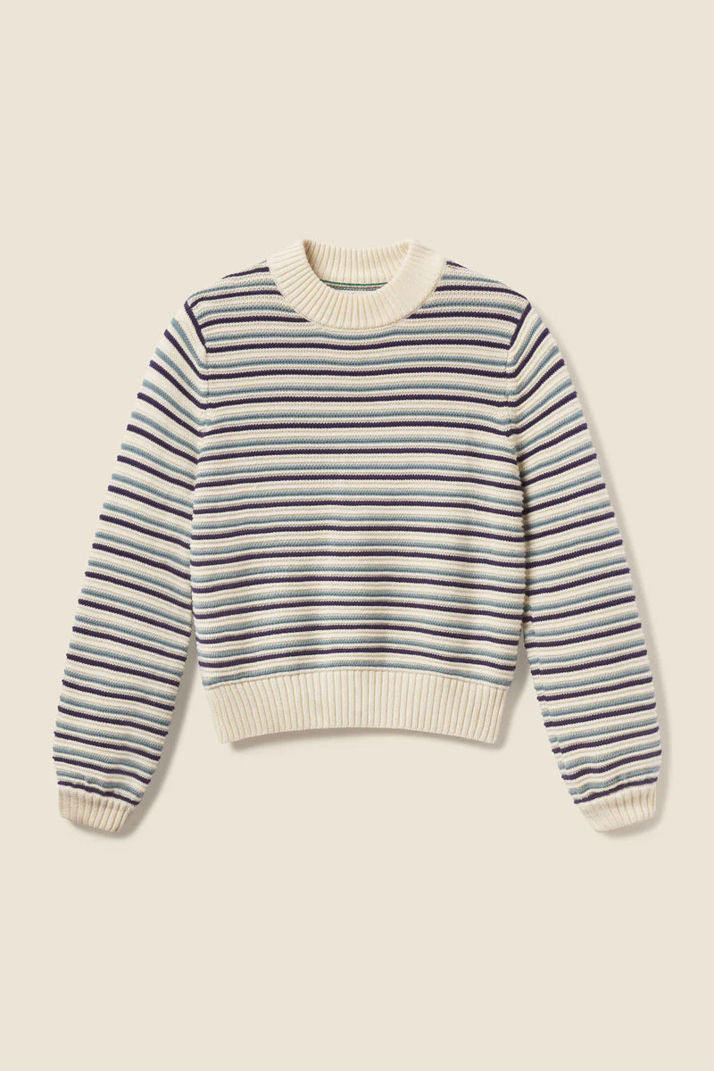 The Susan Sweater has standard body length, wide ribbed mock neck, cuffs and bottom band, subtle balloon sleeves. Our softest cotton yarns knitted in a textured micro-stripe in alternating blues and antique white. Shown here in Antique White With Navy and Green Stripe and made from our soft cotton."