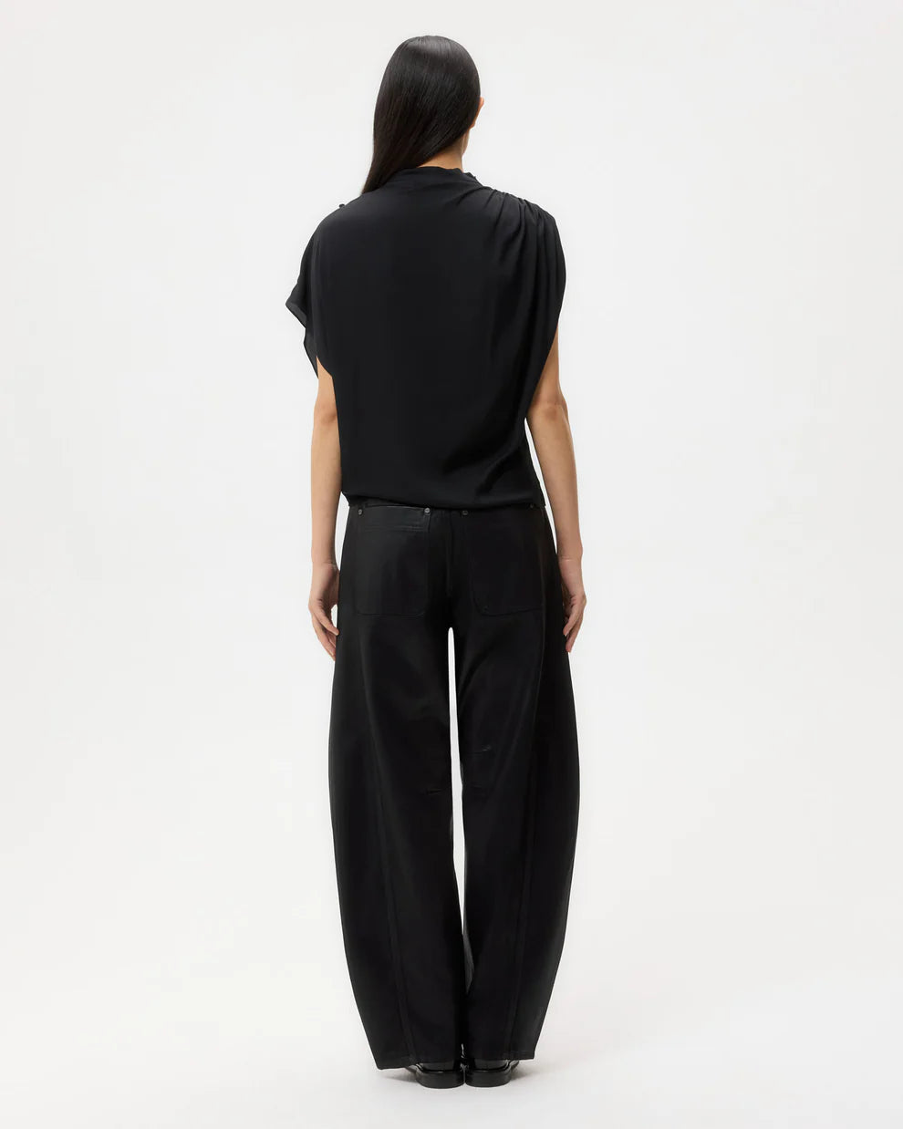 Mock neck, cap sleeved blouse draped in supple lamb leather finished on both sides. Loose fit, with a soft drape that skims the body. Complete with a placket trim on one shoulder and pleats on the other shoulder.
