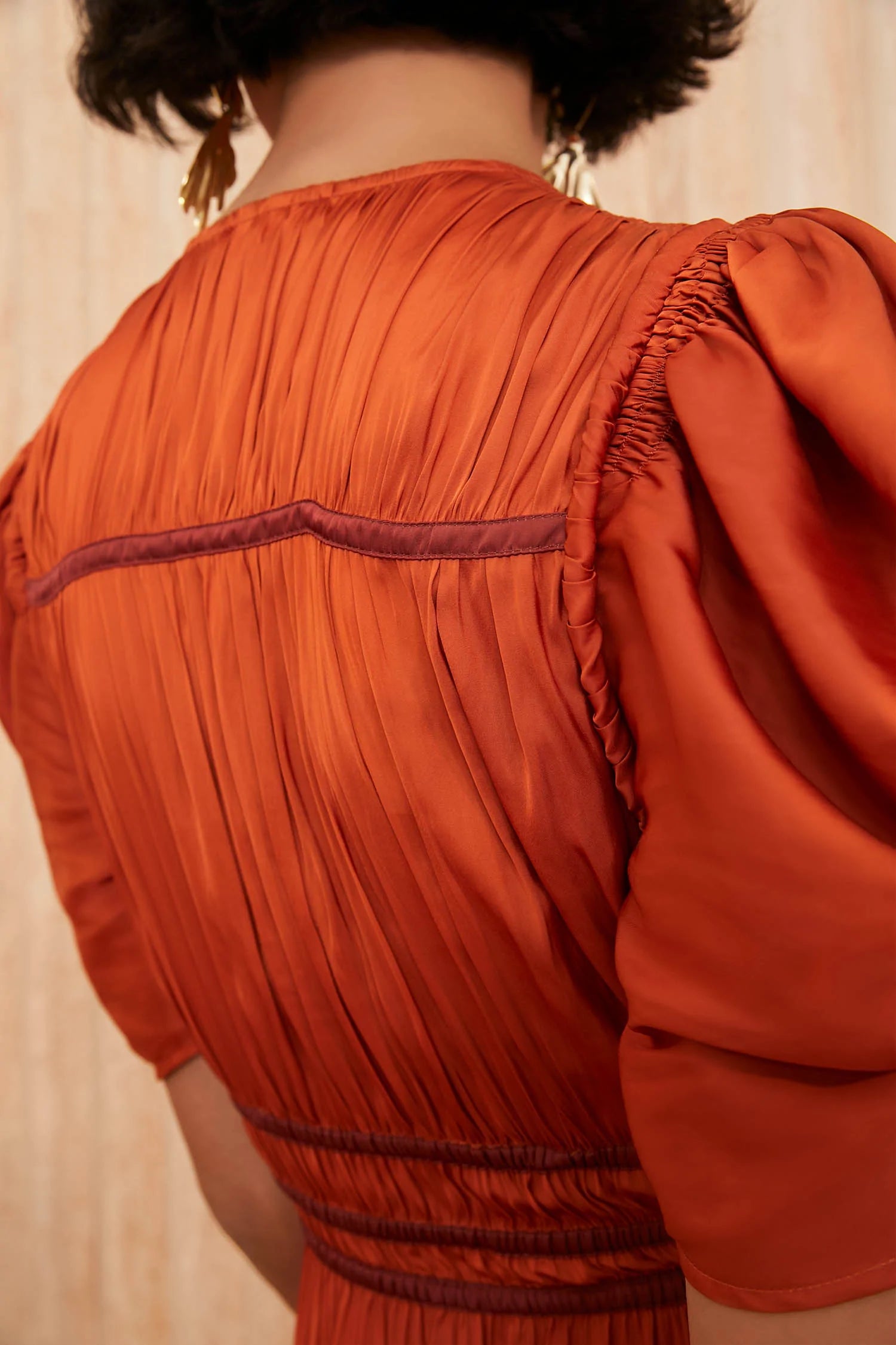 The Azaria plissé satin dress is cut in rust-hued Agate, which has an ombre effect at the hemline. This bell-sleeved minidress has a deep v-neckline, fixed waist, and tiered mini skirt. Flattering yet comfortable, this dress features eye-catching details throughout, such as tiny pintucks at the shoulder and drawstring ties at the waist. This dress is finished with a sideseam zipper.