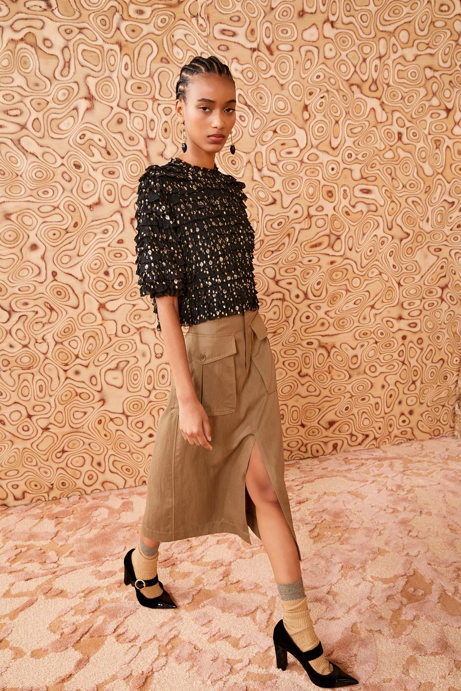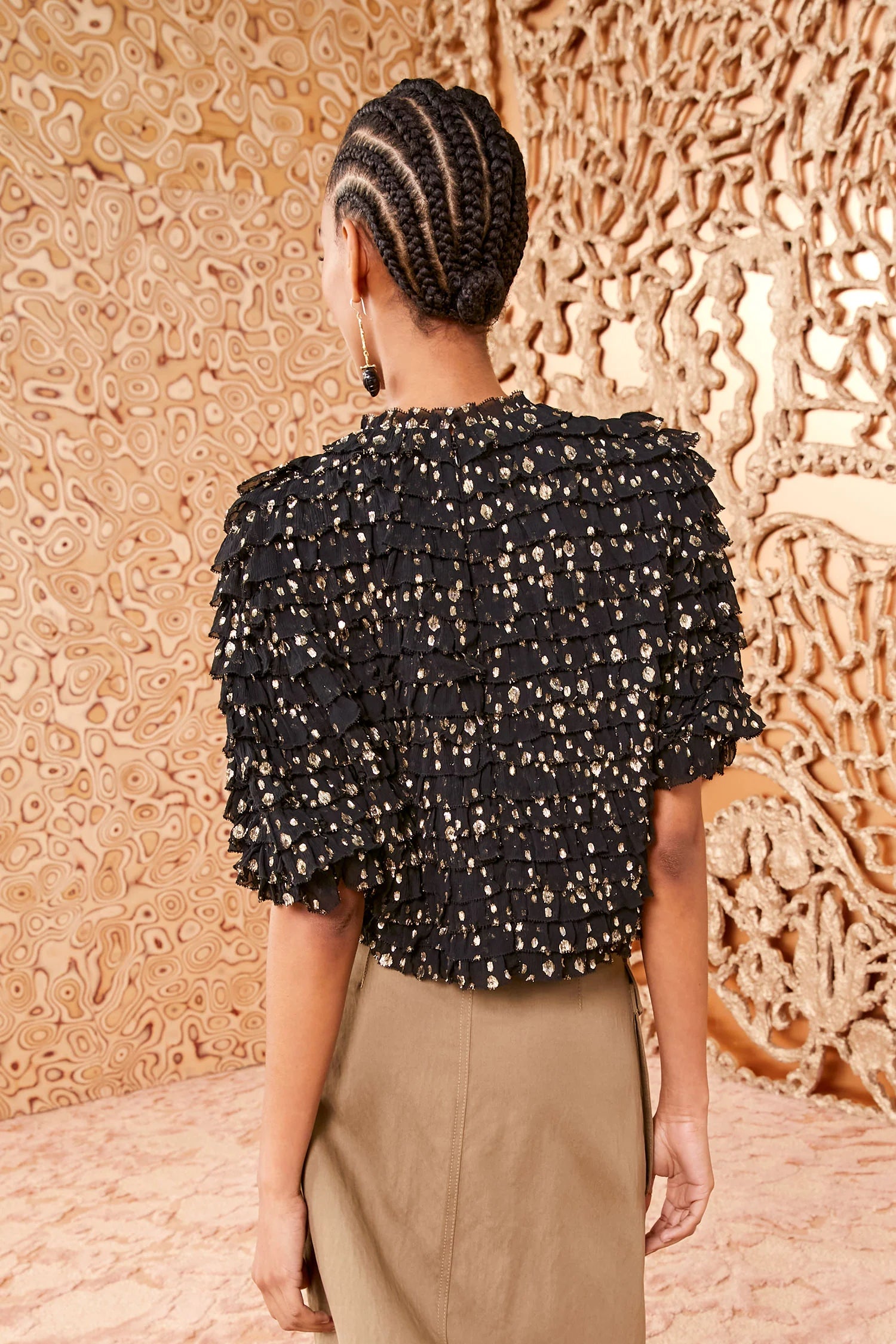 Visually stunning, our Carmella Blouse is made from crinkle chiffon that flickers with lurex dots woven into the fabric, bringing a shimmering touch to the classic black background. This short-sleeve style has a round neckline and a relaxed fit that’s exquisitely tiered and ruffled throughout. It fastens with a center-back zipper.