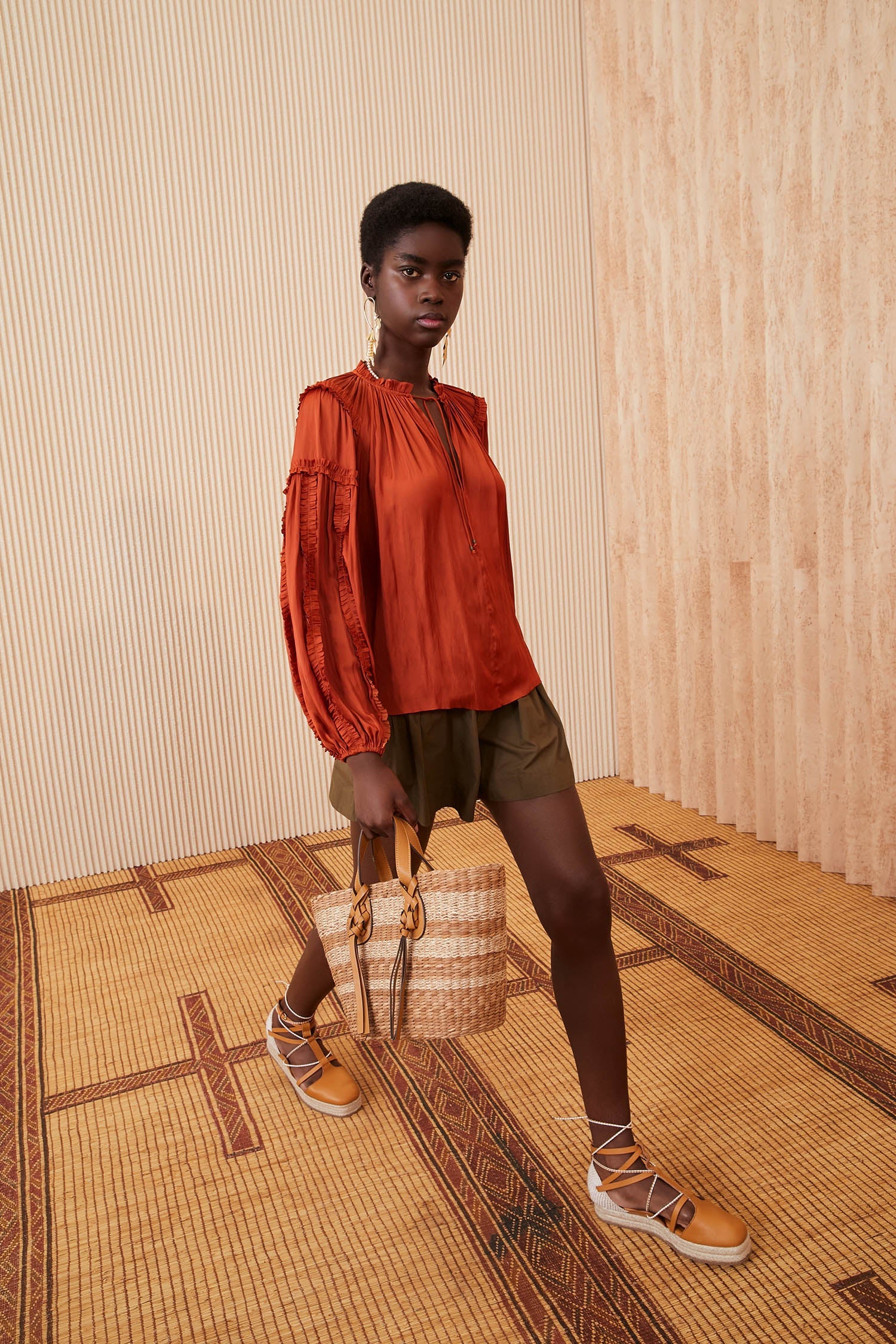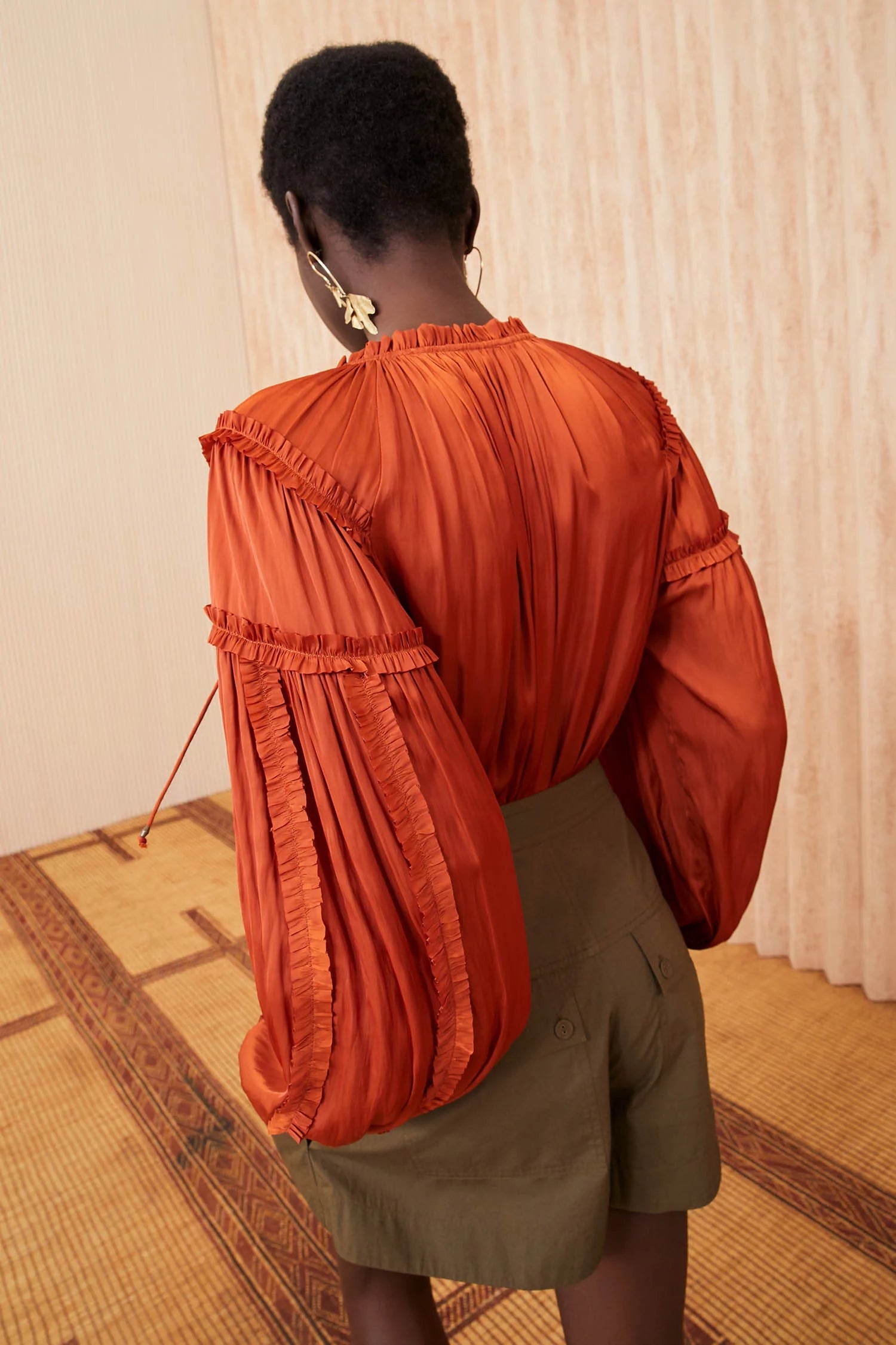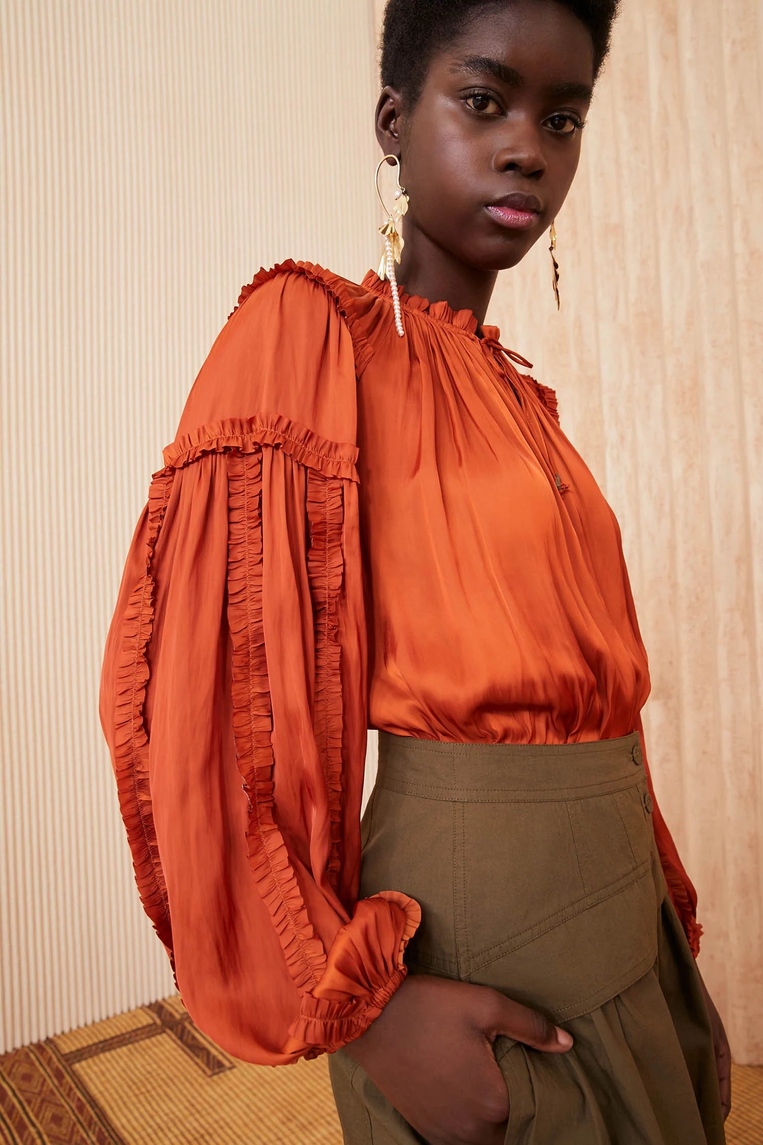 The Maeve Blouse, cut in our luxurious Clay plissé satin, is a signature Ulla Johnson silhouette. Adorned with double-edged ruffles along the sleeves and collar, this top features an open neckline with delicate tie closure.