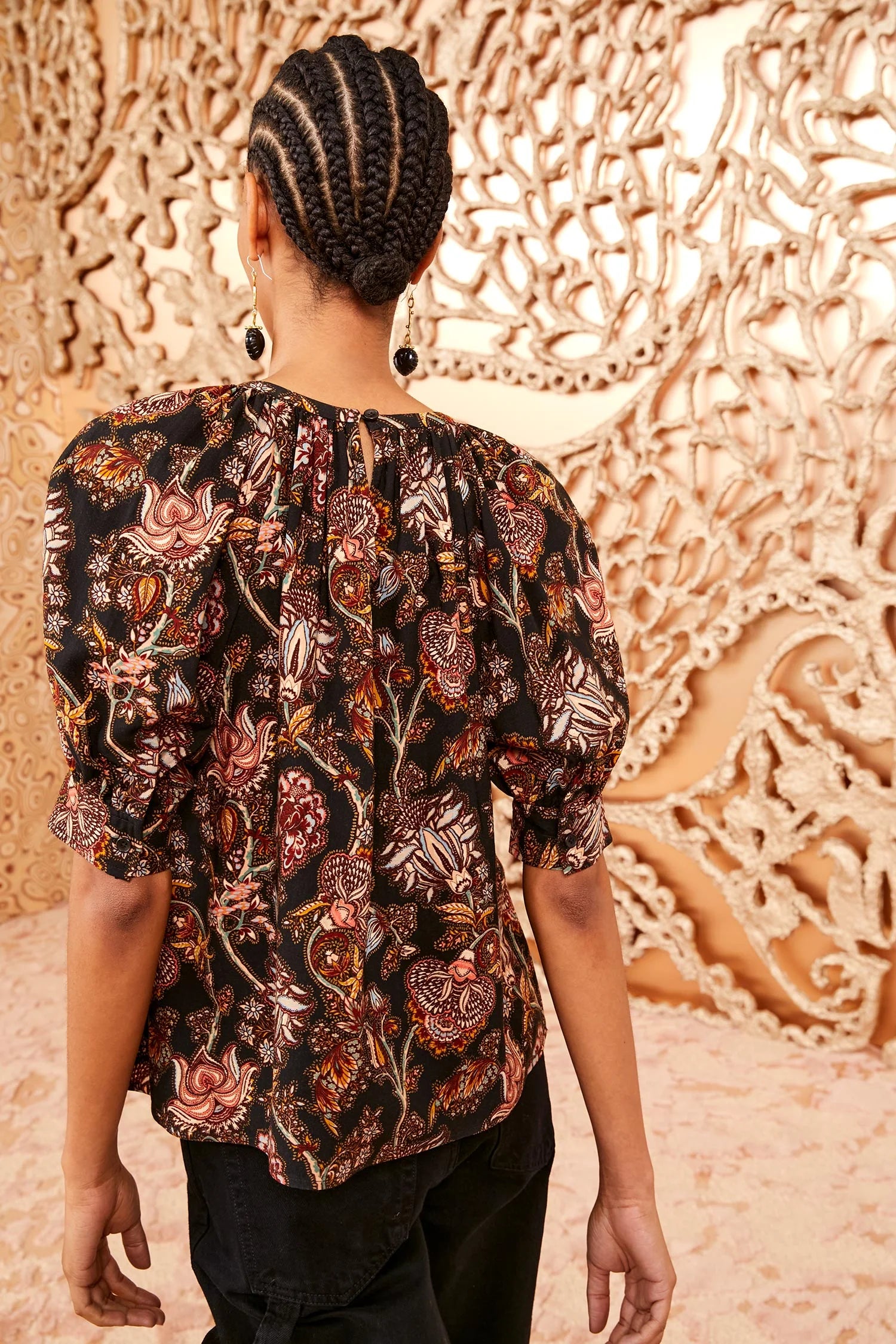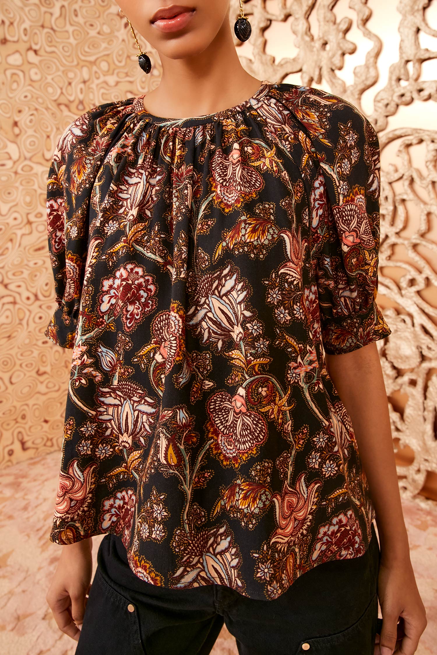 The Suri Top is awash in our seasonal paisley print, inspired by hand-painted motifs that are uniquely swirled and layered into unexpected dimensions. Tailored from wool twill with vivid hues against a black backdrop, it has a loose silhouette that’s lightly gathered and has short voluminous sleeves. Pair this beauty with our Valencia Pant for maximum impact.