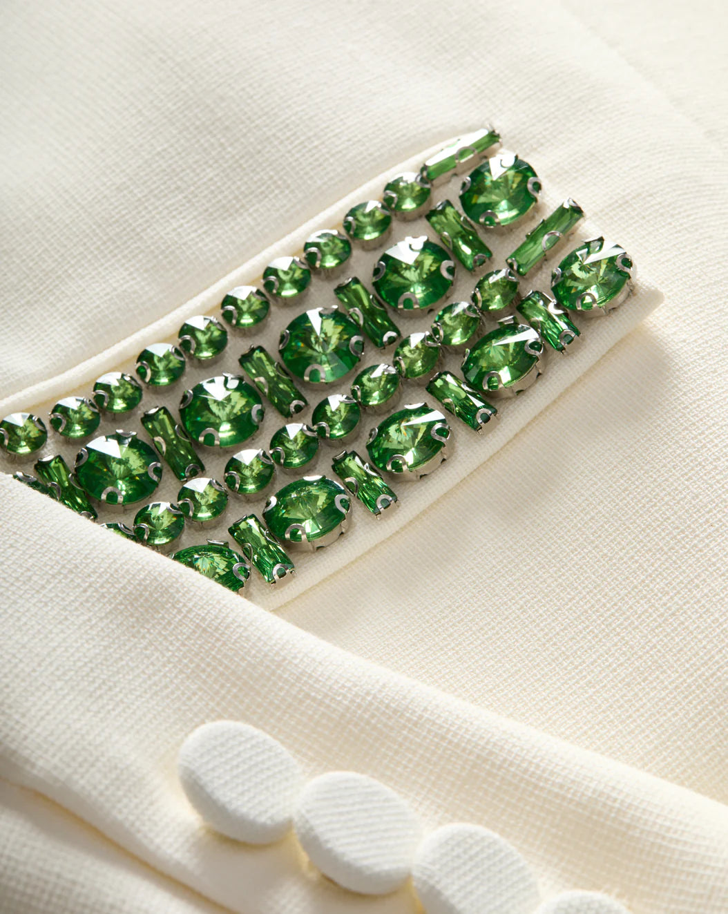 Cut from a premium stretch blend, the Imogen is a master class in precision tailoring. It features a white boxy cropped silhouette and glittering emerald rhinestones on the collar and pocket flaps. Wear with jeans to elevate the everyday or pair with the Sadie skirt for a chic matching set.