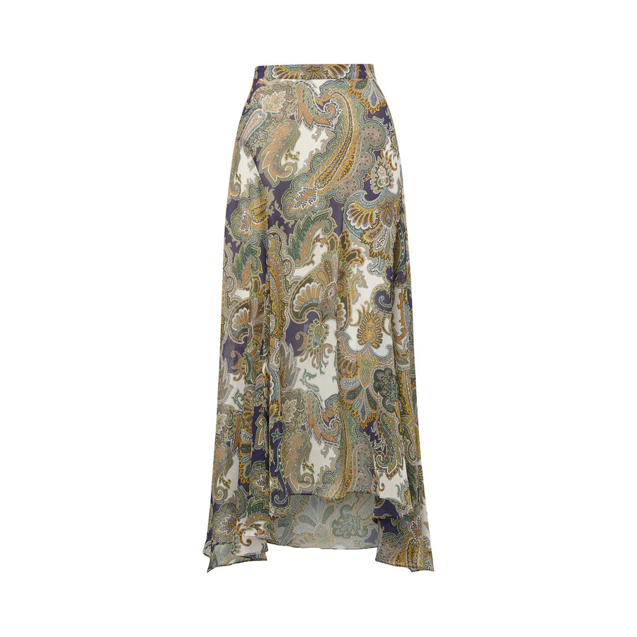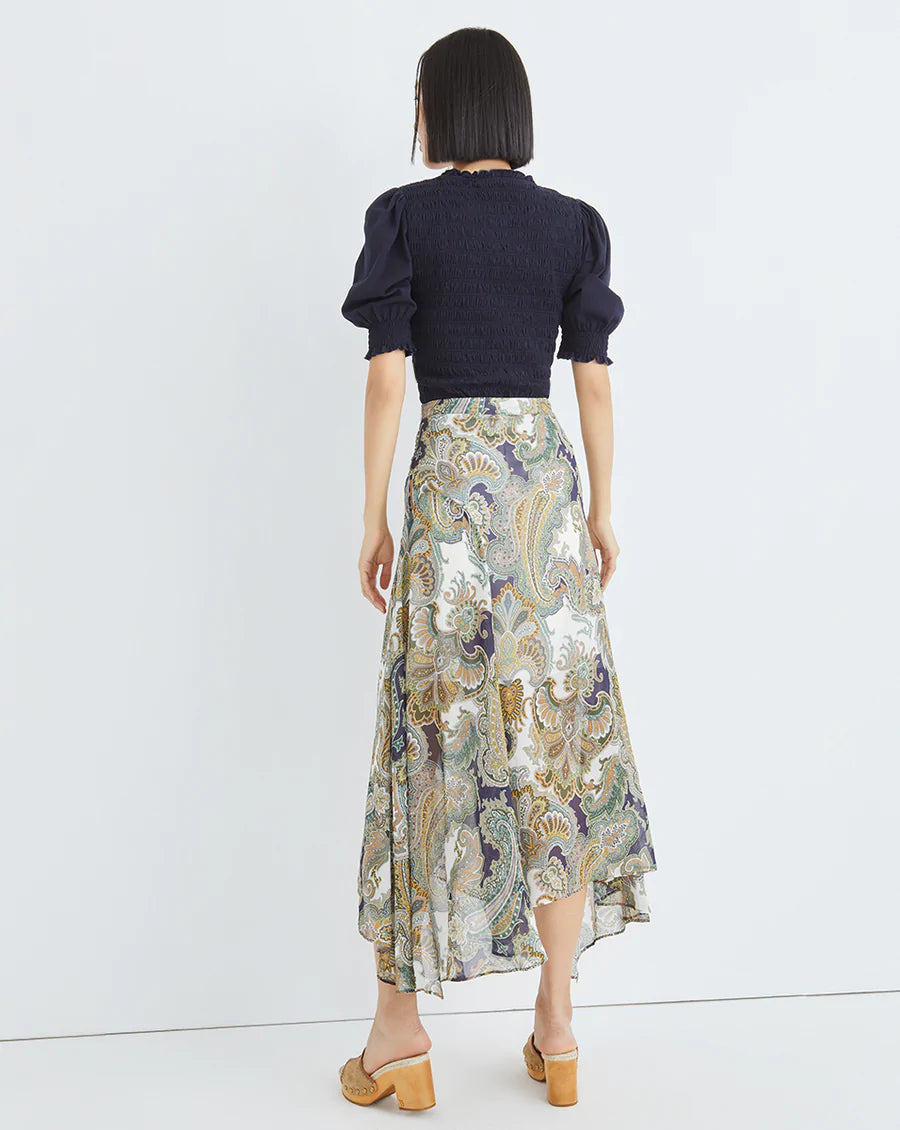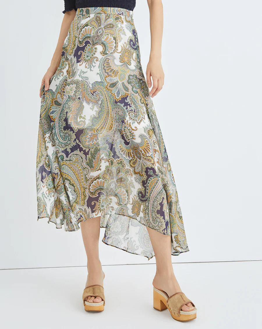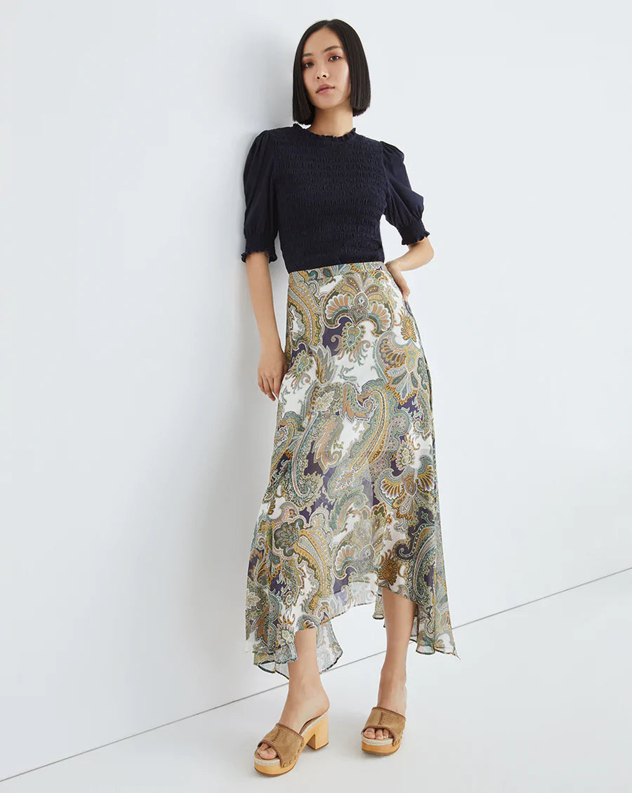 In our dimensional paisley print, this 100% silk skirt is as luxe as it gets. It’s layered, high-low hem gives it ease of movement and a fluid feel. We love pairing this style with everything from sweaters to tees; just add heels.