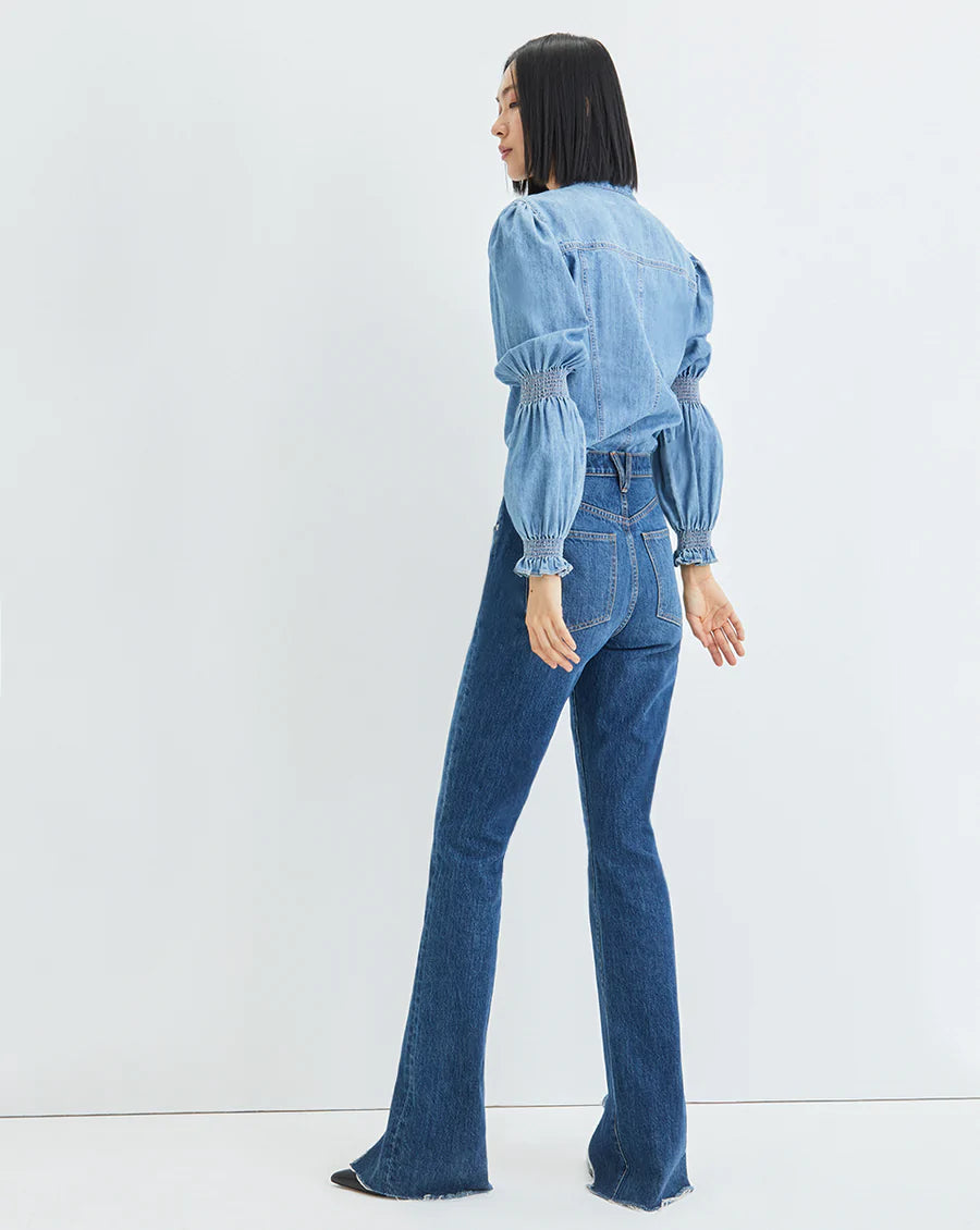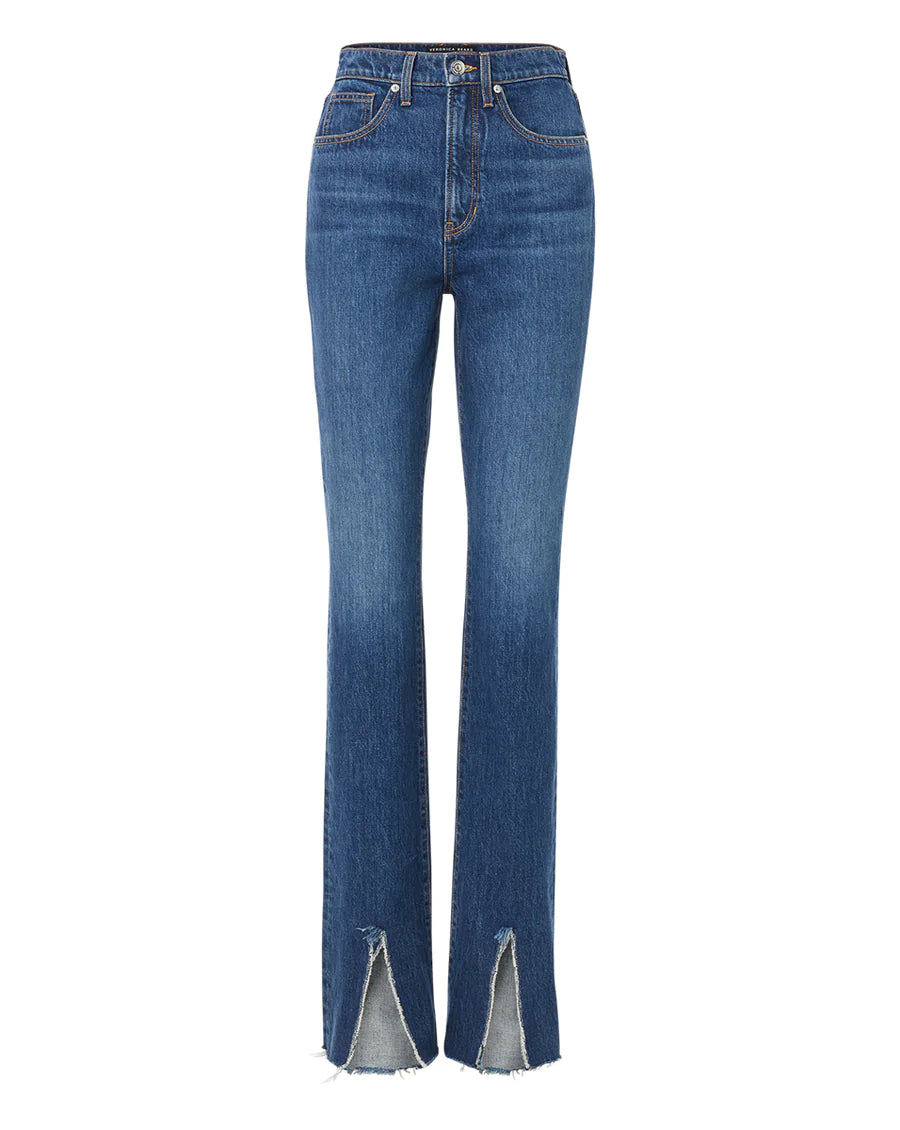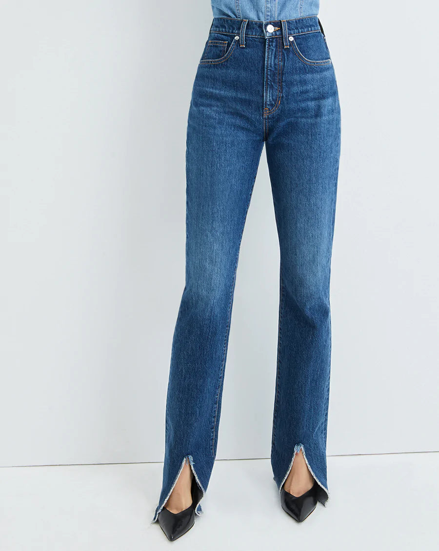 Front slits with raw hems define the look of our fashion-forward Keane jeans. In 100% cotton, this high-rise style lengthens the legs with its flattering cut. Wear with your favorite top and finish with a leather jacket for an exercise in chic.