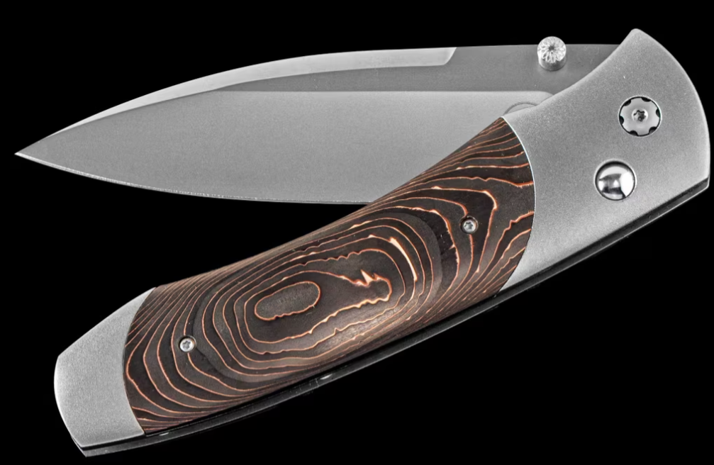 The A300-6 features a frame in hand-finished aerospace grade titanium, inlaid with 'Copper Swirl' carbon fiber. The blade is crafted from S35VN, a rugged stainless steel honed to a razor’s edge. Final touches include stainless steel fittings and a pocket clip that allows safe ‘tip-down’ carry.