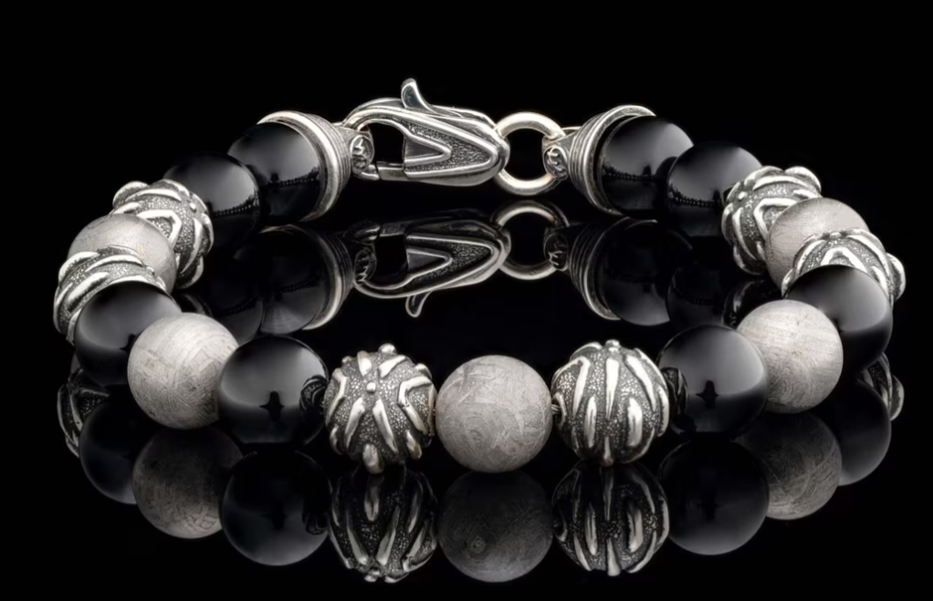 Lead into the unknown with the ‘Archeon’ beaded bracelet featuring 10mm ceramic coated Gibeon meteorite beads, sculptural patinated sterling silver accent beads, and polished black onyx beads that mirror the tranquil void of space.