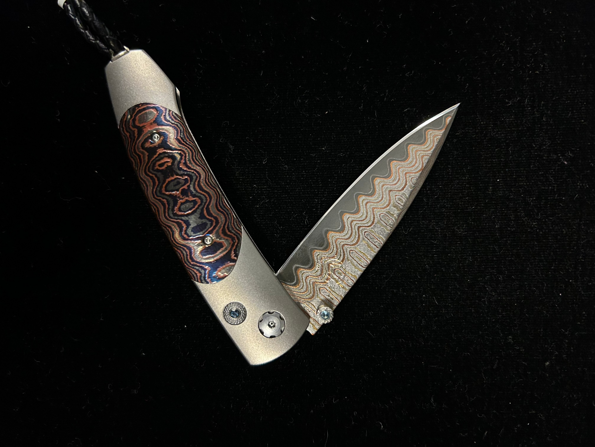 The Monarch 'Heat Wave' features a light and resilient frame which is machined from aerospace grade titanium, then finished with a fine blast-polishing. The unique inlay is crafted from heat-colored 'Wave Mokume'. The blade is crafted from the striking 'Copper Wave' damascus steel; with an extra strong core in VG-5. The one-hand button lock and the thumb stud are set with Kashmir blue topaz gemstones. The Monarch is a simple design that is easy on the eye and effortless in the hand; the elegant shape of the handle on this design is also an ideal canvas to showcase fine hand-engraving or exotic materials. The 'Heat Wave' features the rich and unique synthesis between function, exotic materials, and the superlative artistry that is the hallmark of William Henry's collection.