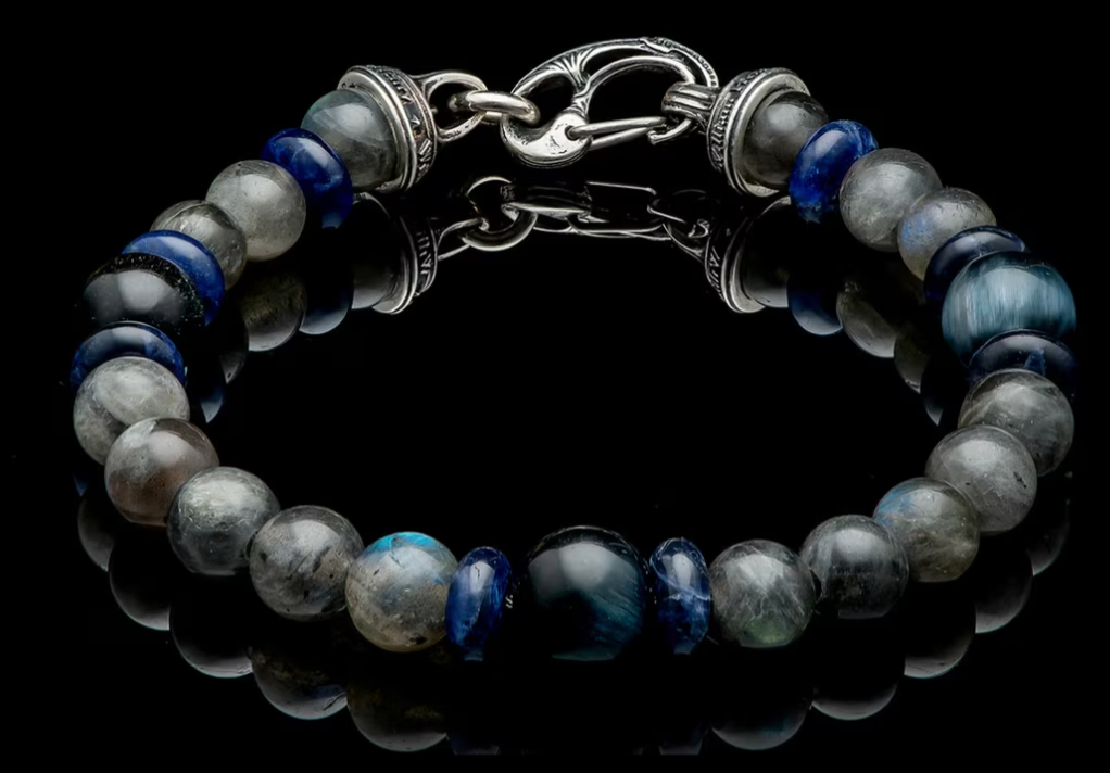 Let the blues reign! The Magician features a gorgeous palette of blues and greys, including labradorite and sodalite beads along with blue tiger eye. Crafted in our Oregon studio on aircraft grade stainless cable with welded sterling end caps and clasp, designed and built for generations. This bracelet is striking with a suit, with denim, and everything in between. Solo or stacked…there are only right answers.